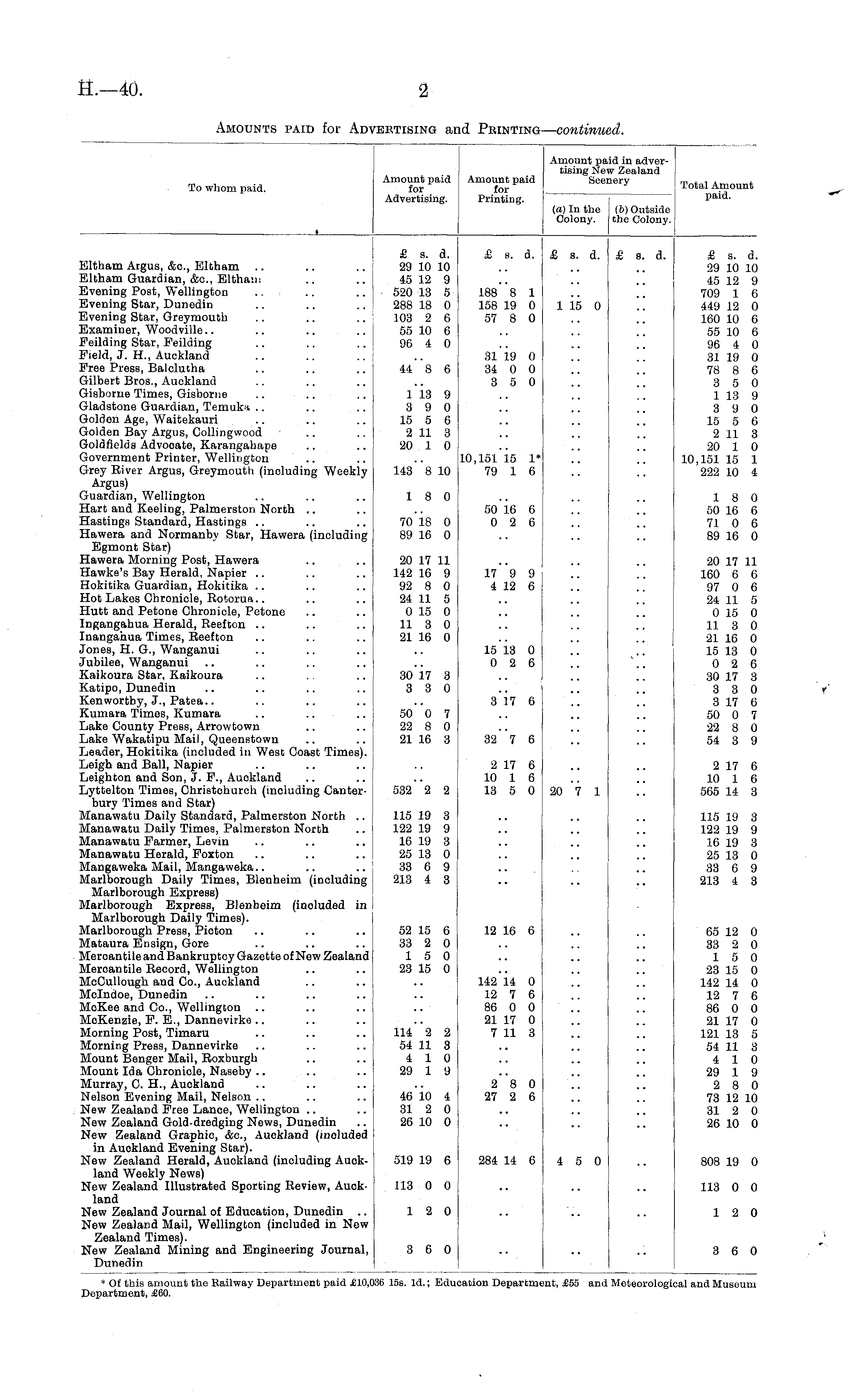 Amount paid in advertising New Zealand Scenery Total Amount paid. To whom paid. Amount paid for Advertising. Amount paid for Printing. (a) In the Colony. (b) Outside the Colony. Eltham Argus, &c, Eltham Eltham Guardian, &c, Elthaiu Evening Post, Wellington Evening Star, Dunedin Evening Star, Greymouth Examiner, Woodville.. Peilding Star, Peilding Field, J. H, Auckland Free Press, Balclutha Gilbert Bros., Auckland Gisborne Times, Gisborne Gladstone Guardian, Temuka Golden Age, Waitekauri Golden Bay Argus, Collingwood Goldfields Advooate, Karangahape Government Printer, Wellington Grey River Argus, Greymouth (including Weekly Argus) Guardian, Wellington Hart and Keeling, Palmerston North Hastings Standard, Hastings Hawera and Normanby Star, Hawera (including Egmont Star) Hawera Morning Post, Hawera Hawke's Bay Herald, Napier Hokitika Guardian, Hokitika Hot Lakes Chronicle, Rotorua.. Hutt and Petone Chronicle, Petone Ingangahua Herald, Reefton Inangahua Times, Reefton Jones, H. G., Wanganui Jubilee, Wanganui Kaikoura Star, Kaikoura Katipo, Dunedin Kenworthy, J., Patea.. Kumara Times, Kumara Lake County Press, Arrowtown Lake Wakatipu Mail, Queenstown Leader, Hokitika (included in West Coast Times). Leigh and Ball, Napier Leighton and Son, J. F, Auckland Lyttelton Times, Ohristohurch (inoluding Canterbury Times and Star) Manawatu Daily Standard, Palmerston North .. Manawatu Daily Times, Palmerston North Manawatu Parmer, Levin Manawatu Herald, Foxton Mangaweka Mail, Mangaweka Marlborough Daily Times, Blenheim (including Marlborough Express) Marlborough Express, Blenheim (included in Marlborough Daily Times). Marlborough Press, Picton Mataura Ensign, Gore Mercantile and Bankruptcy Gazette of New Zealand Mercantile Reoord, Wellington McCullough and Co., Auckland Mclndoe, Dunedin McKee and Co, Wellington McKenzie, P. E, Dannevirke .. Morning Post, Timaru Morning Press, Dannevirke Mount Benger Mail, Roxburgh Mount Ida Chronicle, Naseby Murray, C. H, Auckland Nelson Evening Mail, Nelson New Zealand Free Lance, Wellington New Zealand Gold-dredging News, Dunedin New Zealand Graphic, &c, Auckland (inoluded in Auokland Evening Star). New Zealand Herald, Auckland (including Auckland Weekly News) New Zealand Illustrated Sporting Review, Auckland New Zealand Journal of Education, Dunedin .. New Zealand Mail, Wellington (included in New Zealand Times). New Zealand Mining and Engineering Journal, Dunedin £ s. d. 29 10 10 45 12 9 520 13 5 288 18 0 103 2 6 55 10 6 96 4 0 44 8 6 £ s. d. 188 8 1 158 19 0 57 8 0 31 19 0 34 0 0 3 5 0 £ s. d. 1 15 0 £ s. d. £ s. d. 29 10 10 45 12 9 709 1 6 449 12 0 160 10 6 55 10 6 96 4 0 31 19 0 78 8 6 3 5 0 1 13 9 3 9 0 15 5 6 2 11 3 20 1 0 10,151 15 1 222 10 4 1 13 9 3 9 0 15 5 6 2 11 3 20 1 0 143"8 10 10,151 15 1* 79 1 6 18 0 7o'l8 0 89 16 0 5016 6 0 2 6 1 8 0 50 16 6 71 0 6 89 16 0 20 17 11 142 16 9 92 8 0 24 11 5 0 15 0 11 3 0 21 16 0 17 9 9 4 12 6 15 13 0 0 2 6 20 17 11 160 6 6 97 0 6 24 11 5 0 15 0 11 3 0 21 16 0 15 13 0 0 2 6 30 17 3 3 3 0 3 17 6 50 0 7 22 8 0 54 3 9 30 17 3 3 3 0 50 0 7 22 8 0 21 16 3 317 6 32"7 6 532"2 2 2 17 6 10 1 6 13 5 0 20 7 1 2 17 6 10 1 6 565 14 3 115 19 3 122 19 9 16 19 3 25 13 0 33 6 9 213 4 3 115 19 3 122 19 9 16 19 3 25 13 0 33 6 9 213 4 3 52 15 6 33 2 0 15 0 23 15 0 114 2 2 54 11 3 4 10 29 1 9 12 16 6 142 14 0 12 7 6 86 0 0 21 17 0 7 11 3 65 12 0 33 2 0 15 0 23 15 0 142 14 0 12 7 6 86 0 0 21 17 0 121 13 5 54 11 3 4 10 29 1 9 2 8 0 73 12 10 31 2 0 26 10 0 46 10 4 31 2 0 26 10 0 2 - 8 0 27 2 6 519 19 6 284 14 6 4 5 0 808 19 0 113 0 0 113 0 0 12 0 12 0 3 6 0 3 6 0 * Of this amount the Railway Department paid £10,1 Department, £60. )6 15s. Id.; Edui lation Department, £55 and Meteorological and Museum