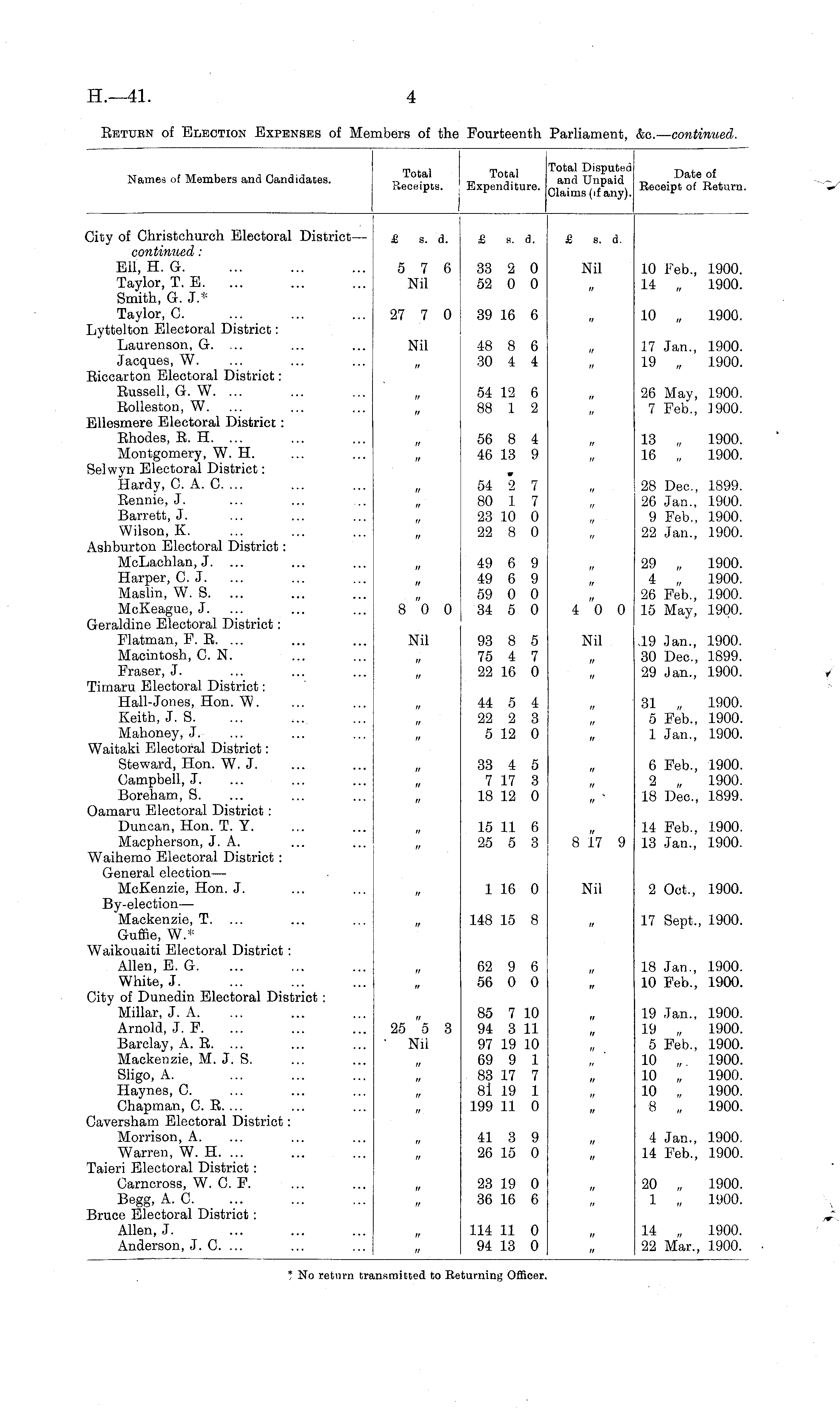 Names of Members and Candidates. Total Receipts. Total Expenditure. Total Disputed and Unpaid Claims (if any). Date of Receipt of Return City of Christchurch Electoral District— continued: Ell, H. G Taylor, T. E. ... Smith, G. J.* Taylor, C. Lyttelton Electoral District: Laurenson, G. ... Jacques, W. Biccarton Electoral District: Eussell, G. W. ... Eolleston, W. ... Ellesmere Electoral District: Ehodes, E. H. ... Montgomery, W. H. Selwyn Electoral District: Hardy, C. A. C. ... Eennie, J. Barrett, J. Wilson, K. Ashburton Electoral District: McLachlan, J. ... Harper, C. J. Maslin, W. S. ... McKeague, J. Geraldine Electoral District: Flatman, F. E. ... Macintosh, C. N. Fraser, J. Timaru Electoral District: Hall-Jones, Hon. W. Keith, J. S. Mahoney, J. Waitaki Electoral District: Steward, Hon. W. J. Campbell, J. Boreham, S. Oamaru Electoral District: Duncan, Hon. T. Y. Macpherson, J. A. Waihemo Electoral District : General election— McKenzie, Hon. J. By-election — Mackenzie, T. Guffie, W.* Waikouaiti Electoral District: Allen, E. G. White, J. City of Dunedin Electoral District: Millar, J. A. Arnold, J. F. Barclay, A. B. ... Mackenzie, M. J. S. Sligo, A. Haynes, C. Chapman, C. E. ... Caversham Electoral District: Morrison, A. Warren, W. H. ... Taieri Electoral District : Carncross, W. C. F. Begg, A. C Bruce Electoral District : Allen, J. Anderson, J. C. ... £ s. d. 5 7 6 Nil 27 7 0 Nil If It ft ft ft ft 8 "o 0 Nil ft ft ft It £ s. d. 33 2 0 52 0 0 39 16 6 48 8 6 30 4 4 54 12 6 88 1 2 56 8 4 46 13 9 54 2 7 80 1 7 23 10 0 22 8 0 49 6 9 49 6 9 59 0 0 34 5 0 93 8 5 75 4 7 22 16 0 44 5 4 22 2 3 5 12 0 £ s. d. Nil It ft ft ft ft it ft ft 4 "0 0 Nil // If 10 Feb, 1900. 14 „ 1900. 10 „ 1900. 17 Jan, 1900. 19 „ 1900. 26 May, 1900. 7 Feb, 1900. 13 „ 1900. 16 „ 1900. 28 Dec, 1899. 26 Jan, 1900. 9 Feb, 1900. 22 Jan, 1900. 29 „ 1900. 4 „ 1900. 26 Feb, 1900. 15 May, 1900. 19 Jan, 1900. 30 Dec, 1899. 29 Jan, 1900. 31 „ 1900. 5 Feb, 1900. 1 Jan, 1900. ft ft 33 4 5 7 17 3 18 12 0 It It 6 Feb, 1900. 2 „ 1900. 18 Dec, 1899. If 15 11 6 25 5 3 8 17 9 14 Feb, 1900. 13 Jan, 1900. ft 1 16 0 Nil 2 Oct, 1900. ft 148 15 8 // 17 Sept, 1900. 62 9 6 56 0 0 18 Jan, 1900. 10 Feb, 1900. 25 "o 3 • Nil it 85 7 10 94 3 11 97 19 10 69 9 1 83 17 7 8i 19 1 199 11 0 19 Jan, 1900. 19 „ 1900. 5 Feb, 1900. 10 „ 1900. 10 „ 1900. 10 „ 1900. 8 „ 1900. ir it ft 41 3 9 26 15 0 ft 4 Jan, 1900. 14 Feb, 1900. it 23 19 0 36 16 6 20 „ 1900. 1 „ 1900. II ii 114 11 0 94 13 0 14 „ 1900. 22 Mar, 1900. n * No return tri msmitted to Returning Officer.