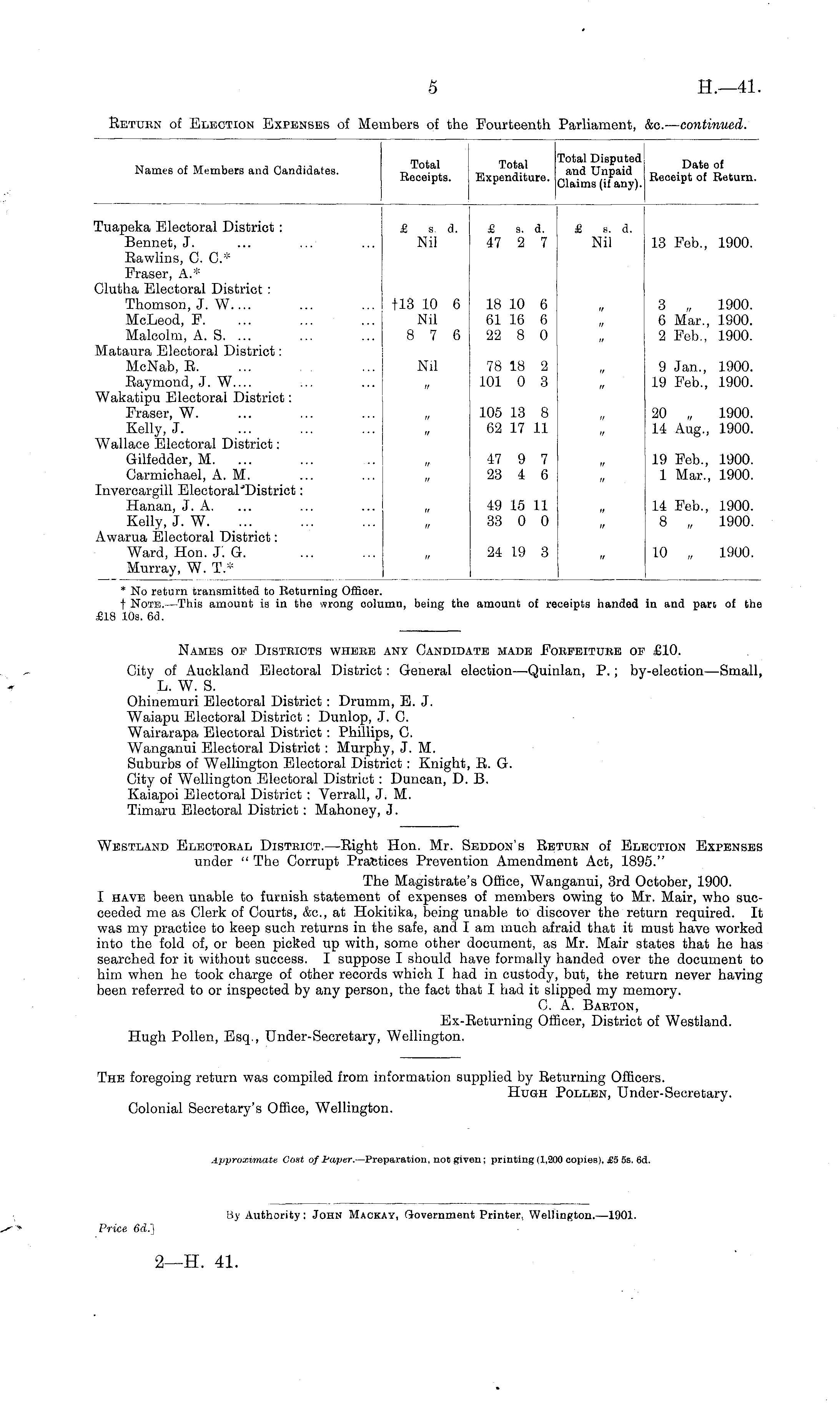 Names of Members and Candidates. Total Receipts. Total Expenditure. Total Disputed D { Tuapeka Electoral District: Bennet, J. Bawlins, C. C* Fraser, A.* Clutha Electoral District : Thomson, J. W.... McLeod, F. Malcolm, A. S. ... Mataura Electoral District: McNab, E. Raymond, J. W.... Wakatipu Electoral District: Fraser, W. Kelly, J. Wallace Electoral District: Gilfedder, M. ... Carmichael, A. M. Invercargill Electoral "District: Hanan, J. A. Kelly, J. W. Awarua Electoral District: Ward, Hon. J. G. Murray, W. T.* £ s. d. Nil 113 10 6 Nil 8 7 6 Nil // £ s. d. 47 2 7 18 10 6 61 16 6 22 8 0 78 18 2 101 0 3 105 13 8 62 17 11 £ s. d. Nil it ft 13 Feb, 1900. 3 „ 1900. 6 Mar, 1900. 2 Feb, 1900. 9 Jan, 1900. 19 Feb, 1900. 20 „ 1900. 14 Aug, 1900. 47 9 7 23 4 6 tr 19 Feb, 1900. 1 Mar, 1900. it 49 15 11 33 0 0 t/ 14 Feb, 1900. 8 „ 1900. it 24 19 3 ft 10 „ 1900. * No return transmitted to Returning Offioer. t Note. —This amount is in the wrong ooh £18 10s. 6d. imn, being the amount of receipts handed In and part of the