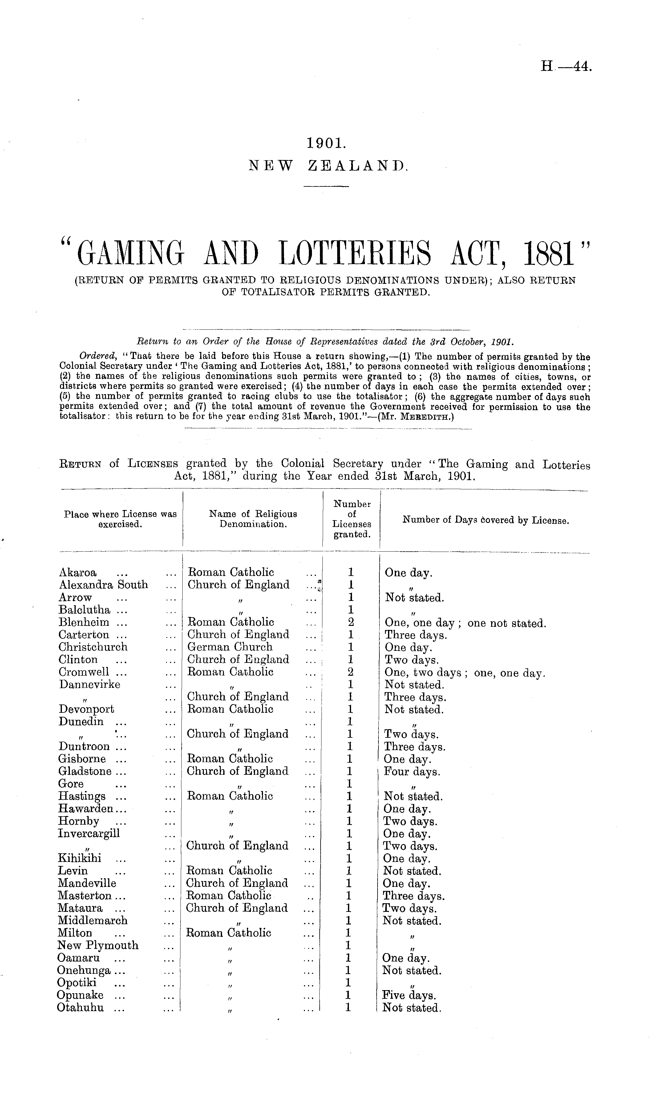 Return to an Order of the House of Representatives dated the 3rd October, 1901. Ordered, "That there be laid before this House a return showing,—(l) The number of permits granted by the Colonial Secretary under ' The Gaming and Lotteries Act, 1881,' to persons conneoted with religious denominations ; (2) the names of the religious denominations such permits were granted to ; (3) the names of cities, towns, or districts where permits so granted were exercised; (4) the number of days in each case the permits extended over ; (5) the number of permits granted to racing clubs to use the totalisator; (6) the aggregate number of days suoh permits extended over; and (7) the total amount of revenue the Government received for permission to use the totalisator: this return to be for the year ending 31st March, 1901."—(Mr. Meredith.)