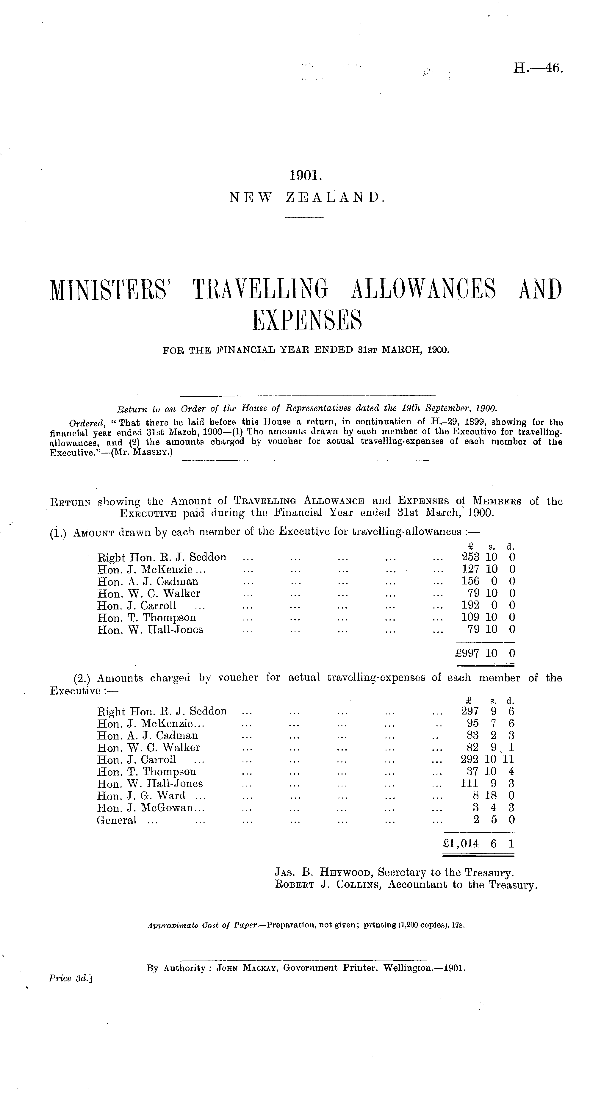 Eeturn showing the Amount of Travelling Allowance and Expenses of Members of the Executive paid during the Financial Year ended 31st March, 1900. (1.) Amount drawn by each member of the Executive for travelling-allowances :— £ s. d. Eight Hon. E. J. Seddon ... ... ... ... ... 253 10 0 Hon. J. McKenzie... ... ... ... ... ... 127 10 0 Hon. A. J. Cadman ... ... ... ... ... 156 0 0 Hon. W. C. Walker ... ... ... ... ... 79 10 0 Hon. J. Carroll ... ... ... ... ... ... 192 0 0 Hon. T. Thompson ... ... ... ... ... 109 10 0 Hon. W. Hall-Jones ... ... ... ... ... 79 10 0 £997 10 0 (2.) Amounts charged by voucher for actual travelling-expenses of each member of the Executive :— £ s. d. Eight Hon. E. J. Seddon ... ... ... ... ... 297 9 6 Hon. J. McKenzie... ... ... ... ... .. 95 7 6 Hon. A. J. Cadman ... ... ... ... .. 83 2 3 Hon. W. C. Walker ... ... ... ... ... 82 9,1 Hon. J. Carroll ... ... ... ... ... ... 292 10 11 Hon. T. Thompson ... ... ... ... ... 37 10 4 Hon. W. Hall-Jones ... ... ... ... ... 11l 9 3 Hon. J. G. Ward ... ... ... ... ... ... 8 18 0 Hon. J. McGowan... ... ... ... ... ... 3 4 3 General ... ... ... ... ... ... ... 2 5 0 £1,014 6 1 Jas. B. Heywood, Secretary to the Treasury. Eobebt J. Collins, Accountant to the Treasury. Approximate Cost of Paper. —Preparation, not given; printing (1,200 copies), 17s,