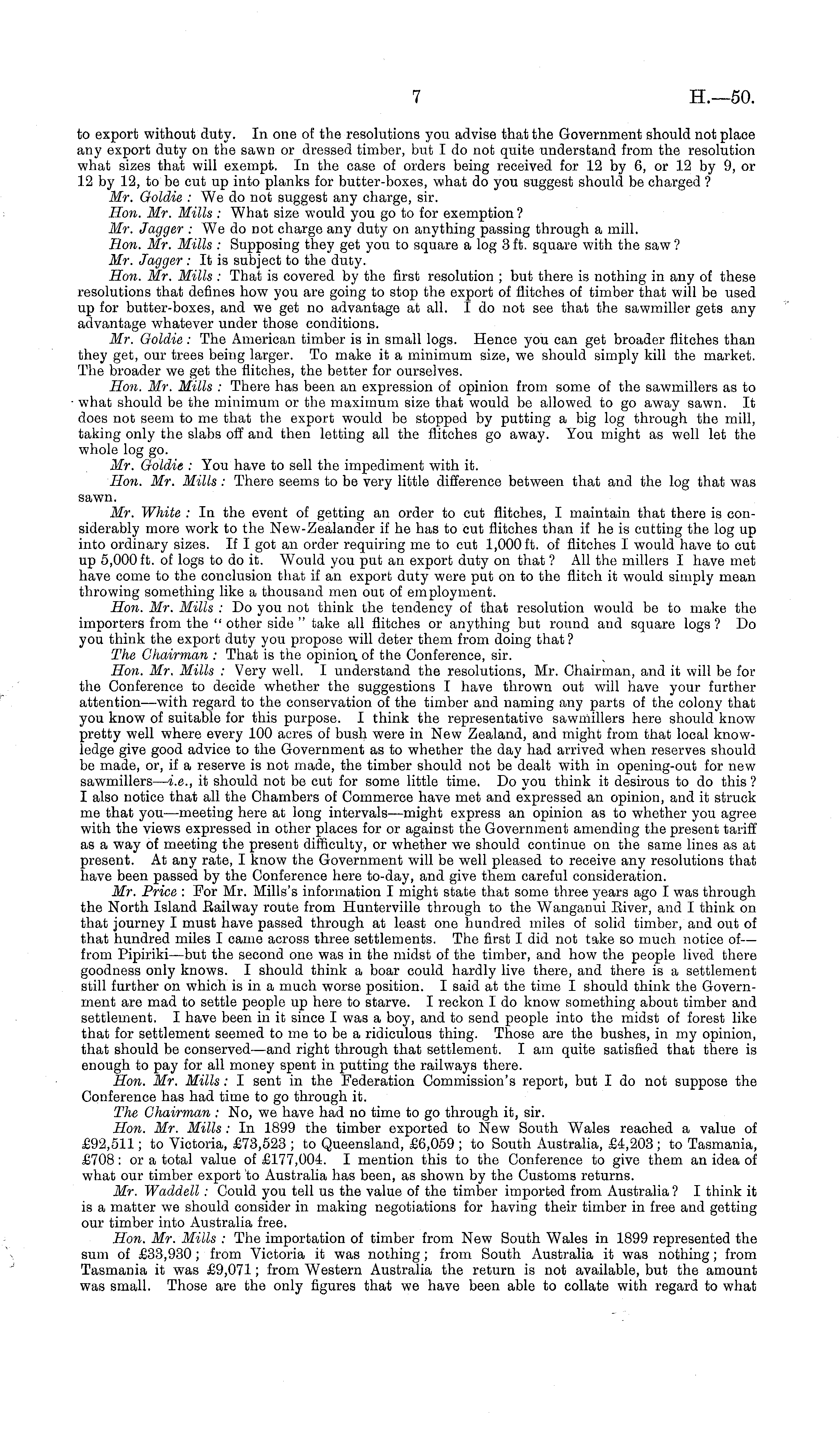to export without duty. In one of the resolutions you advise that the Government should not place any export duty on the sawn or dressed timber, but I do not quite understand from the resolution what sizes that will exempt. In the case of orders being received for 12 by 6, or 12 by 9, or 12 by 12, to be cut up into planks for butter-boxes, what do you suggest should be charged ? Mr. Goldie : We do not suggest any charge, sir. Hon. Mr. Mills: What size would you go to for exemption ? Mr. Jagger : We do not charge any duty on anything passing through a mill. Hon. Mr. Mills : Supposing they get you to square a log 3 ft. square with the saw ? Air. Jagger : It is subject to the duty. Hon. Mr. Mills : That is covered by the first resolution ; but there is nothing in any of these resolutions that defines how you are going to stop the export of flitches of timber that will be used up for butter-boxes, and we get no advantage at all. I do not see that the sawmiller gets any advantage whatever under those conditions. Mr. Goldie: The American timber is in small logs. Hence you can get broader flitches than they get, our trees being larger. To make it a minimum size, we should simply kill the market. The broader we get the flitches, the better for ourselves. Hon. Mr. Mills : There has been an expression of opinion from some of the sawmillers as to what should be the minimum or the maximum size that would be allowed to go away sawn. It does not seem to me that the export would be stopped by putting a big log through the mill, taking only the slabs off and then letting all the flitches go away. You might as well let the whole log go. Mr. Goldie : You have to sell the impediment with it. Hon. Mr. Mills: There seems to be very little difference between that and the log that was sawn. Mr. White : In the event of getting an order to cut flitches, I maintain that there is considerably more work to the New-Zealander if he has to cut flitches than if he is cutting the log up into ordinary sizes. If I got an order requiring me to cut 1,000 ft. of flitches I would have to cut up 5,000 ft. of logs to do it. Would you put an export duty on that ? All the millers I have met have come to the conclusion that if an export duty were put on to the flitch it would simply mean throwing something like a thousand men out of employment. Hon. Mr. Mills : Do you not think the tendency of that resolution would be to make the importers from the " other side " take all flitches or anything but round and square logs ? Do you think the export duty you propose will deter them from doing that ? The Chairman : That is the opinion of the Conference, sir. Hon. Mr. Mills : Very well. I understand the resolutions, Mr. Chairman, and it will be for the Conference to decide whether the suggestions I have thrown out will have your further attention—with regard to the conservation of the timber and naming any parts of the colony that you know of suitable for this purpose. I think the representative sawmillers here should know pretty well where every 100 acres of bush were in New Zealand, and might from that local knowledge give good advice to the Government as to whether the day had arrived when reserves should be made, or, if a reserve is not made, the timber should not be dealt with in opening-out for new sawmillers— i.e., it should not be cut for some little time. Do you think it desirous to do this? I also notice that all the Chambers of Commerce have met and expressed an opinion, and it struck me that you —meeting here at long intervals —might express an opinion as to whether you agree with the views expressed in other places for or against the Government amending the present tariff as a way of meeting the present difficulty, or whether we should continue on the same lines as at present. At any rate, I know the Government will be well pleased to receive any resolutions that have been passed by the Conference here to-day, and give them careful consideration. Mr. Price : For Mr. Mills's information I might state that some three years ago I was through the North Island Railway route from Hunterville through to the Wanganui River, and I think on that journey I must have passed through at least one hundred miles of solid timber, and out of that hundred miles I came across three settlements. The first I did not take so much notice of— from Pipiriki—but the second one was in the midst of the timber, and how the people lived there goodness only knows. I should think a boar could hardly live there, and there is a settlement still further on which is in a much worse position. I said at the time I should think the Government are mad to settle people up here to starve. I reckon Ido know something about timber and settlement. I have been in it since I was a boy, and to send people into the midst of forest like that for settlement seemed to me to be a ridiculous thing. Those are the bushes, in my opinion, that should be conserved —and right through that settlement. I am quite satisfied that there is enough to pay for all money spent in putting the railways there. Hon. Mr. Mills: I sent in the Federation Commission's report, but I do not suppose the Conference has had time to go through it. The Chairman ; No, we have had no time to go through it, sir. Hon. Mr. Mills: In 1899 the timber exported to New South Wales reached a value of £92,511; to Victoria, £73,523 ; to Queensland, £6,059 ; to South Australia, £4,203 ; to Tasmania, £708: or a total value of £177,004. I mention this to the Conference to give them an idea of what our timber export to Australia has been, as shown by the Customs returns. Mr. Waddell : Could you tell us the value of the timber imported from Australia ? I think it is a matter we should consider in making negotiations for having their timber in free and getting our timber into Australia free. Hon. Mr. Mills : The importation of timber from New South Wales in 1899 represented the sum of £33,930; from Victoria