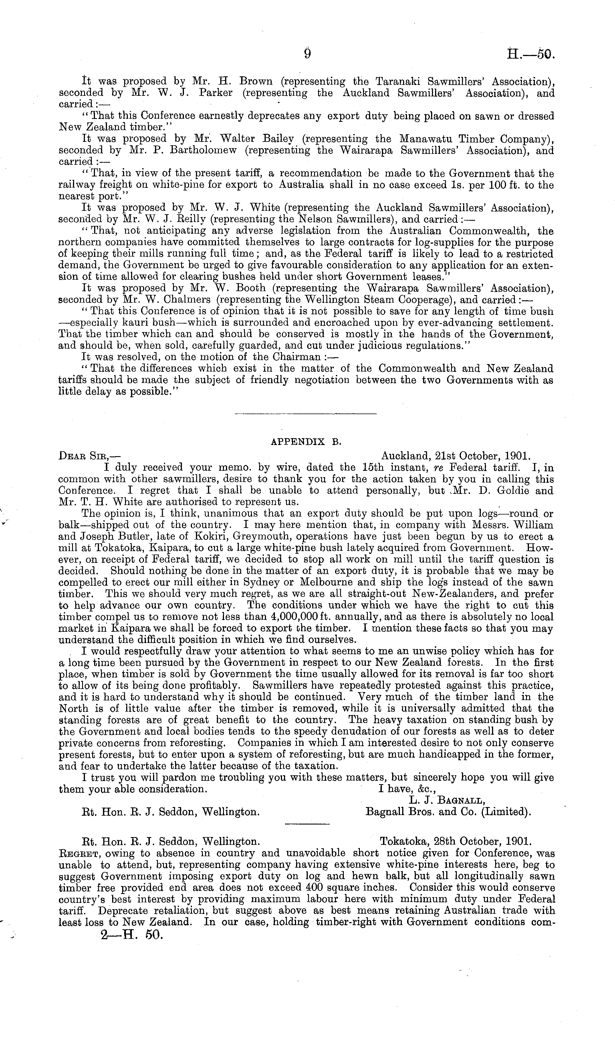 APPENDIX B. Dear Sir, — Auckland, 21st October, 1901. I duly received your memo, by wire, dated the 15th instant, re Federal tariff. I, in common with other sawmillers, desire to thank you for the action taken by you in calling this Conference. I regret that I shall be unable to attend personally, but .Mr. D. Goldie and Mr. T. H. White are authorised to represent us. The opinion is, I think, unanimous that an export duty should be put upon logs—round, or balk—shipped out of the country. I may here mention that, in company with Messrs. William and Joseph Butler, late of Kokiri, Greymouth, operations have just been begun by us to erect a mill at Tokatoka, Kaipara, to cut a large white-pine bush lately acquired from Government. However, on receipt of Federal tariff, we decided to stop all work on mill until the tariff question is decided. Should nothing be done in the matter of an export duty, it is probable that we may be compelled to erect our mill either in Sydney or Melbourne and ship the log's instead of the sawn timber. This we should very much regret, as we are all straight-out New-Zealanders, and prefer to help advance our own country. The conditions under which we have the right to cut this timber compel us to remove not less than 4,000,000 ft. annually, and as there is absolutely no local market in Kaipara we shall be forced to export the timber. I mention these facts so that you may understand the difficult position in which we find ourselves. I would respectfully draw your attention to what seems to me an unwise policy which has for a long time been pursued by the Government in respect to our New Zealand forests. In the first place, when timber is sold by Government the time usually allowed for its removal is far too short to allow of its being done profitably. Sawmillers have repeatedly protested against this practice, and it is hard to understand why it should be continued. Very much of the timber land in the North is of little value after the timber is removed, while it is universally admitted that the standing forests are of great benefit to the country. The heavy taxation on standing bush by the Government and local bodies tends to the speedy denudation of our forests as well as to deter private concerns from reforesting. Companies in which lam interested desire to not only conserve present forests, but to enter upon a system of reforesting, but are much handicapped in the former, and fear to undertake the latter because of the taxation. I trust you will pardon me troubling you with these matters, but sincerely hope you will give them your able consideration. I have, &c, L. J. Bagnall, Rt. Hon. R. J. Seddon, Wellington. Bagnall Bros, and Co. (Limited).