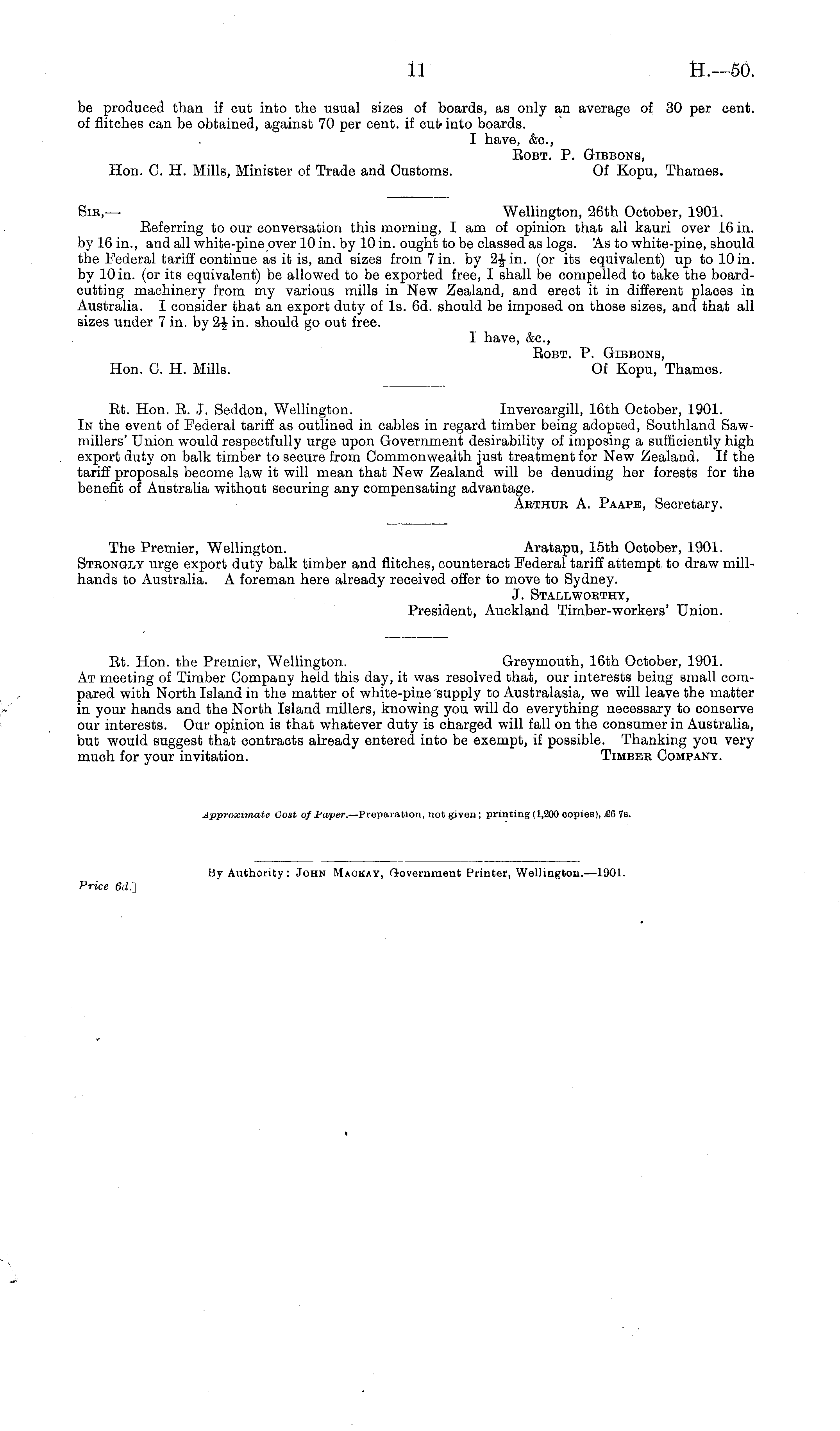 Rt. Hon. R. J. Seddon, Wellington. Invercargill, 16th October, 1901. In the event of Federal tariff as outlined in cables in regard timber being adopted, Southland Sawmillers' Union would respectfully urge upon Government desirability of imposing a sufficiently high export duty on balk timber to secure from Commonwealth just treatment for New Zealand. If the tariff proposals become law it will mean that New Zealand will be denuding her forests for the benefit of Australia without securing any compensating advantage. Arthur A. Paape, Secretary.