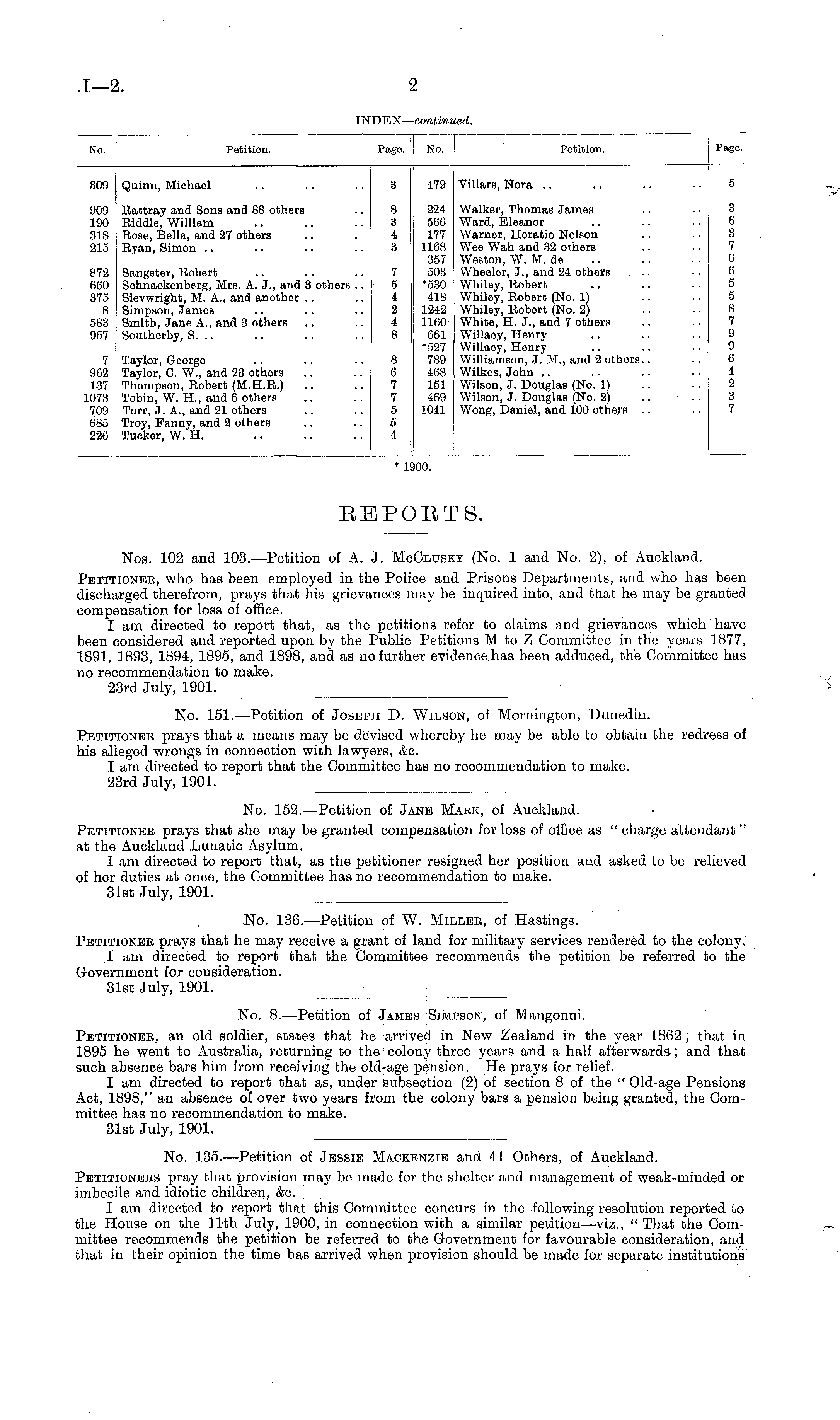 Nos. 102 and 103.—Petition of A. J. McOlusky (No. 1 and No. 2), of Auckland. Petitioner, who has been employed in the Police and Prisons Departments, and who has been discharged therefrom, prays that his grievances may be inquired into, and that he may be granted compensation for loss of office. I am directed to report that, as the petitions refer to claims and grievances which have been considered and reported upon by the Public Petitions M to Z Committee in the years 1877, 1891, 1893, 1894, 1895, and 1898, and as no further evidence has been adduced, the Committee has no recommendation to make. 23rd July, 1901.