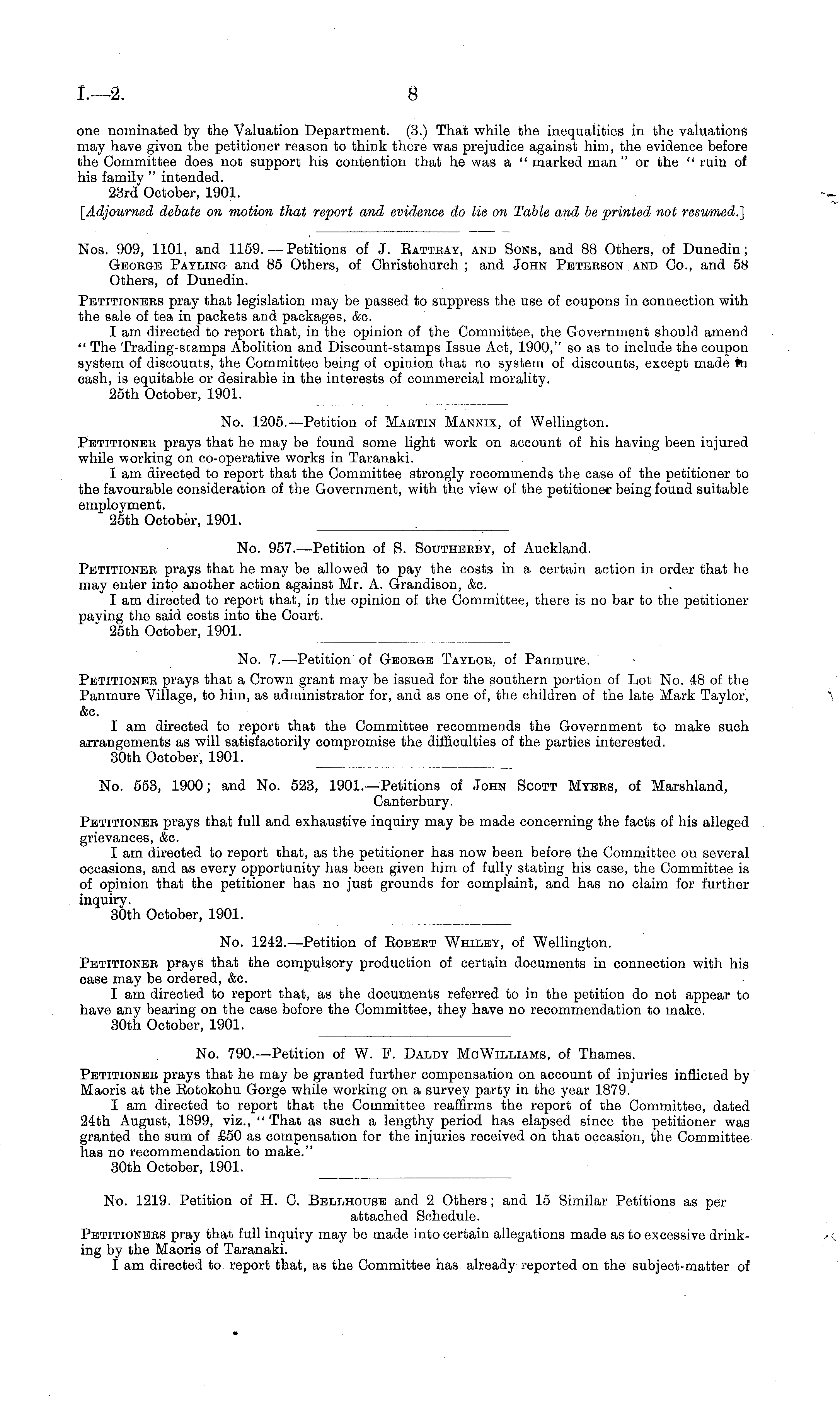 No. 790.—Petition of W. F. Daldy McWilliams, of Thames. Petitioner prays that he may be granted further compensation on account of injuries inflicted by Maoris at the Eotokohu Gorge while working on a survey party in the year 1879. I am directed to report that the Committee reaffirms the report of the Committee, dated 24th August, 1899, viz., " That as such a lengthy period has elapsed since the petitioner was granted the sum of £50 as compensation for the injuries received on that occasion, the Committee has no recommendation to make." 30th October, 1901.