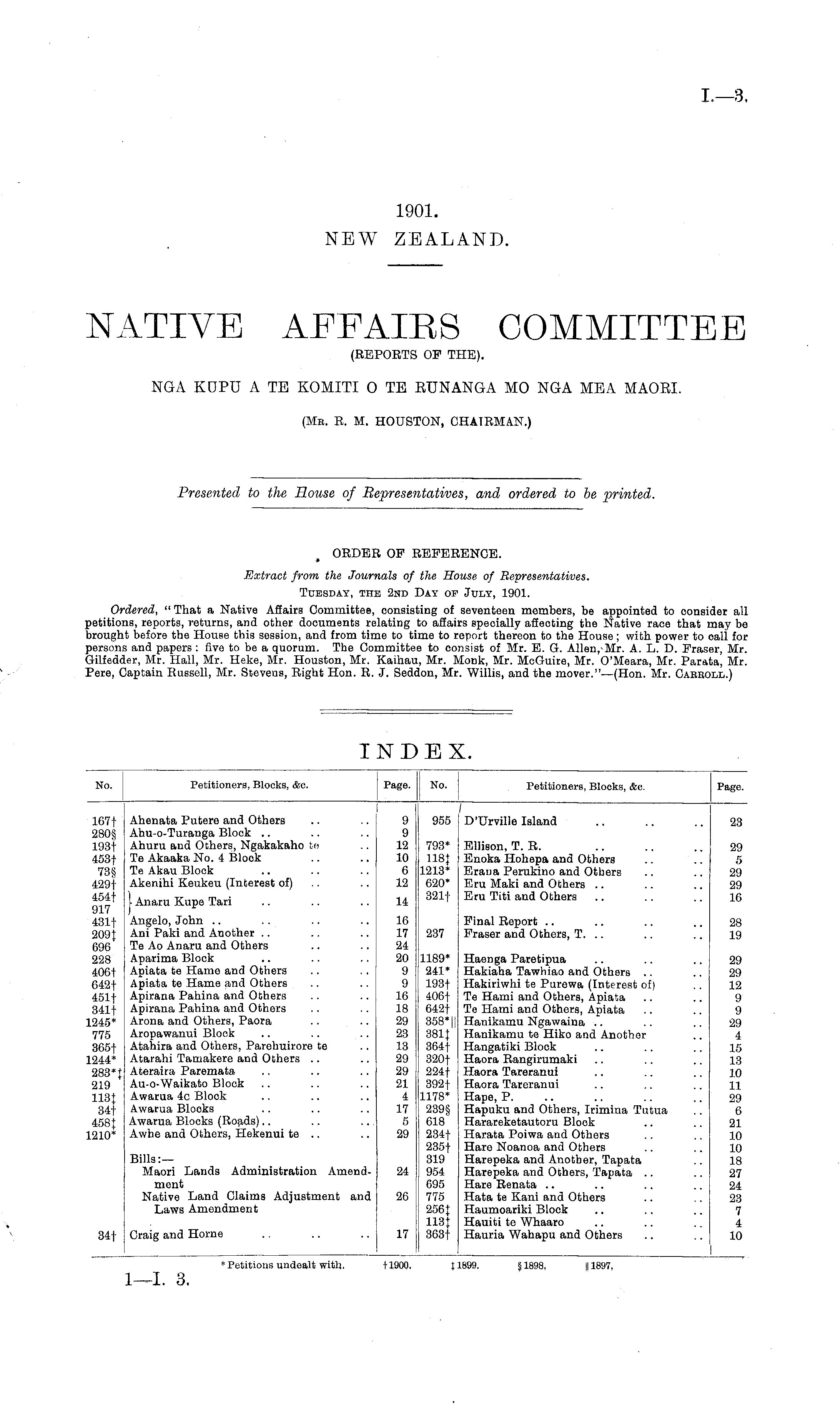 ORDER OP REFERENCE. Extract from the Journals of the House of Representatives. Tuesday, the 2nd Day of July, 1901. Ordered, " That a Native Affairs Committee, consisting of seventeen members, be appointed to consider all petitions, reports, returns, and other documents relating to affairs specially affecting the Native race that may be brought before the House this session, and from time to time to report thereon to the House; with power to call for persons and papers : five to be a quorum. The Committee to consist of Mr. E. G. Allen,'Mr. A. L. D. Fraser, Mr. Gilfedder, Mr. Hall, Mr. Heke, Mr. Houston, Mr. Kaihau, Mr. Monk, Mr. McGuire, Mr. O'Meara, Mr. Parata, Mr. Pere, Captain Russell, Mr. Steveus, Right Hon. R. J, Seddon, Mr. Willis, and the mover."—(Hon. Mr. Cabeoll.)