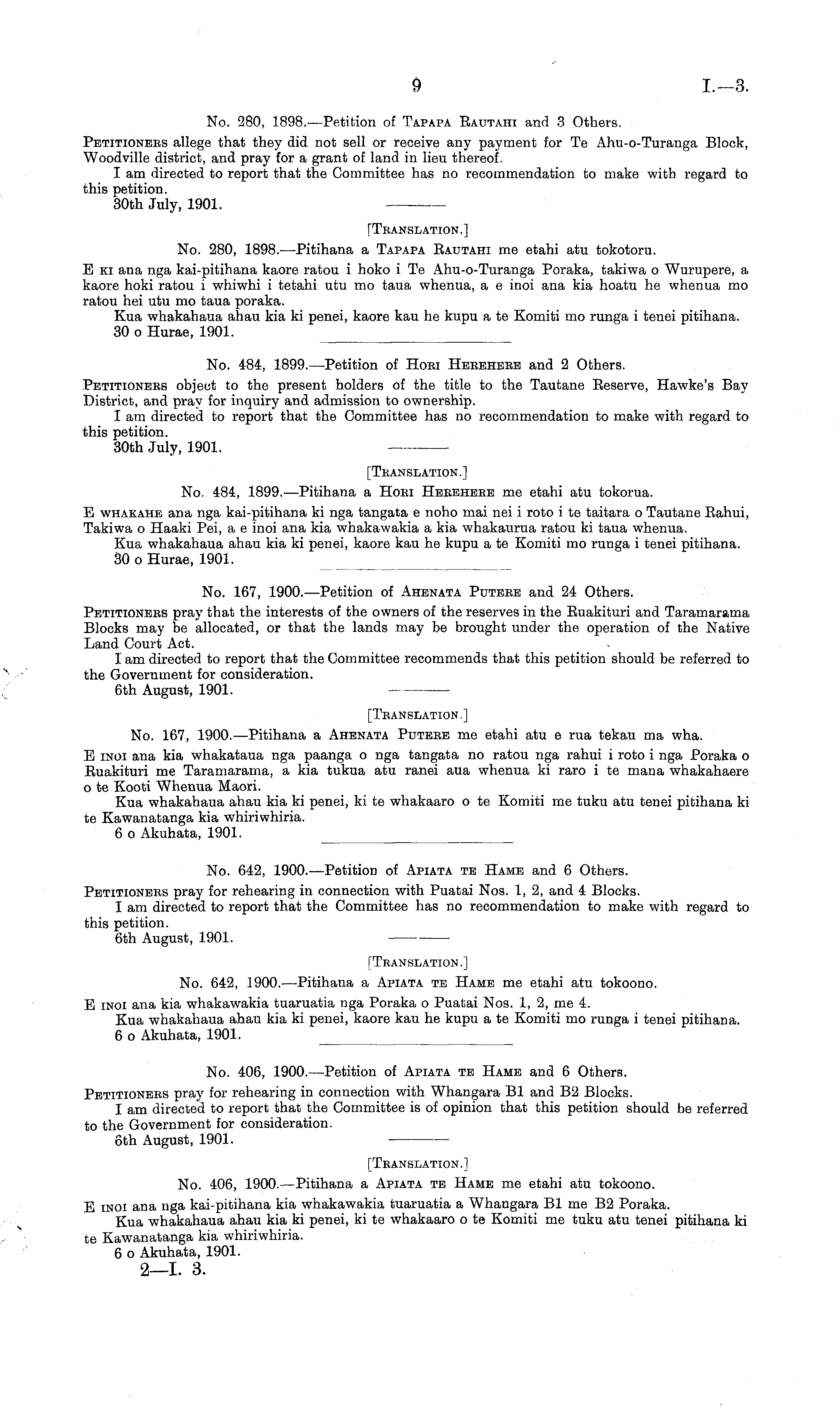 No. 280, 1898.—Petition of Tapapa Eautahi and 3 Others. Petitioners allege that they did not sell or receive any payment for Te Ahu-o-Turanga Block, Woodville district, and pray for a grant of land in lieu thereof. I am directed to report that the Committee has no recommendation to make with regard to this petition. 30th July, 1901.