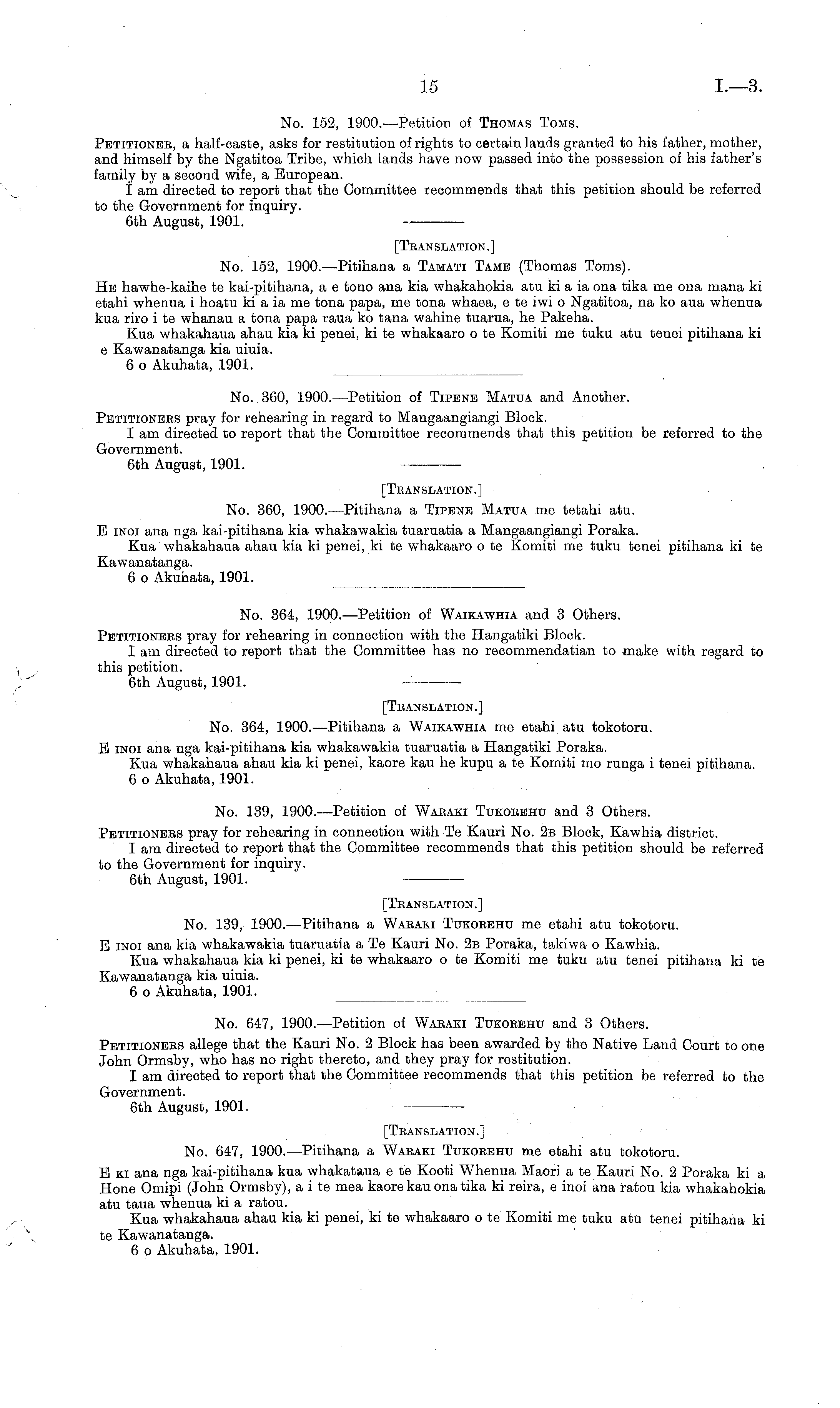 [Translation.] No. 152, 1900.—Pitihana a Tamati Tame (Thomas Toms). Hβ hawhe-kaihe te kai-pitihana, a c tono ana kia whakahokia atu ki a ia ona tika me ona mana ki etahi whenua i hoatu ki a ia me tona papa, me tona whaea, c te iwi o Ngatitoa, na ko aua whenua kua riro i te whanau a tona papa raua ko tana wahine tuarua, he Pakeha. Kua whakahaua ahau kia ki penei, kite whakaaro o te Komiti me tuku atu tenei pitihana ki c Kawanatanga kia uiuia. 6 o Akuhata, 1901.