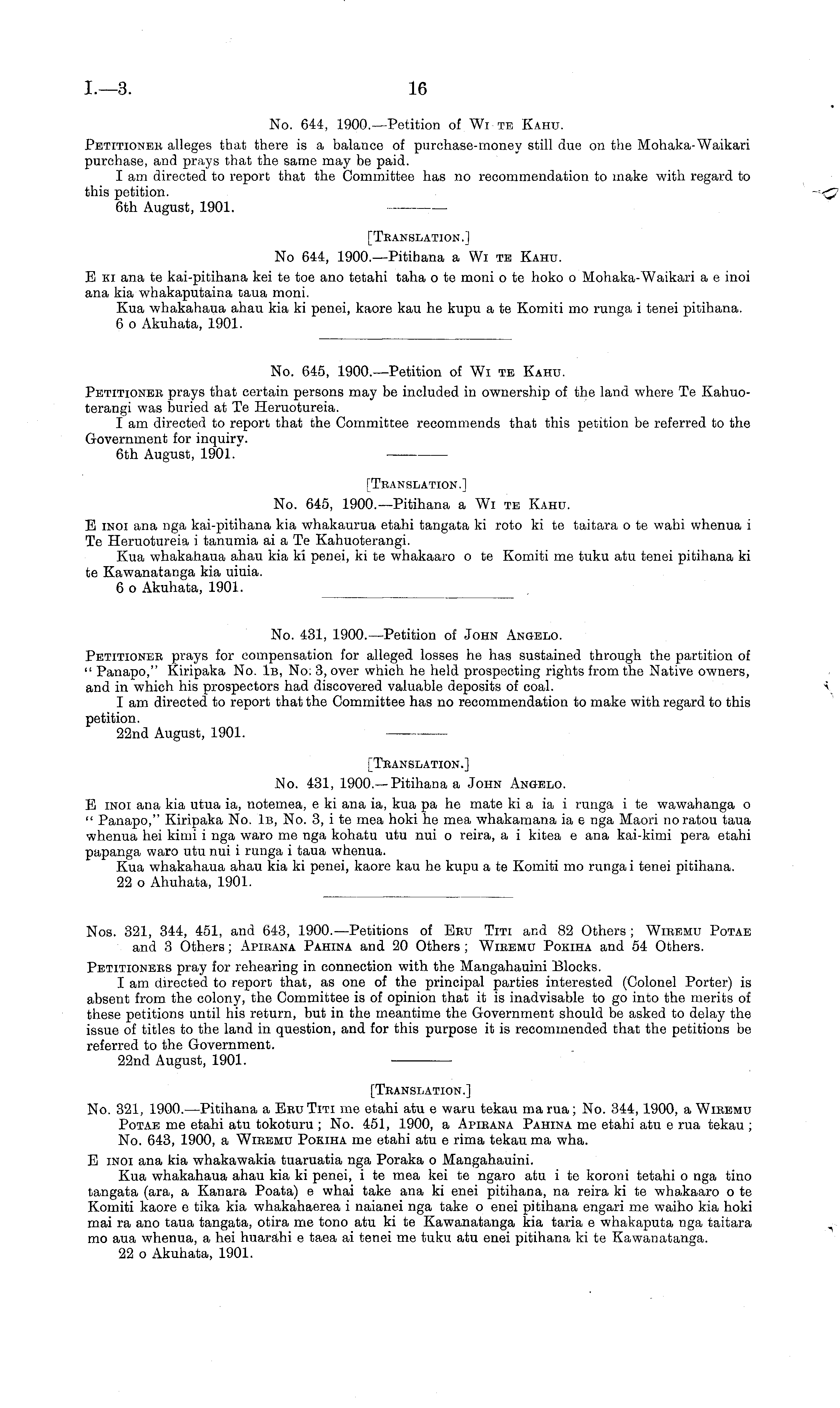 [Translation.] No. 321, 1900. —Pitihana a Eru Titi me etahi atu c waru tekau ma rua; No. 344,1900, a Wiremu Potae me etahi atu tokoturu ; No. 451, 1900, a Apirana Pahina me etahi atu c rua tekau ; No. 643, 1900, a Wiremu Pokiha me etahi atu c rima tekau ma wha. E inoi ana kia whakawakia tuaruatia nga Poraka o Mangahauini. Kua whakahaua ahau kia ki penei, i te mea kei te ngaro atu i te koroni tetahi o nga tino tangata (ara, a Kanara Poata) c whai take ana ki enei pitihana, na reira kite whakaaro o te Komiti kaore c tika kia whakahaerea i naianei nga take o enei pitihana engari me waiho kia hoki mai ra ano taua tangata, otira me tono atu kite Kawanatanga kia taria c whakaputa nga taitara mo aua whenua, a hei huarahi c taea ai tenei me tuku atu enei pitihana kite Kawanatanga. 22 o Akuhata, 1901.