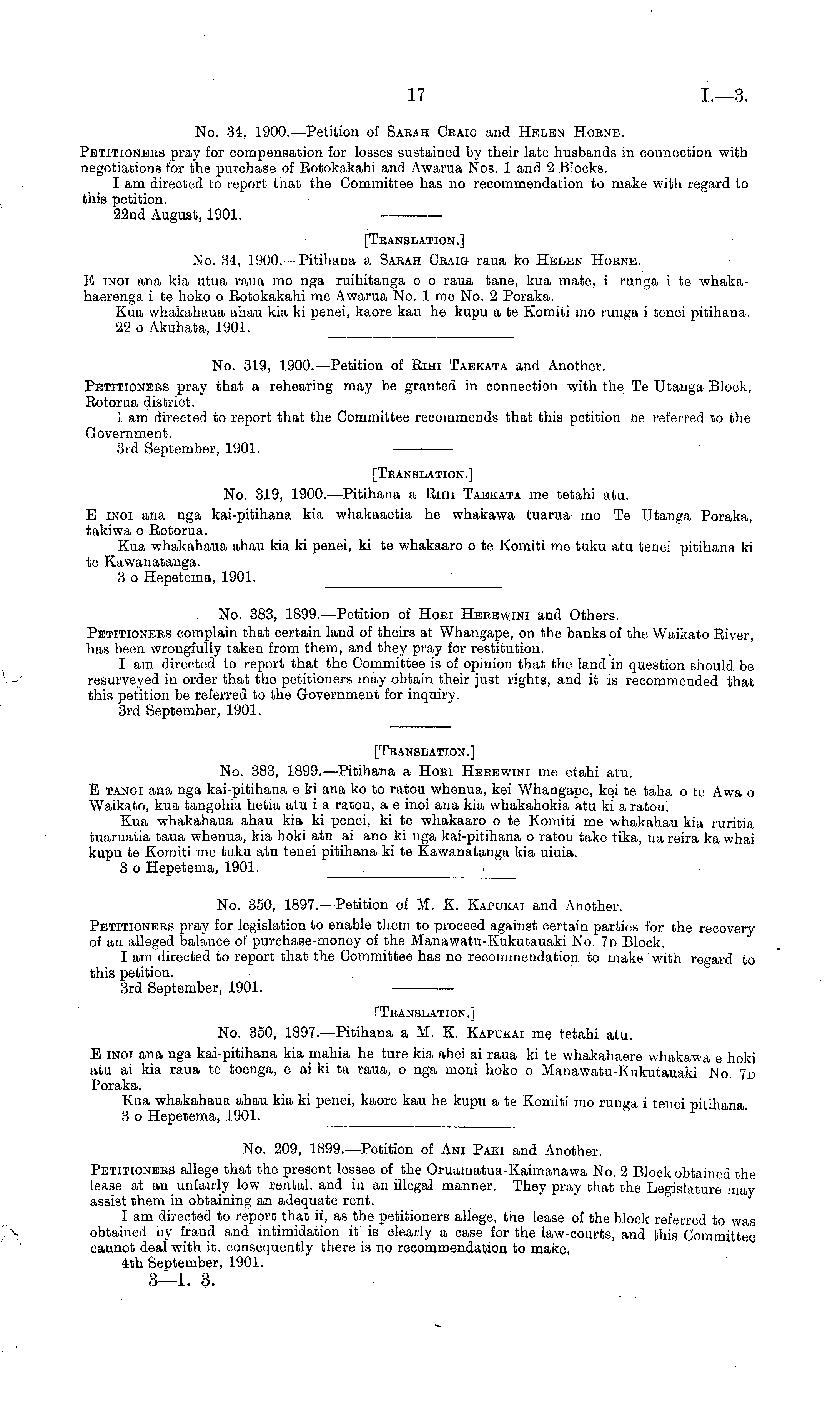 [Translation.] No. 34, 1900.—Pitihana a Sarah Craig raua ko Helen Home. E iNoi ana kia utua raua mo nga ruihitanga o o raua tane, kua mate, i runga i te whakahaerenga i te hoko o Eotokakahi me Awarua No. 1 me No. 2 Poraka. Kua whakahaua ahau kia ki penei, kaore kau he kupu a te Komiti mo runga i tenei pitihana. 22 o Akuhata, 1901.