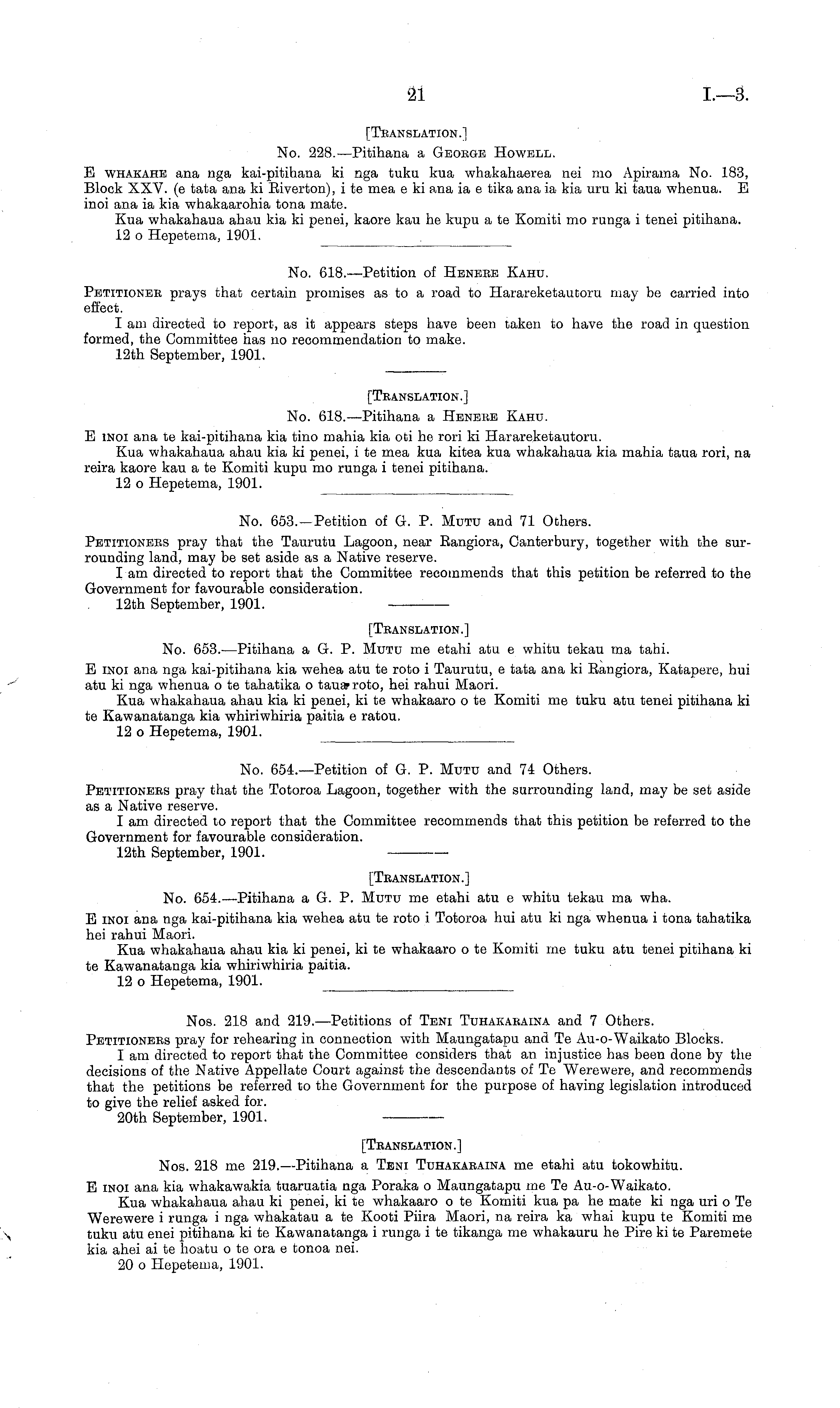 [Translation.] Nos. 218 me 219.—Pitihana a Teni Tuhakaraina me etahi atu tokowhitu. B inoi ana kia whakawakia tuaruatia nga Poraka o Maungatapu me Te Au-o-Waikato. Kua whakahaua ahau ki penei, kite whakaaro o te Komiti kua pa he mate ki nga uri o Te Werewere i runga i nga whakatau a te Kooti Piira Maori, na reira ka whai kupu te Komiti me tuku atu enei pitihana kite Kawanatanga i runga i te tikanga me whakauru he Pire kite Paremete kia ahei ai te hoatu o te ora c tonoa nei. 20 o Hepetema, 1901.