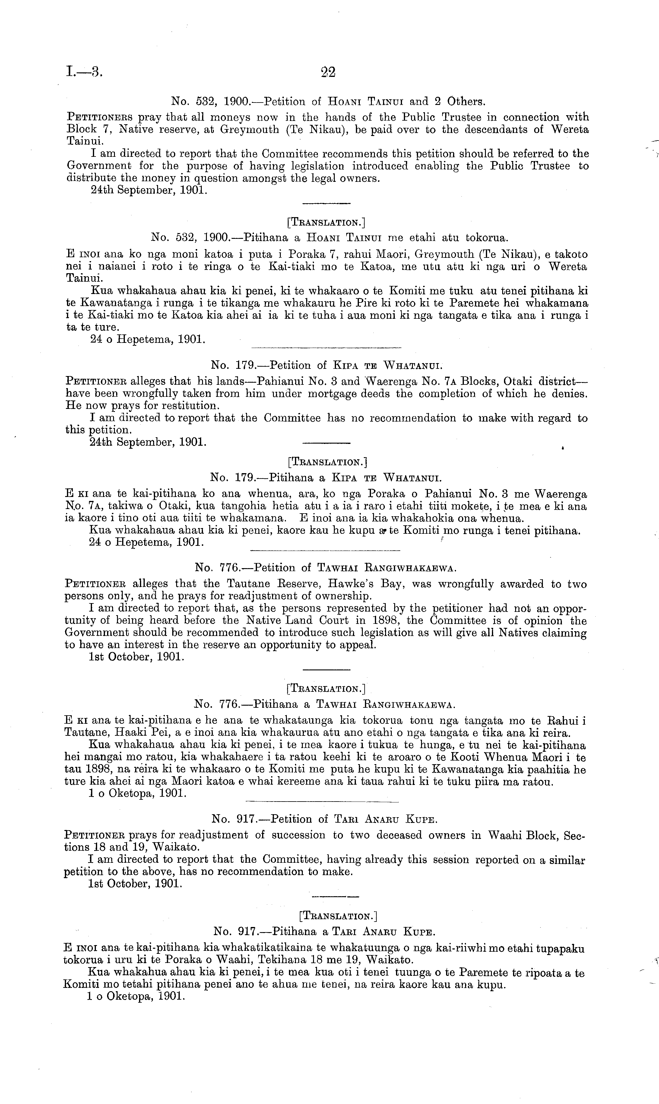 [Translation.] No. 532, 1900.—Pitihana a Hoani Tainui me etahi atu tokorua. E iNOi ana ko nga moni katoa i puta i Poraka 7, rahui Maori, Greymouth (Te Nikau), c takoto nei i naianei i roto i te ringa o te Kai-tiaki mo te Katoa, me utu atu ki nga uri o Wereta Tainui. Kua whakahaua ahau kia ki penei, kite whakaaro o te Komiti me tuku atu tenei pitihana ki te Kawanatanga i runga i te tikanga me whakauru he Pire ki roto kite Paremete hei whakamana i te Kai-tiaki mo te Katoa kia ahei ai ia kite tuha i ana moni ki nga tangata c tika ana i runga i ta te ture. 24 o Hepetema, 1901.