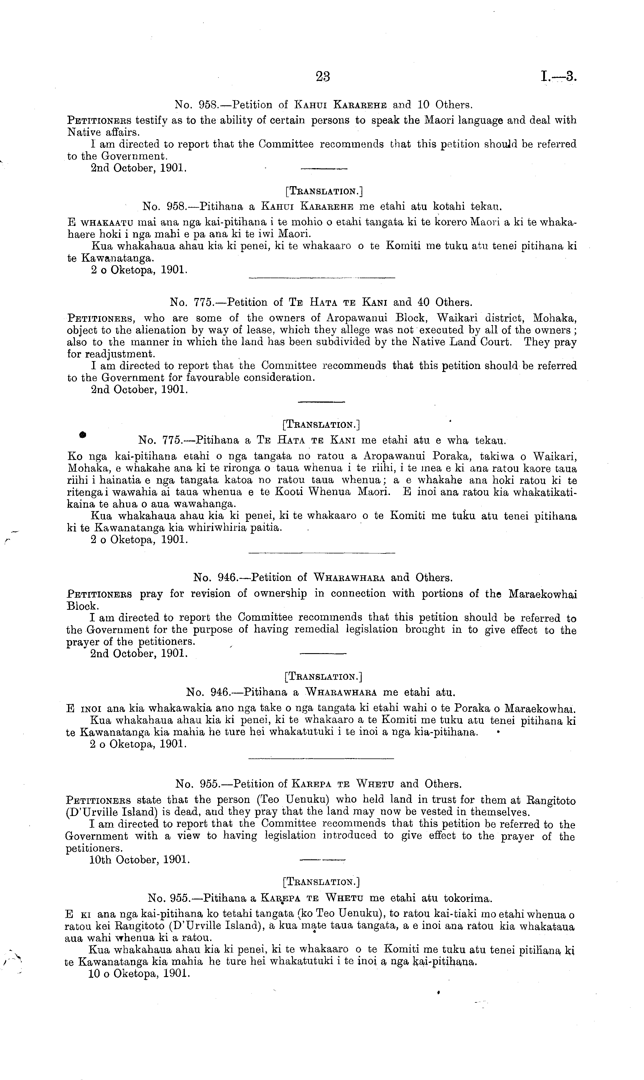 [Translation.] No. 958. —Pitihana a Kahui Kararehe me etahi atu kotahi tekau. B whakaatu mai ana nga kai-pitihana i te mohio o etahi tangata kite korero Maori a kite whakahaere hoki i nga mahi c pa ana kite iwi Maori. Kua whakahaua ahau kia ki penei, kite whakaaro o te Komiti me tuku atu tenei pitihana ki te Kawanatanga. 2 o Oketopa, 1901.