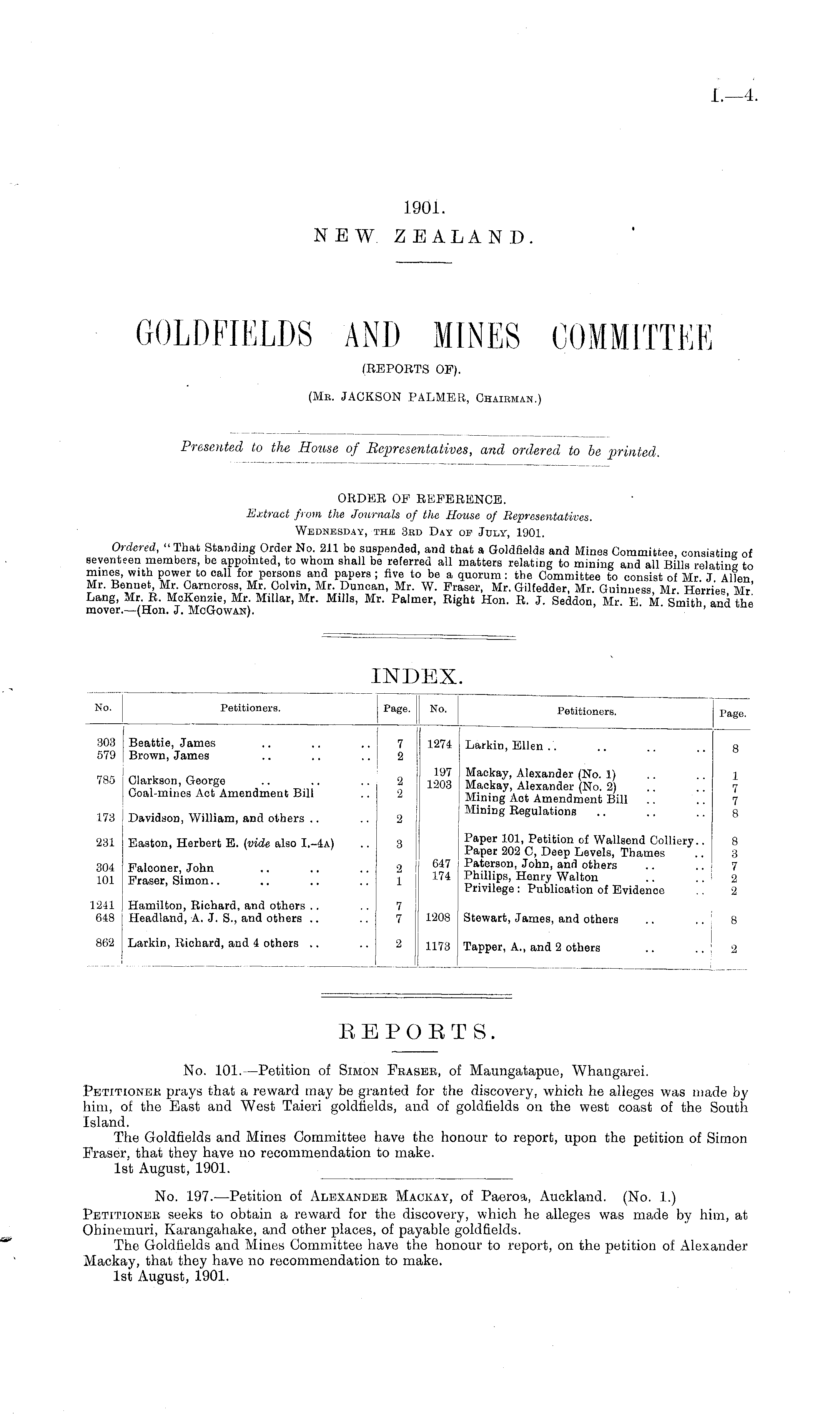ORDER OF REFERENCE. Extract from the Journals of the House of Representatives. Wednesday, the 3bd Day of July, 1901. Ordered, " That Standing Order No. 211 bo suspended, and that a Goldflelds and Mines Committee consisting of seventeen members, be appointed, to whom shall be referred all matters relating to mining and all Bills relating to mines, with power to oall for persons and papers ; five to be a quorum: the Committee to consist of Mr J Allen Mr. Benuet, Mr. Carncross, Mr. Colvin, Mr. Duncan, Mr. W. Fraser, Mr. Gilfedder, Mr. Guinness Mr Hemes Mr' Lang, Mr. R. McKenzie, Mr. Millar, Mr. Mills, Mr. Palmer, Right Hon. R. J. Seddon, Mr. E M Smith and the mover.—(Hon. J. McGowan). '