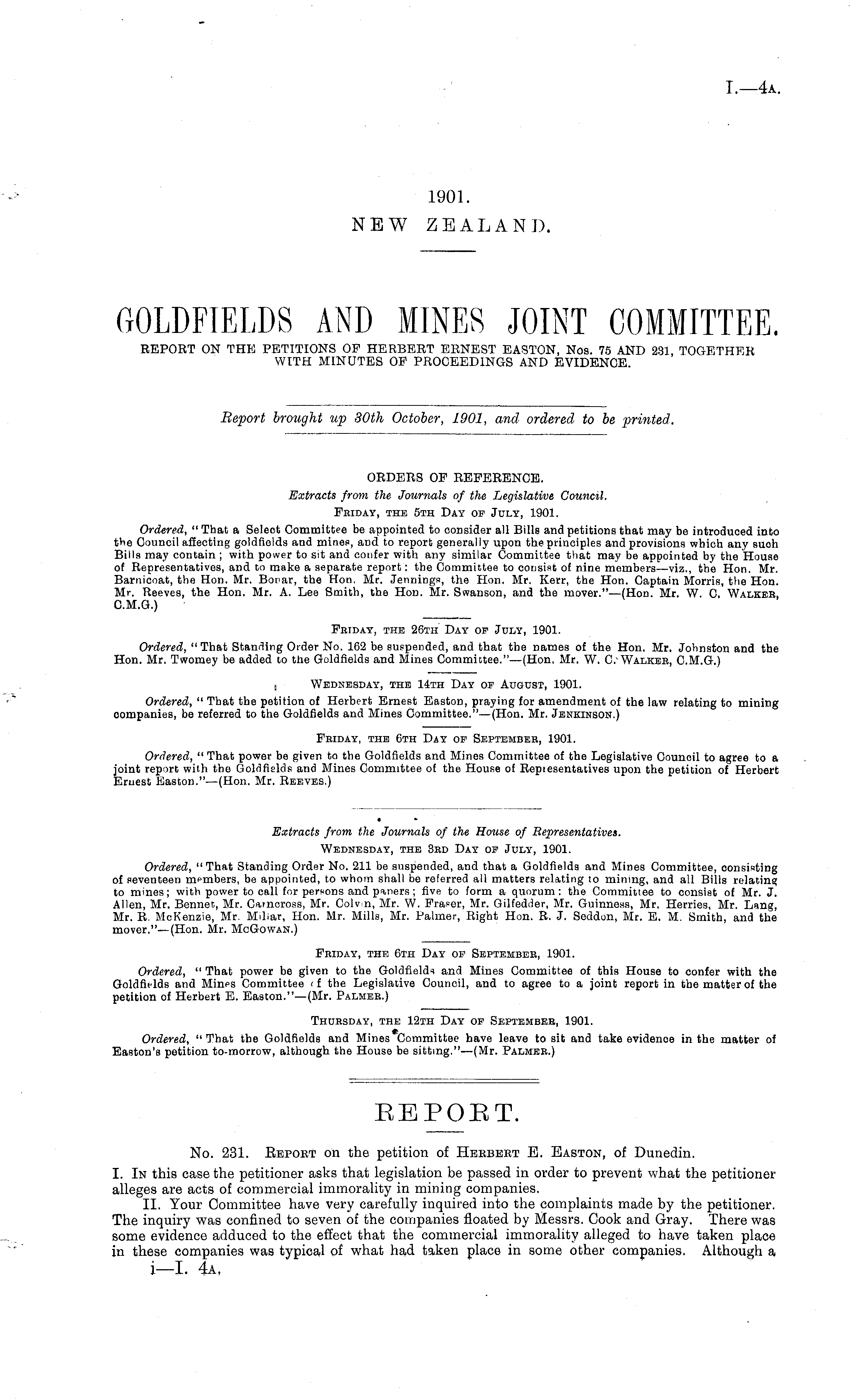 GOLDFIELDS AND MINES JOINT COMMITTEE. REPORT ON THE PETITIONS OF HERBERT ERNEST EASTON, Nos. 75 AND 231, TOGETHER WITH MINUTES OF PROCEEDINGS AND EVIDENCE.