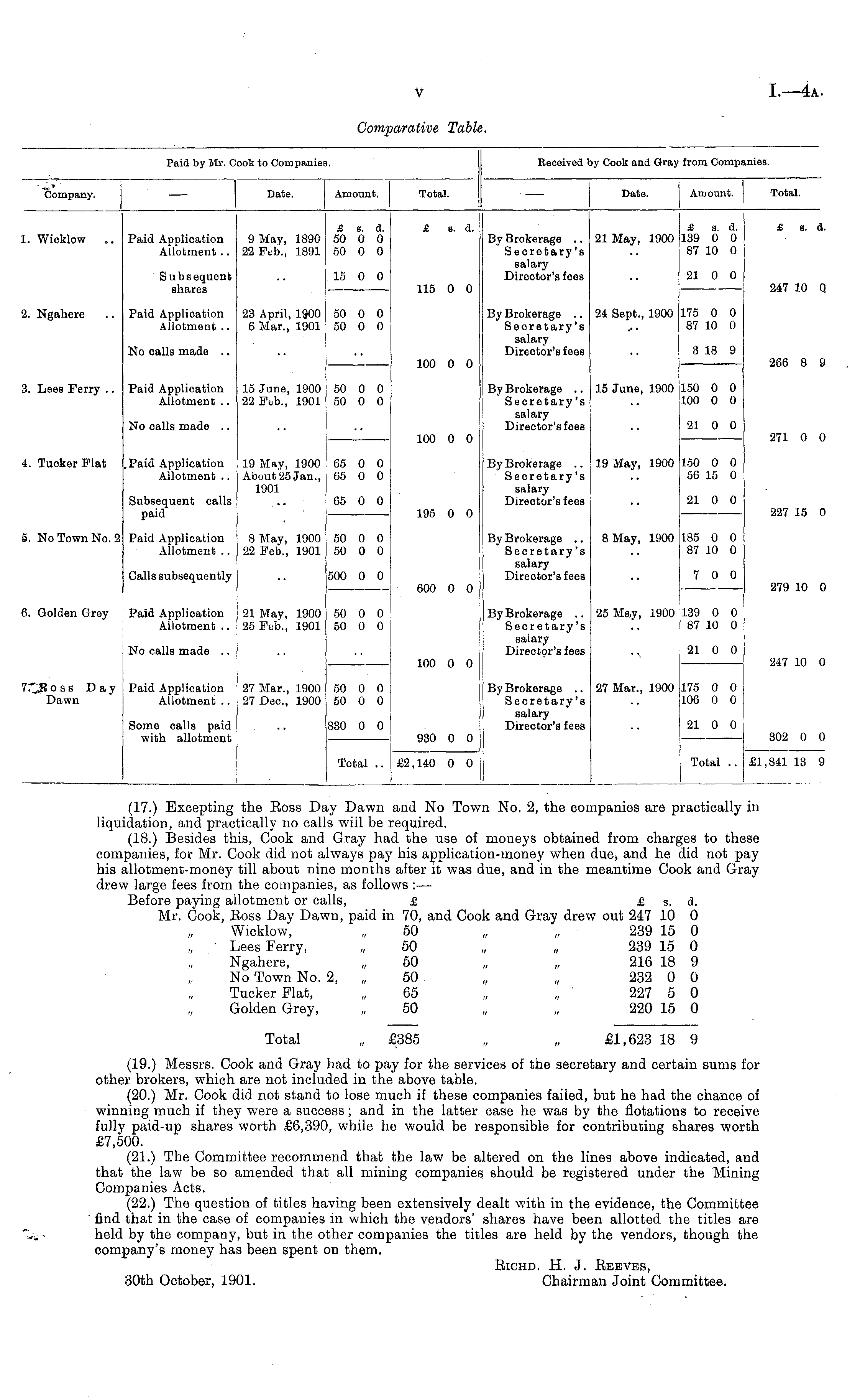 (17.) Excepting the Eoss Day Dawn and No Town No. 2, the companies are practically in liquidation, and practically no calls will be required. (18.) Besides this, Cook and Gray had the use of moneys obtained from charges to these companies, for Mr. Cook did not always pay his application-money when due, and he did not pay his allotment-money till about nine months after it was due, and in the meantime Cook and Gray drew large fees from the companies, as follows : — Before paying allotment or calls, £ £ s. d. Mr. Cook, Boss Day Dawn, paid in 70, and Cook and Gray drew out 247 10 0 Wicklow, „ 50 „ „ 239 15 0 Lees Ferry, „ 50 „ „ 239 15 0 Ngahere, „ 50 „ „ 216 18 9 No Town No. 2, „ 50 „ „ 232 0 0 Tucker Flat, „ 65 „ „ ' 227 5 0 Golden Grey, „ 50 „ „ 220 15 0 Total „ £385 „ „ £1,623 18 9 (19.) Messrs. Cook and Gray had to pay for the services of the secretary and certain sums for other brokers, which are not included in the above table. (20.) Mr. Cook did not stand to lose much if these companies failed, but he had the chance of winning much if they were a success; and in the latter case he was by the flotations to receive fully paid-up shares worth £6,390, while he would be responsible for contributing shares worth £7,500. (21.) The Committee recommend that the law be altered on the lines above indicated, and that the law be so amended that all mining companies should be registered under the Mining Companies Acts. (22.) The question of titles having been extensively dealt with in the evidence, the Committee find that in the case of companies in which the vendors' shares have been allotted the titles are held by the company, but in the other companies the titles are held by the vendors, though the company's money has been spent on them. Bichd. H. J. Beeves, 30th October, 1901. Chairman Joint Committee.