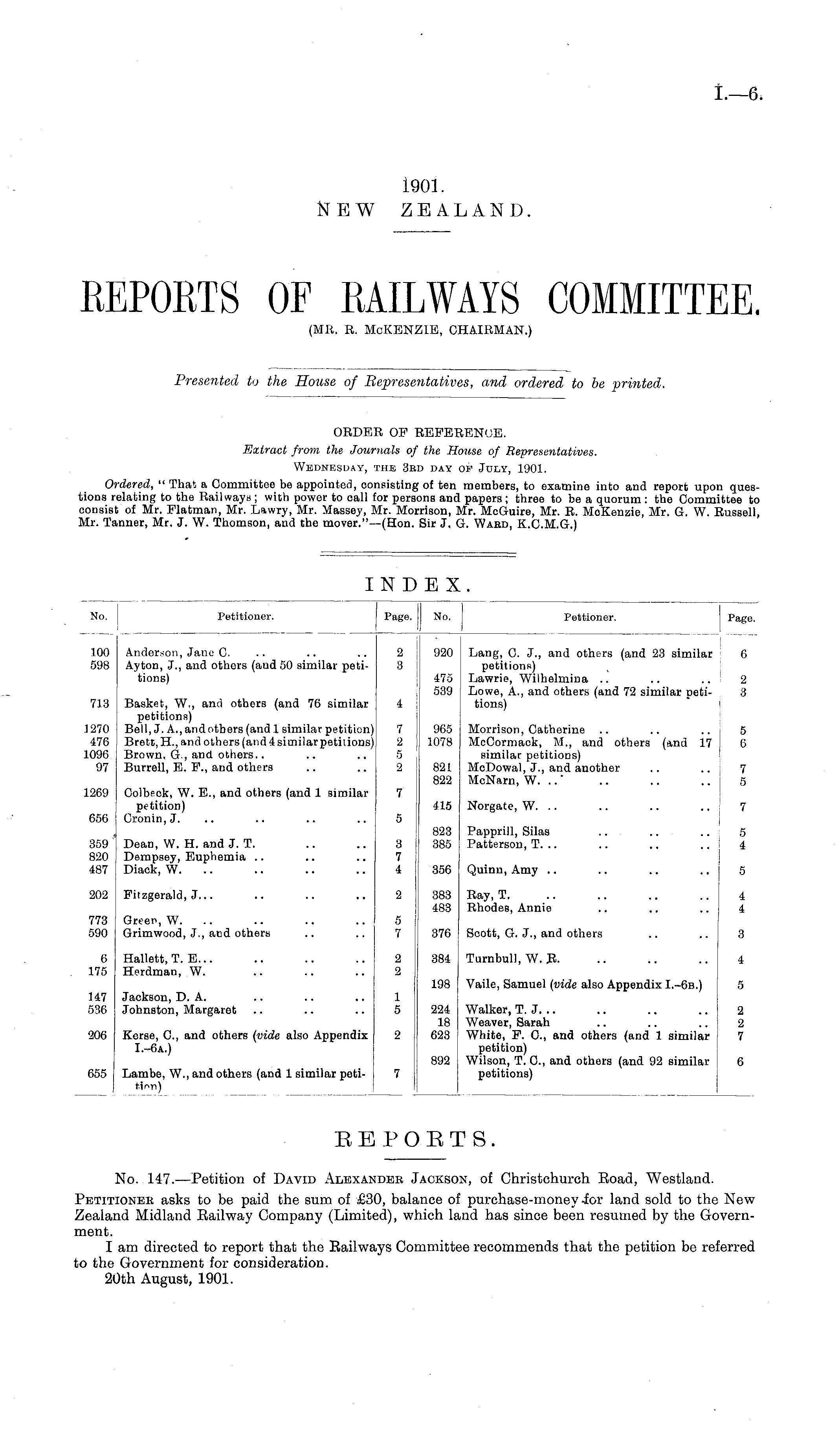 No. 147.—Petition of David Alexander Jackson, of Christchurch Eoad, Westland. Petitioner asks to be paid the sum of £30, balance of purchase-money for land sold to the New Zealand Midland Railway Company (Limited), which land has since been resumed by the Government. I am directed to report that the Railways Committee recommends that the petition be referred to the Government for consideration. 20th August, 1901.