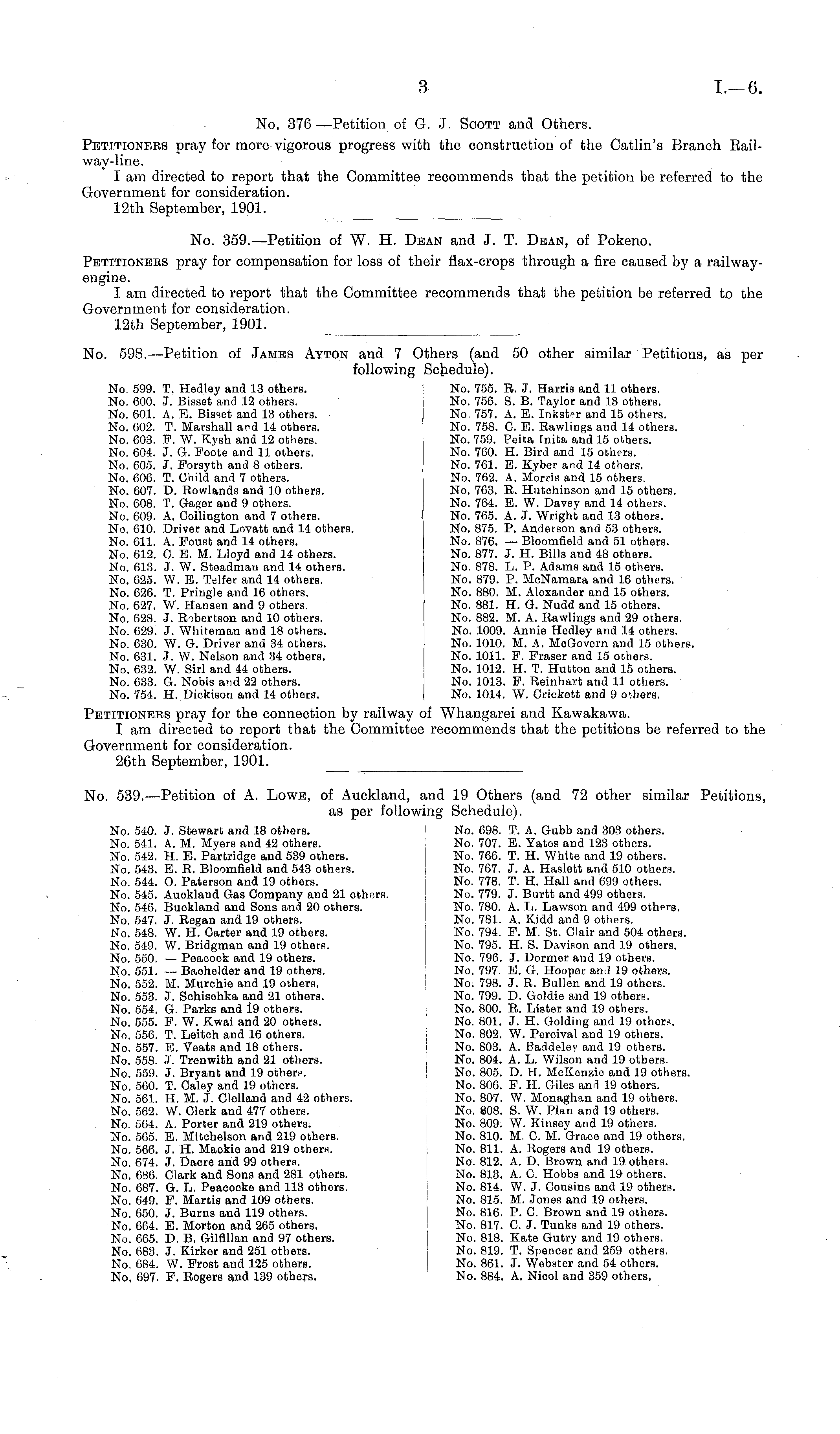 No. 376 —Petition of G. J. Scott and Others. Petitioners pray for more vigorous progress with the construction of the Catlin's Branch Rail-way-line. I am directed to report that the Committee recommends that the petition be referred to the Government for consideration. 12th September, 1901.