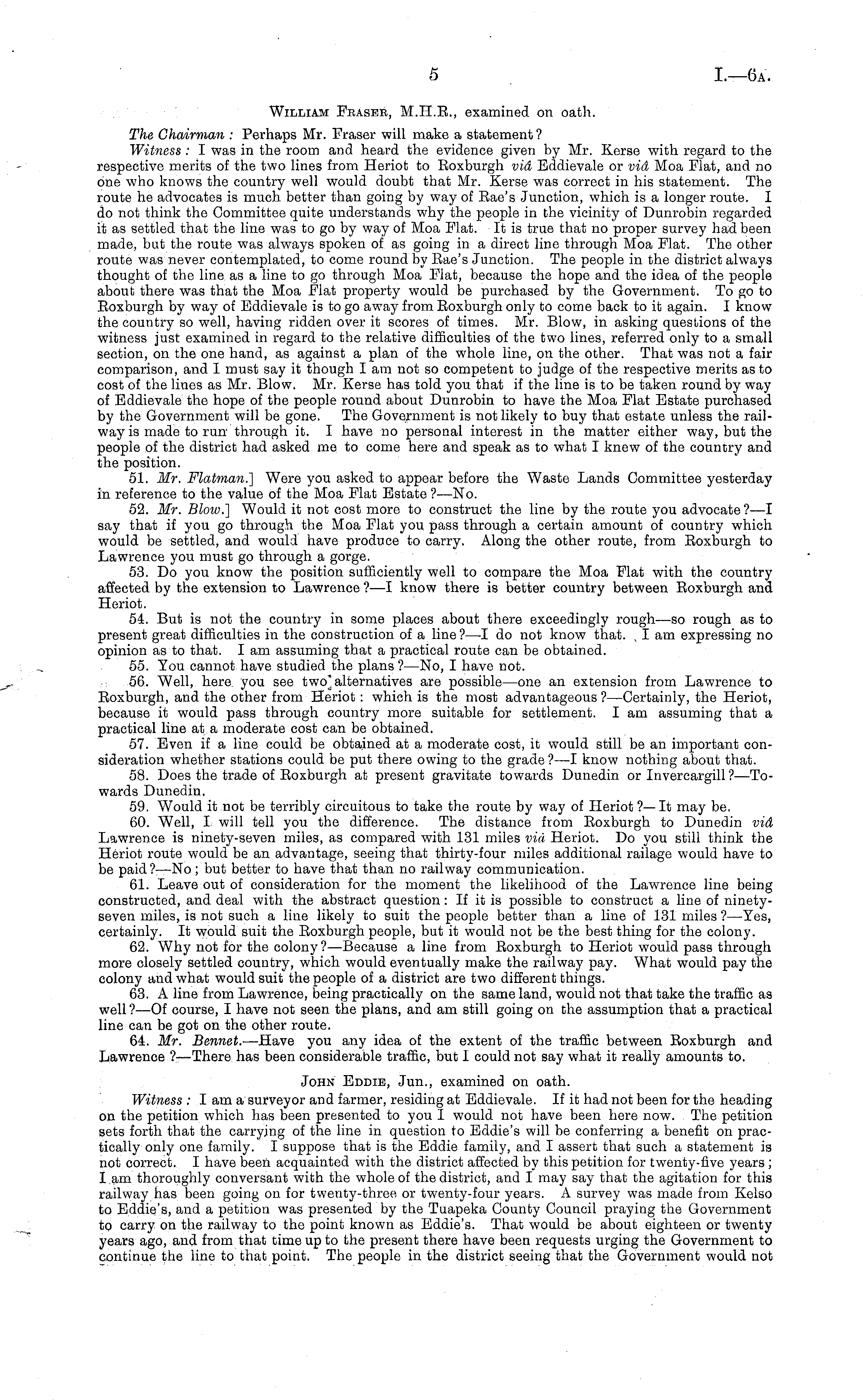 William Peasbe, M.H.E., examined on oath. The Chairman : Perhaps Mr. Fraser will make a statement ? Witness : I was in the room and heard the evidence given by Mr. Kerse with regard to the respective merits of the two lines from Heriot to Eoxburgh via Eddievale or via Moa Flat, and no one who knows the country well would doubt that Mr. Kerse was correct in his statement. The route he advocates is much better than going by way of Eae's Junction, which is a longer route. I do not think the Committee quite understands why the people in the vicinity of Dunrobin regarded it as settled that the line was to go by way of Moa Mat. It is true that no proper survey had been made, bat the route was always spoken of as going in a direct line through Moa Flat. The other route was never contemplated, to come round by Bae's Junction. The people in the district always thought of the line as a line to go through Moa Flat, because the hope and the idea of the people about there was that the Moa Flat property would be purchased by the Government. To go to Eoxburgh by way of Bddievale is to go away from Eoxburgh only to come back to it again. I know the country so well, having ridden over it scores of times. Mr. Blow, in asking questions of the witness just examined in regard to the relative difficulties of the two lines, referred only to a small section, on the one hand, as against a plan of the whole line, on the other. That was not a fair comparison, and I must say it though I am not so competent to judge of the respective merits as to cost of the lines as Mr. Blow. Mr. Kerse has told you that if the line is to be taken round by way of Eddievale the hope of the people round about Dunrobin to have the Moa Flat Estate purchased by the Government will be gone. The Government is not likely to buy that estate unless the railway is made to run , through it. I have no personal interest in the matter either way, but the people of the district had asked me to come here and speak as to what I knew of the country and the position. 51. Mr. Flatman.] Were you asked to appear before the Waste Lands Committee yesterday in reference to the value of the Moa Flat Estate ?—No. 52. Mr. Blow.] Would it not cost more to construct the line by the route you advocate ?—I say that if you go through the Moa Flat you pass through a certain amount of country which would be settled, and would have produce to carry. Along the other route, from Eoxburgh to Lawrence you must go through a gorge. 53. Do you know the position sufficiently well to compare the Moa Flat with the country affected by the extension to Lawrence ?—I know there is better country between Eoxburgh and Heriot. 54. But is not the country in some places about there exceedingly rough—so rough as to present great difficulties in the construction of a line ? —I do not know that. ,I am expressing no opinion as to that. lam assuming that a practical route can be obtained. 55. You cannot have studied the plans?—No, I have not. 56. Well, here you see alternatives are possible—one an extension from Lawrence to Eoxburgh, and the other from Heriot : which is the most advantageous ? —Certainly, the Heriot, because it would pass through country more suitable for settlement. lam assuming that a practical line at a moderate cost can be obtained. 57. Even if a line could be obtained at a moderate cost, it would still be an important consideration whether stations could be put there owing to the grade ?—I know nothing about that. 58. Does the trade of Eoxburgh at present gravitate towards Dunedin or Invercargill'? —Towards Dunedin. 59. Would it not be terribly circuitous to take the route by way of Heriot ?— It may be. 60. Well, I will tell you the difference. The distance from Eoxburgh to Dunedin vid Lawrence is ninety-seven miles, as compared with 131 miles vid Heriot. Do you still think the Heriot route would be an advantage, seeing that thirty-four miles additional railage would have to be paid? —No ; but better to have that than no railway communication. 61. Leave out of consideration for the moment the likelihood of the Lawrence line being constructed, and deal with the abstract question: If it is possible to construct a line of ninetyseven miles, is not such a line likely to suit the people better than a line of 131 miles ? —Yes, certainly. It would suit the Eoxburgh people, but it would not be the best thing for the colony. 62. Why not for the colony?— Because a line from Roxburgh to Heriot would pass through more closely settled country, which would eventually make the railway pay. What would pay the colony and what would suit the people of a district are two different things. 63. A line from Lawrence, being practically on the same land, would not that take the traffic as well ? —Of course, I have not seen the plans, and am still going on the assumption that a practical line can be got on the other route. 64. Mr. Bennet. —Have you any idea of the extent of the traffic between Eoxburgh and Lawrence ?—There has been considerable traffic, but I could not say what it really amounts to. John Eddie, Jun., examined on oath. Witness : lam a surveyor and farmer, residing at Eddievale. If it had not been for the heading on the petition which has been presented to you I would not have been here now. The petition sets forth that the carrying of the line in question to Eddie's will be conferring a benefit on practically only one family. I suppose that is the Eddie family, and I assert that such a statement is not correct. I have been acquainted with the district affected by this petition for twenty-five years ; I am thoroughly conversant with the whole of the district, and I may say that the agitation for this railway has been going on for twenty-three or twenty-four years. A survey was made from Kelso to Eddie's, and a petition was presented by the Tuapeka County Council praying the Government to carry on the railway to the point known as Eddie's. That wou