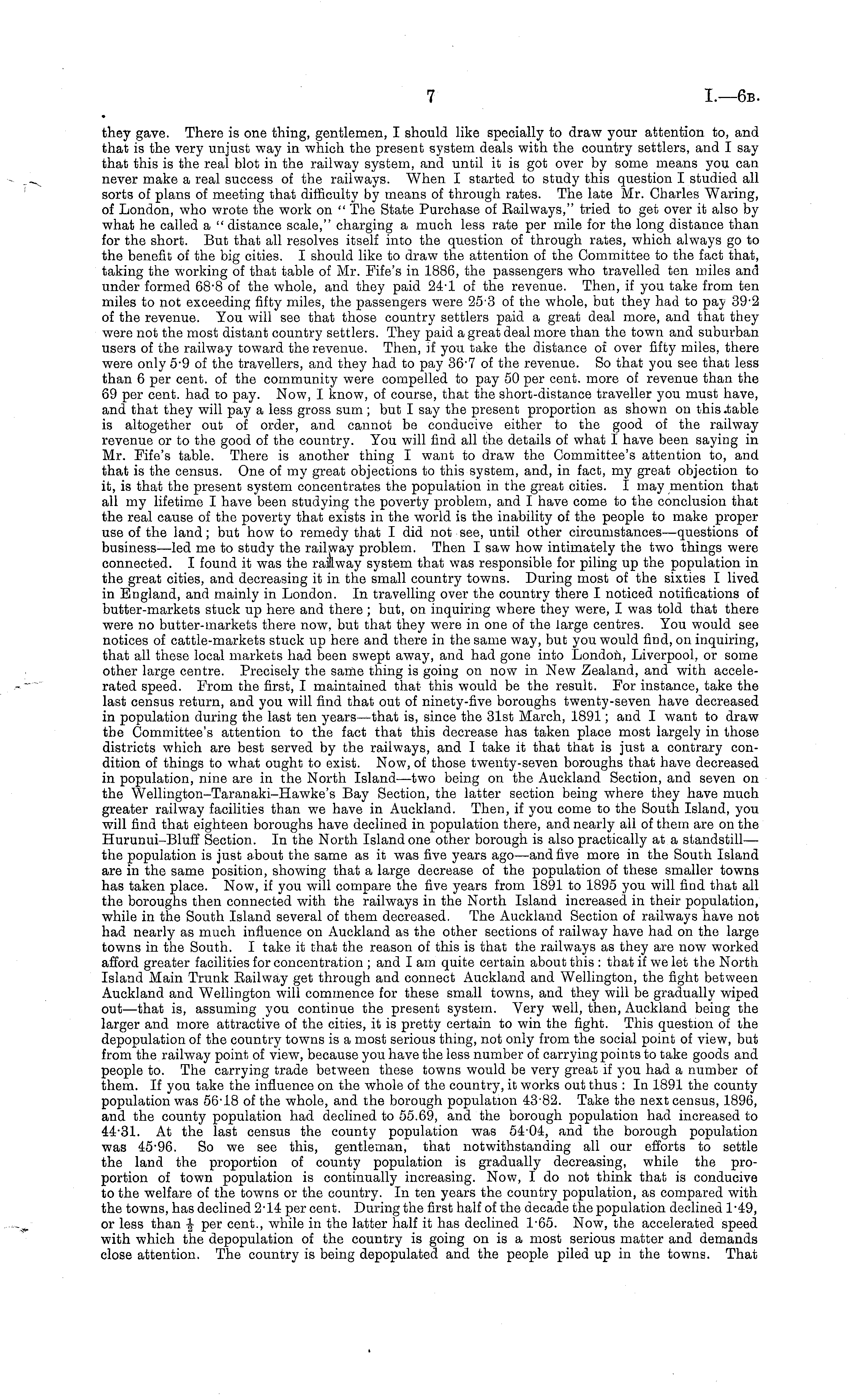 they gave. There is one thing, gentlemen, I should like specially to draw your attention to, and that is the very unjust way in which the present system deals with the country settlers, and I say that this is the real blot in the railway system, and until it is got over by some means you can never make a real success of the railways. When I started to study this question I studied all sorts of plans of meeting that difficulty by means of through rates. The late Mr. Charles Waring, of London, who wrote the work on " The State Purchase of Eailways," tried to get over it also by what he called a " distance scale," charging a much less rate per mile for the long distance than for the short. But that all resolves itself into the question of through rates, which always go to the benefit of the big cities. I should like to draw the attention of the Committee to the fact that, taking the working of that table of Mr. Fife's in 1886, the passengers who travelled ten miles and under formed 68-8 of the whole, and they paid 24-1 of the revenue. Then, if you take from ten miles to not exceeding fifty miles, the passengers were 25-3 of the whole, but they had to pay 39-2 of the revenue. You will see that those country settlers paid a great deal more, and that they were not the most distant country settlers. They paid a great deal more than the town and suburban users of the railway toward the revenue. Then, if you take the distance of over fifty miles, there were only 5-9 of the travellers, and they had to pay 36-7 of the revenue. So that you see that less than 6 per cent, of the community were compelled to pay 50 per cent, more of revenue than the 69 per cent, had to pay. Now, I know, of course, that the short-distance traveller you must have, and that they will pay a less gross sum; but I say the present proportion as shown on this .table is altogether out of order, and cannot be conducive either to the good of the railway revenue or to the good of the country. You will find all the details of what I have been saying in Mr. Fife's table. There is another thing I want to draw the Committee's attention to, and that is the census. One of my great objections to this system, and, in fact, my great objection to it, is that the present system concentrates the population in the great cities. I may mention that all my lifetime I have been studying the poverty problem, and I have come to the conclusion that the real cause of the poverty that exists in the world is the inability of the people to make proper use of the land; but how to remedy that I did not see, until other circumstances—questions of business—led me to study the railway problem. Then I saw how intimately the two things were connected. I found it was the railway system that was responsible for piling up the population in the great cities, and decreasing it in the small country towns. During most of the sixties I lived in England, and mainly in London. In travelling over the country there I noticed notifications of butter-markets stuck up here and there ; but, on inquiring where they were, I was told that there were no butter-markets there now, but that they were in one of the large centres. You would see notices of cattle-markets stuck up here and there in the same way, but you would find, on inquiring, that all these local markets had been swept away, and had gone into London, Liverpool, or some other large centre. Precisely the same thing is going on now in New Zealand, and with accelerated speed. From the first, I maintained that this would be the result. For instance, take the last census return, and you will find that out of ninety-five boroughs twenty-seven have decreased in population during the last ten years —that is, since the 31st March, 1891; and I want to draw the Committee's attention to the fact that this decrease has taken place most largely in those districts which are best served by the railways, and I take it that that is just a contrary condition of things to what ought to exist. Now, of those twenty-seven boroughs that have decreased in population, nine are in the North Island—two being on the Auckland Section, and seven on the Wellington-Taranaki-Hawke's Bay Section, the latter section being where they have much greater railway facilities than we have in Auckland. Then, if you come to the South Island, you will find that eighteen boroughs have declined in population there, and nearly all of them are on the Hurunui-Bluff Section. In the North Island one other borough is also practically at a standstill— the population is just about the same as it was five years ago—and five more in the South Island are in the same position, showing that a large decrease of the population of these smaller towns has taken place. Now, if you will compare the five years from 1891 to 1895 you will find that all the boroughs then connected with the railways in the North Island increased in their population, while in the South Island several of them decreased. The Auckland Section of railways have not had nearly as much influence on Auckland as the other sections of railway have had on the large towns in the South. I take it that the reason of this is that the railways as they are now worked afford greater facilities for concentration ; and I am quite certain about this : that if we let the North Island Main Trunk Eailway get through and connect Auckland and Wellington, the fight between Auckland and Wellington will commence for these small towns, and they will be gradually wiped out—that is, assuming you continue the present system. Very well, then, Auckland being the larger and more attractive of the cities, it is pretty certain to win the fight. This question of the depopulation of the country towns is a most serious thing, not only from the social point of view, but from the railway point of view, because you have the less number of carrying points to take goods and people to. The carrying trade between these towns would be very gr