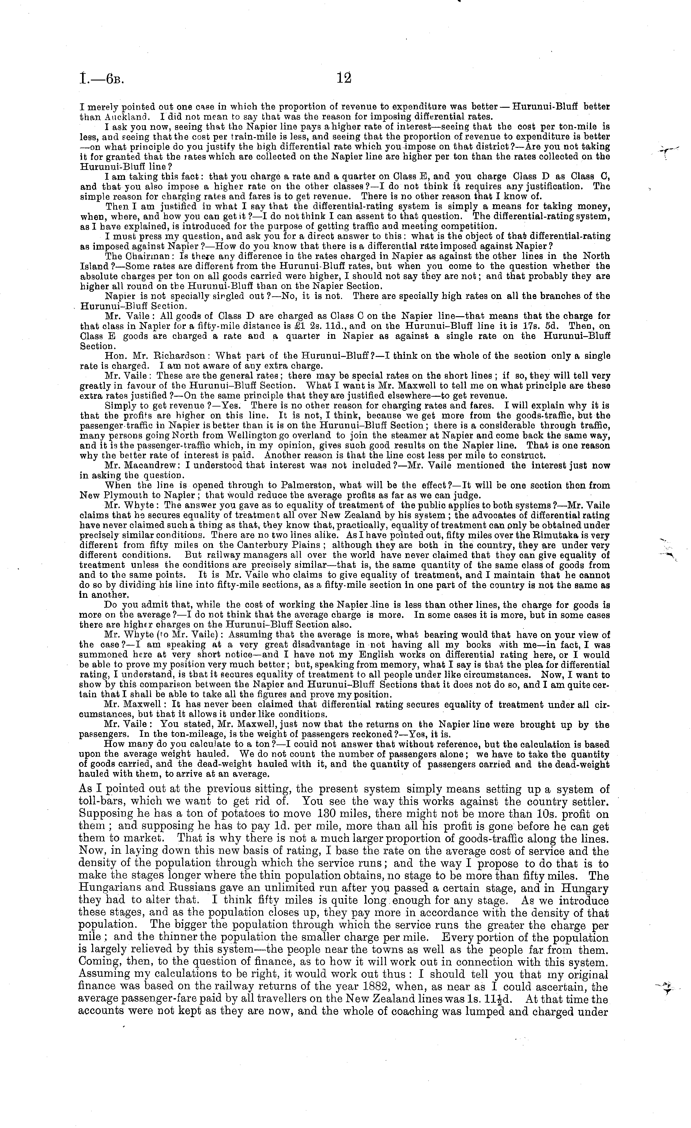 I merely pointed out one ciae in which the proportion of revenue to expenditure was better — Hurunui-Bluff better than Auckland. I did not mean to say that was the reason for imposing differential rates. I ask you now, seeing that the Napier line pays a higher rate of interest—seeing that the cost per ton-mile is less, and seeing that the coat per train-mile is less, and seeing that the proportion of revenue to expenditure is better —on what principle do you justify the high differential rate which you impose on that district?— Are you not taking it for granted that the rates which are collected on the Napier line are higher per ton than the rates collected on the Hurunui-Bluff line ? lam taking this fact: that you charge a rate and a quarter on Glass E, and you oharge Glass D as Glass C, and that you also impose a higher rate on the other classes? —I do not think it requires any justification. The simple reason for charging rates and fares is to get revenue. There is no other reason that I know of. Then I am justified in what I say that the differential-rating system is simply a means for taking money, when, where, and how you can get it ? —I do not think I can assent to that question. The differential-rating system, as I have explained, is introduced for the purpose of getting traffic and meeting competition. I must press my question, and ask you for a direct answer to this: what is the object of that differential-rating as imposed against Napier ? —How do you know that there is a differential rate imposed against Napier ? The Chairman : Is thej-e any difference ia the rates charged in Napier as against the other lines in the North Island ?—Some rates are different from the Hurunui-Bluff rates, but when you oome to the question whether the absolute charges per ton on all goods carried were higher, I should not say they are not; and that probably they are higher all round on the Hurunui-Bluff than on the Napier Section. Napier is not specially singled out ?—No, it is not. There are specially high rates on all the branohes of the Hurunui-Bluff Section. Mr. Vaile : All goods of Glass T> are charged as Glass C on the Napier line—that means that the charge for that olass in Napier for a fifty-mile distance is £1 2s. lid., and on the Hurunui-Bluff line it is 17s. sd. Then, on Class E goods are charged a rate and a quarter in Napier as against a Bingle rate on the Hurunui-Blufi Section. Hon. Mr. Richardson: What part of the Hurunui-Bluff?—l think on the whole of the seotion only a single rate is charged. lam not aware of any extra charge. Mr. Vaile : These are the general rates ; there may be special rates on the short lines ; if so, they will tell very greatly in favour of the Hurunui-Bluff Section. What I want is Mr. Maxwell to tell me on what principle are these extra rates justified ? —On the same principle that they are justified elsewhere—to get revenue. Simply to get revenue ?—Yes. There is no other reason for charging rates and fares. I will explain why it is that the profits are higher on this line. It is not, I think, because we get more from the goods-traffic, but the passenger-traffic in Napier is better than it is on the Hurunui-Bluff Section; there is a considerable through traffic, many persons going North from Wellington go overland to join the steamer at Napier and come back the same way, and it ia the passenger-traffic which, in my opinion, gives such good results on the Napier line. That is one reason why the better rate of interest is paid. Another reason is that the line cost less per mile to construct. Mr. Macandrew: I understood that interest was not included? —Mr. Yaila mentioned the interest just now in asking the question. When the line is opened through to Palmerston, what will be the effect?—lt will be one seotion then from New Plymouth to Napier ; that would reduce the average profits as far as we can judge. Mr. Whyte : The answer you gave as to equality of treatment of the public applies to both systems I—Mr.1 —Mr. Vaile claims that he secures equality of treatment all over New Zealand by his system ; the advocates of differential rating have never claimed such a thing as that, they know that, practically, equality of treatment can only be obtained under precisely similar conditions. There are no two lines alike. As I have pointed out, fifty miles over the Eimutaka is very different from fifty miles on the Canterbury Plains ; although they are both in the country, they are under very different conditions. But railway managers all over the world have never claimed that they can give equality of treatment unless the conditions are precisely similar—that is, the same quantity of the same olass of goods from and to the same points. It is Mr. Vaile who claims to give equality of treatment, and I maintain that he oannot do so by dividing his line into fifty-mile sections, as a fifty-mile section in one part of the country is not the same as in another. Do you admit that, while the cost of working the Napier line is less than other lines, the charge for goods is more on the average?—l do not think that the average charge is more. In some cases it is more, but in some cases there are higher oharges on the Hurunui-Bluff Section also. Mr. Whyte (to Mr. Vaile): Assuming that the average is more, what bearing would that have on your view of the case?—l am speaking at a very great disadvantage in not having all my books with me—in fact, I was summoned here at very short notice—and I have not my English works on differential rating here, or I would be able to prove my position very much better ; but, speaking from memory, what I say ia that the plea for differential rating, I understand, is that it secures equality of treatment to all people under like ciroumstances. Now, I want to show by this comparison between the Napier and Hurunui-Bluff Sections that it does not do so, and I am quite certain that I shall be able to take all t