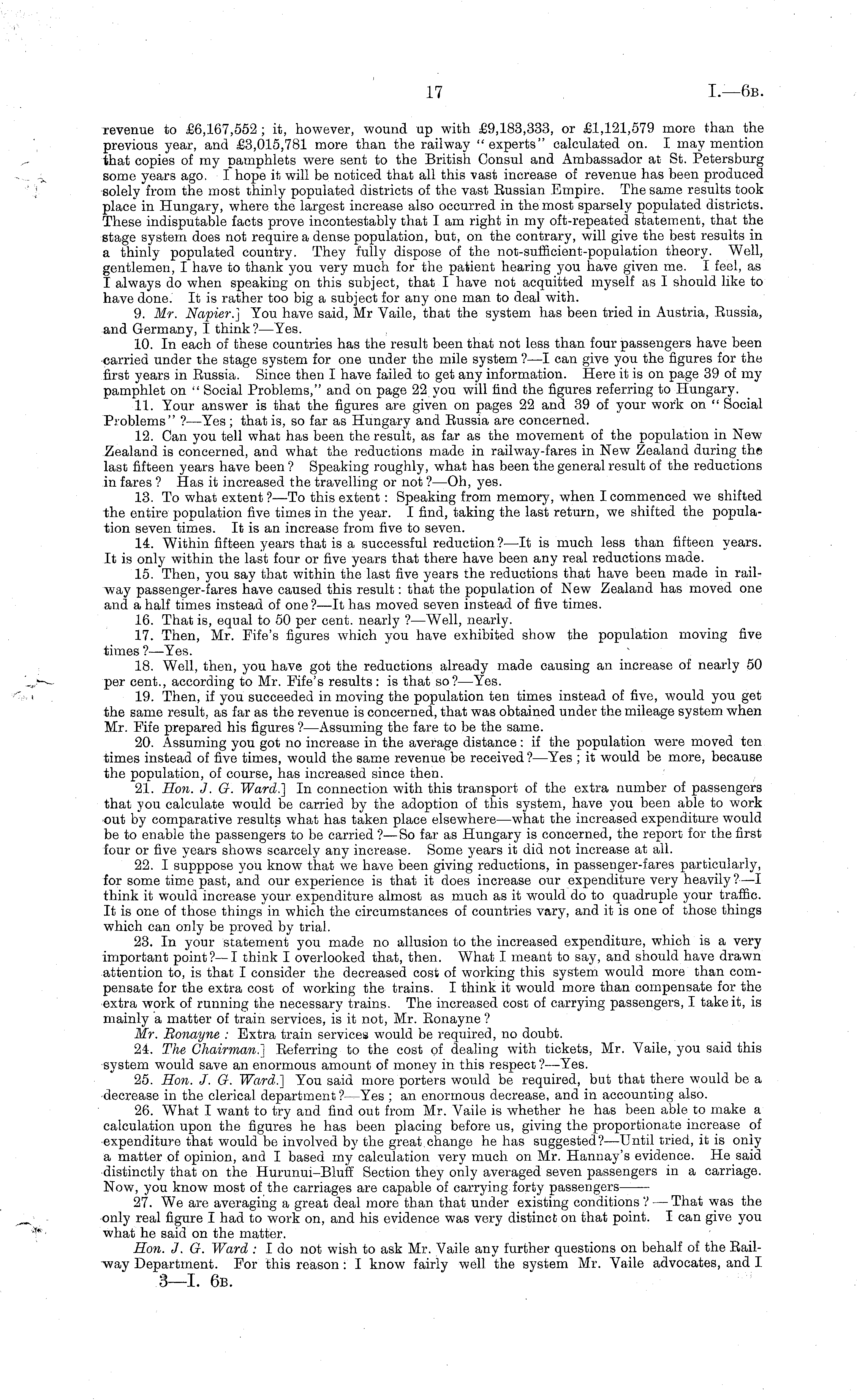 revenue to £6,167,552 ; it, however, wound up with £9,183,333, or £1,121,579 more than the previous year, and £3,015,781 more than the railway "experts" calculated on. I may mention that copies of my Damphlets were sent to the British Consul and Ambassador at St. Petersburg some years ago. I hope it, will be noticed that all this vast increase of revenue has been produced solely from the most thinly populated districts of the vast Russian Empire. The same results took place in Hungary, where the largest increase also occurred in the most sparsely populated districts. These indisputable facts prove incontestably that I am right in my oft-repeated statement, that the stage system does not require a dense population, but, on the contrary, will give the best results in a thinly populated country. They fully dispose of the not-sufficient-population theory. Well, gentlemen, I have to thank you very much for the patient hearing you have given me. I feel, as I always do when speaking on this subject, that I have not acquitted myself as I should like to have done. It is rather too big a subject for any one man to deal with. 9. Mr. Napier.] You have said, Mr Vaile, that the system has been tried in Austria, Eussia, and Germany, I think ? —Yes. 10. In each of these countries has the result been that not less than four passengers have been carried under the stage system for one under the mile system ?—I can give you the figures for the first years in Eussia. Since then I have failed to get any information. Here it is on page 39 of my pamphlet on " Social Problems," and on page 22 you will find the figures referring to Hungary. 11. Your answer is that the figures are given on pages 22 and 39 of your work on " Social Problems" ?—Yes ; that is, so far as Hungary and Eussia are concerned. 12. Can you tell what has been the result, as far as the movement of the population in New Zealand is concerned, and what the reductions made in railway-fares in New Zealand during the last fifteen years have been ? Speaking roughly, what has been the general result of the reductions in fares ? Has it increased the travelling or not ?—Oh, yes. 13. To what extent ? —To this extent : Speaking from memory, when I commenced we shifted the entire population five times in the year. I find, taking the last return, we shifted the population seven times. It is an increase from five to seven. 14. Within fifteen years that is a successful reduction ?—lt is much less than fifteen years. It is only within the last four or five years that there have been any real reductions made. 15. Then, you say that within the last five years the reductions that have been made in railway passenger-fares have caused this result: that the population of New Zealand has moved one and a half times instead of one?—lt has moved seven instead of five times. 16. That is, equal to 50 per cent, nearly ? —Well, nearly. 17. Then, Mr. Fife's figures which you have exhibited show the population moving five times ?—Yes. 18. Well, then, you have got the reductions already made causing an increase of nearly 50 per cent., according to Mr. Fife's results : is that so? —Yes. 19. Then, if you succeeded in moving the population ten times instead of five, would you get the same result, as far as the revenue is concerned, that was obtained under the mileage system when Mr. Fife prepared his figures ?—Assuming the fare to be the same. 20. Assuming you got no increase in the average distance : if the population were moved ten times instead of five times, would the same revenue be received? —Yes ; it would be more, because the population, of course, has increased since then. 21. flora. J. G. Ward.] In connection with this transport of the extra number of passengers that you calculate would be carried by the adoption of this system, have you been able to work ■out by comparative results what has taken place elsewhere —what the increased expenditure would be to enable the passengers to be carried ? —So far as Hungary is concerned, the report for the first four or five years shows scarcely any increase. Some years it did not increase at all. 22. I supppose you know that we have been giving reductions, in passenger-fares particularly, for some time past, and our experience is that it does increase our expenditure very heavily?—l think it would increase your expenditure almost as much as it would do to quadruple your traffic. It is one of those things in which the circumstances of countries vary, and it is one of those things which can only be proved by trial. 23. In your statement you made no allusion to the increased expenditure, which is a very important point?—l think I overlooked that, then. What I meant to say, and should have drawn attention to, is that I consider the decreased cost of working this system would more than compensate for the extra cost of working the trains. I think it would more than compensate for the extra work of running the necessary trains. The increased cost of carrying passengers, I take it, is mainly a matter of train services, is it not, Mr. Eonayne ? Mr. Bonayne : Extra train services would be required, no doubt. 24. The Chairman.] Eeferring to the cost of dealing with tickets, Mr. Yaile, you said this system would save an enormous amount of money in this respect ?—Yes. 25. flora. /. G. Ward.] You said more porters would be required, but that there would be a decrease in the clerical department?— Yes ; an enormous decrease, and in accounting also. 26. What I want to try and find out from Mr. Vaile is whether he has been able to make a calculation upon the figures he has been placing before us, giving the proportionate increase of expenditure that would be involved by the great.change he has suggested?— Until tried, it is only a matter of opinion, and I based my calculation very much on Mr. Hannay's evidence. He said distinctly that on the Hurunui-Bluff Section they only averaged seven passengers in a ca