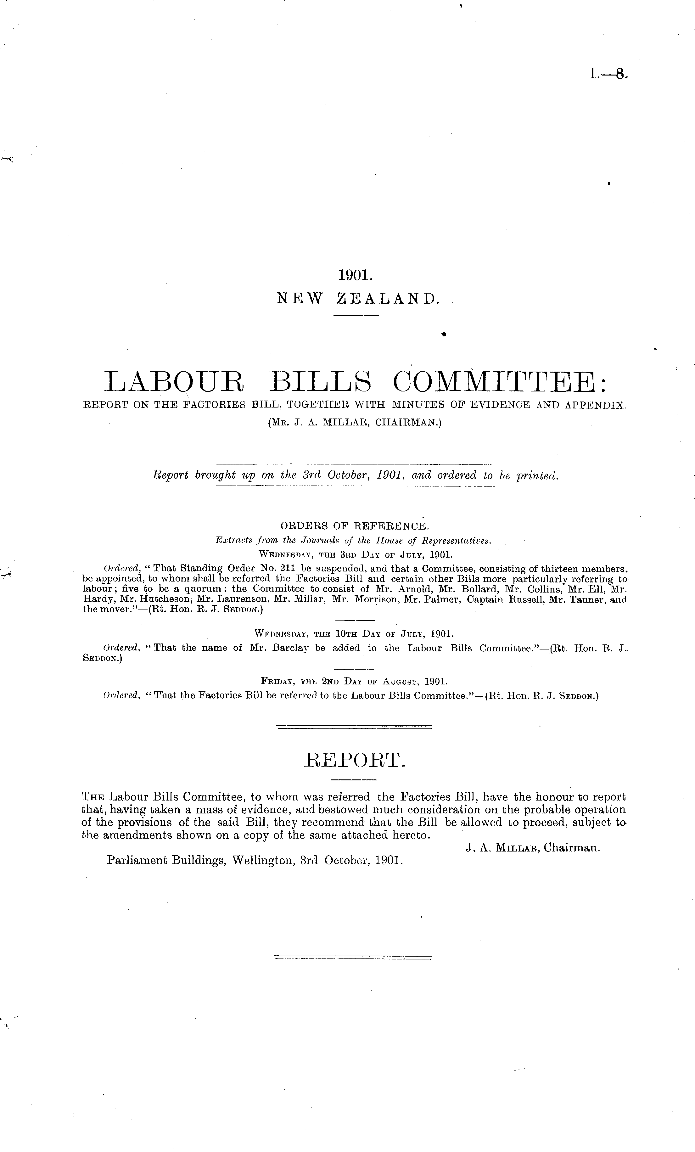 ORDERS OF REFERENCE. Extracts from the Journals of the House of Representatives. Wednesday, the 3rd Day of July, 1901. Ordered, " That Standing Order No. 211 be suspended, and that a Committee, consisting of thirteen members, be appointed, to whom shall be referred the Factories Bill and certain other Bills more particularly referring to labour; five to be a quorum : the Committee to consist of Mr. Arnold, Mr. Bollard, Mr. Collins, Mr. Ell, Mr. Hardy, Mr. Hutcheson, Mr. Laurenson, Mr. Millar, Mr. Morrison, Mr. Palmer, Captain Russell, Mr. Tanner, and the mover."—(Rt. Hon. R. J. Seddon.)