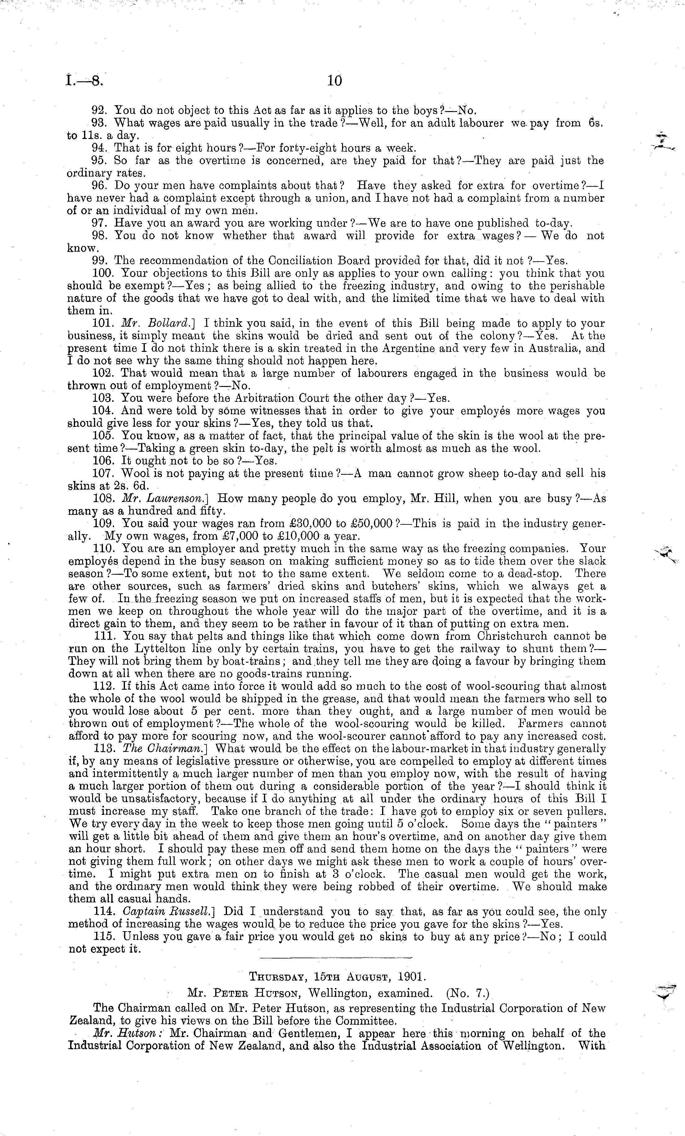 Thursday, 15th August, 1901. Mr. Pbtbb Hutson, Wellington, examined. (No. 7.) The Chairman called on Mr. Peter Hutson, as representing the Industrial Corporation of New Zealand, to give his views on the Bill before the Committee. Mr. Hutson: Mr. Chairman and Gentlemen, I appear here this morning on behalf of the Industrial Corporation of New Zealand, and also the Industrial Association of Wellington. With