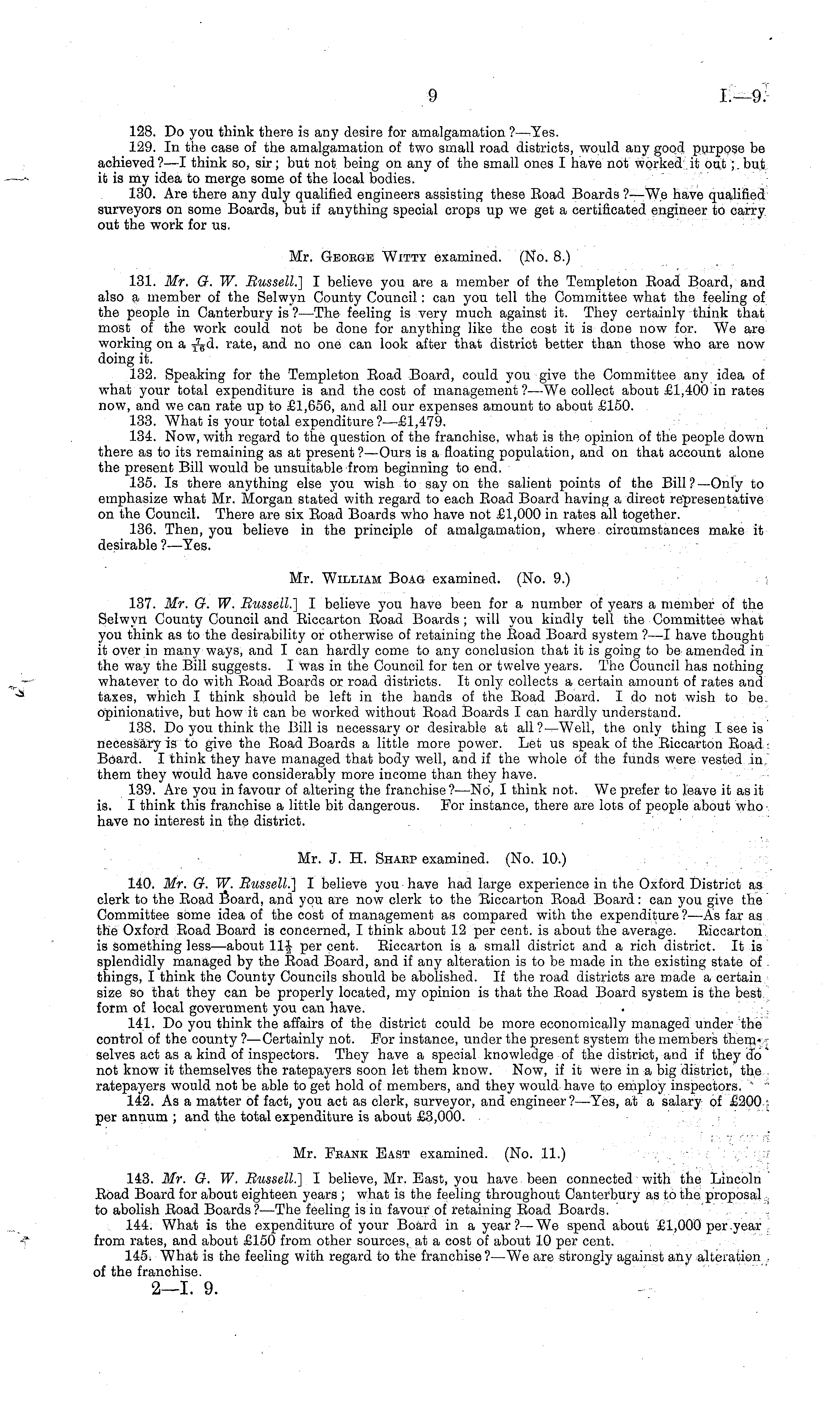 128. Do you think there is any desire for amalgamation ? —Yes. 129. In the case of the amalgamation of two small road districts, would any good purpose be achieved?—l think so, sir; but not being on any of the small ones I have not worked it out;.but, it is my idea to merge some of the local bodies. 130. Are there any duly qualified engineers assisting these Boad Boards ?—We have qualified surveyors on some Boards, but if anything special crops up we get a certificated engineer to carry out the work for us. Mr. George Witty examined. (No. 8.) 131. Mr. G. W. Russell.] I believe you are a member of the Templeton Boad Board, and also a member of the Selwyn County Council: can you tell the Committee what the feeling of the people in Canterbury is ? —The feeling is very much against it. They certainly think that most of the work could not be done for anything like the cost it is done now for. We are working on a rate, and no one can look after that district better than those who are now doing it. 132. Speaking for the Templeton Boad Board, could you give the Committee any idea of what your total expenditure is and the cost of management ?—We collect about £1,400 in rates now, and we can rate up to £1,656, and all our expenses amount to about £150. 133. What is your total expenditure?—£l,479. 134. Now, with regard to the question of the franchise, what is the opinion of the people down there as to its remaining as at present ?—Ours is a floating population, and on that account alone the present Bill would be unsuitable from beginning to end. 135. Is there anything else you wish to say on the salient points of the Bill?— Only to emphasize what Mr. Morgan stated with regard to each Boad Board having a direct representative on the Council. There are six Boad Boards who have not £1,000 in rates all together. 136. Then, you believe in the principle of amalgamation, where circumstances make it desirable ?—Yes. Mr. William Boag examined. (No. 9.) • 137. Mr. G. W. Russell.] I believe you have been for a number of years a member of the Selwyn County Council and Biccarton Boad Boards ; will you kindly tell the Committee what you think as to the desirability or otherwise of retaining the Boad Board system ?—I have thought it over in many ways, and I can hardly come to any conclusion that it is going to be amended in the way the Bill suggests. I was in the Council for ten or twelve years. The Council has nothing whatever to do with Boad Boards or road districts. It only collects a certain amount of rates and taxes, which I think should be left in the hands of the Boad Board. I do not wish to be. opinionative, but how it can be worked without Boad Boards I can hardly understand. 138. Do you think the Bill is necessary or desirable at all?— Well, the only thing I see is necessary is to give the Boad Boards a little more power. Let us speak of the Biccarton Boad Board. I think they have managed that body well, and if the whole of the funds were vested in. them they would have considerably more income than they have. 139. Are you in favour of altering the franchise ?—No, I think not. We prefer to leave it as it is. I think this franchise a little bit dangerous. For instance, there are lots of people about who have no interest in the district. . - ■ Mr. J. H. Sharp examined. (No. 10.) 140. Mr. G. W. Russell.] I believe you have had large experience in the Oxford District as clerk to the Boad Board, and you are now clerk to the Biccarton Boad Board: can you give the Committee some idea of the cost of management as compared with the expenditure?—As far as the Oxford Boad Board is concerned, I think about 12 per cent, is about the average. Biccarton is something less—about llf per cent. Biccarton is a small district and a rich district. It is splendidly managed by the Boad Board, and if any alteration is to be made in the existing state of things, I think the County Councils should be abolished. If the road districts are made a certain size so that they can be properly located, my opinion is that the Boad Board system is the best form of local government you can have. 141. Do you think the affairs of the district could be more economically managed under the control of the county ?—Certainly not. For instance, under the present system the members them* selves act as a kind of inspectors. They have a special knowledge of the district, and if they do not know it themselves the ratepayers soon let them know. Now, if it were in a big district, the ratepayers would not be able to get hold of members, and they would have to employ inspectors. k 142. As a matter of fact, you act as clerk, surveyor, and engineer?— Yes, at a salary of £200 per annum ; and the total expenditure is about £3,000. Mr. Frank East examined. (No. 11.) - .;,.': 143. Mr. G. W. Russell.] I believe, Mr. East, you have been connected with the Lincoln Boad Board for about eighteen years ; what is the feeling throughout Canterbury as to the proposal to abolish Boad Boards?— The feeling is in favour of retaining Boad Boards. 144. What is the expenditure of your Board in a year?—We spend about £1,000 per year from rates, and about £150 from other sources, at a cost of about 10 per cent. 145. What is the feeling with regard to the franchise?—We are strongly against any alteration of the franchise. 2—l. 9.