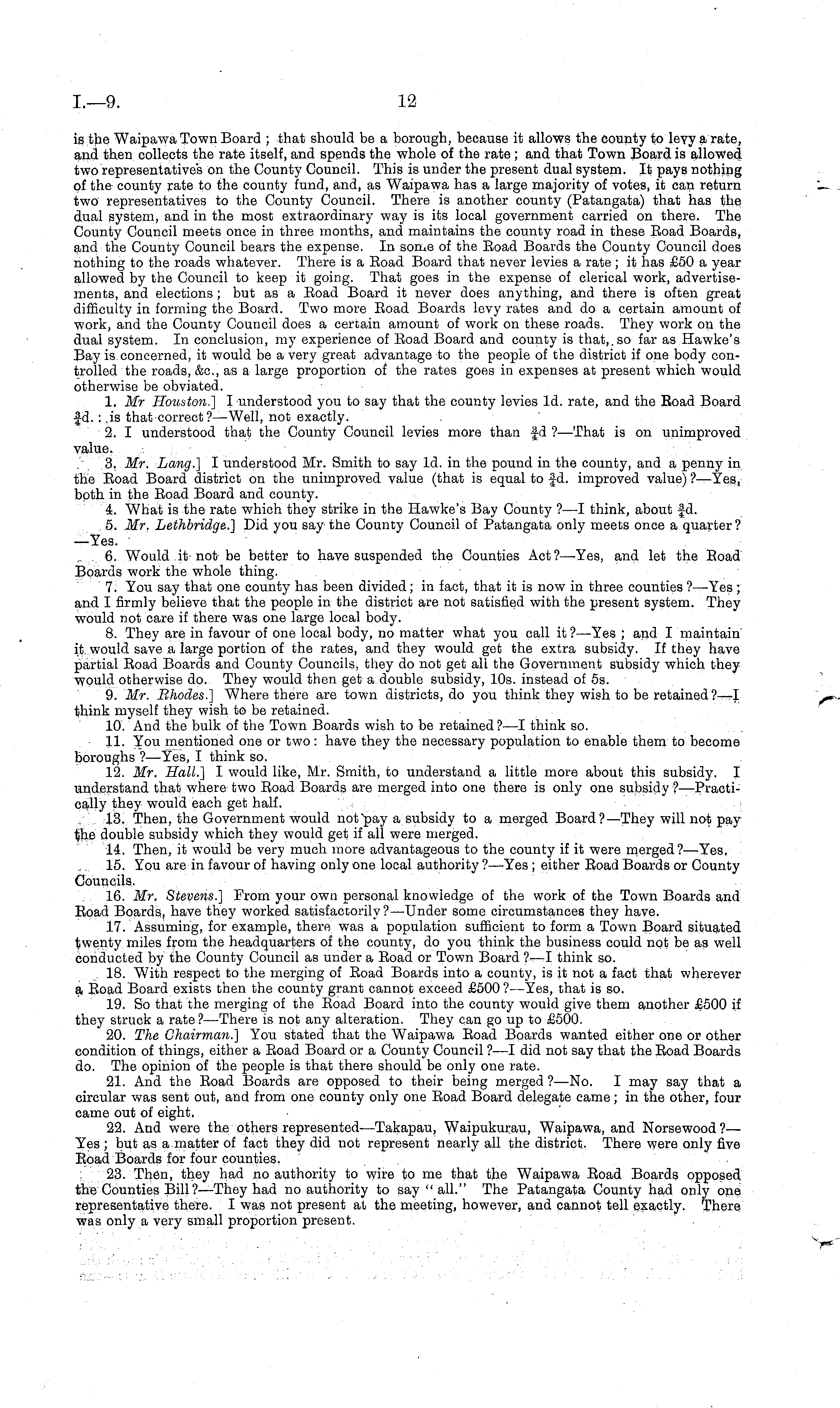 is the Waipawa Town Board ; that should be a borough, because it allows the county to levy a rate, and then collects the rate itself, and spends the whole of the rate ; and that Town Board is allowed two representatives on the County Council. This is under the present dual system. It pays nothing of the county rate to the county fund, and, as Waipawa has a large majority of votes, it can return two representatives to the County Council. There is another county (Patangata) that has the dual system, and in the most extraordinary way is its local government carried on there. The County Council meets once in three months, and maintains the county road in these Boad Boards, and the County Council bears the expense. In some of the Boad Boards the County Council does nothing to the roads whatever. There is a Boad Board that never levies a rate ; it has £50 a year allowed by the Council to keep it going. That goes in the expense of clerical work, advertisements, and elections ; but as a Boad Board it never does anything, and there is often great difficulty in forming the Board. Two more Boad Boards levy rates and do a certain amount of work, and the County Council does a certain amount of work on these roads. They work on the dual system. In conclusion, my experience of Boad Board and county is that,, so far as Hawke's Bay is concerned, it would be a very great advantage to the people of the district if one body controlled the roads, &c, as a large proportion of the rates goes in expenses at present which would otherwise be obviated. 1. Mr Houston.] I understood you to say that the county levies Id. rate, and the Boad Board fd. : is that correct? —Well, not exactly. 2. I understood that the County Council levies more than fd ? —That is on unimproved value. 3. Mr. Lang.] I understood Mr. Smith to say Id. in the pound in the county, and a penny in the Boad Board district on the unimproved value (that is equal to fd. improved value) ? —Yes, both in the Boad Board and county. 4. What is the rate which they strike in the Hawke's Bay County ?—I think, about fd. 5. Mr. Lethbridge.] Did you say the County Council of Patangata only meets once a quarter? —Yes. _ .. 6. Would it-not be better to have suspended the Counties Act?— Yes, and let the Boad Boards work the whole thing. 7. You say that one county has been divided; in fact, that it is now in three counties ?—Yes ; and I firmly believe that the people in the district are not satisfied with the present system. They would not care if there was one large local body. 8. They are in favour of one local body, no matter what you call it ?—Yes ; and I maintain' it. would save a large portion of the rates, and they would get the extra subsidy. If they have partial Boad Boards and County Councils, they do not get all the Government subsidy which they would otherwise do. They would then get a double subsidy, 10s. instead of ss. 9. Mr. Rhodes.] Where there are town districts, do you think they wish to be retained think myself they wish to be retained. 10". And the bulk of the Town Boards wish to be retained ? —I think so. 11. You mentioned one or two: have they the necessary population to enable them to become boroughs ?—Yes, I think so. 12. Mr. Hall.] I would like, Mr. Smith, to understand a little more about this subsidy. I understand that where two Boad Boards are merged into one there is only one subsidy ?—Practically they would each get half. .; . 13. Then, the Government would not "pay a subsidy to a merged Board?— They will not pay the double subsidy which they would get if all were merged. 14. Then, it would be very much more advantageous to the county if it were merged?— Yes, 15. You are in favour of having only one local authority ?—Yes ; either Boad Boards or County Councils. 16. Mr. Stevens.] From your own personal knowledge of the work of the Town Boards and Boad Boards, have they worked satisfactorily ?—Under some circumstances they have. 17. Assuming, for example, there was a population sufficient to form a Town Board situated twenty miles from the headquarters of the county, do you think the business could not be as well conducted by the County Council as under a Boad or Town Board ?—I think so. 18. With respect to the merging of Boad Boards into a county, is it not a fact that wherever a Boad Board exists then the county grant cannot exceed £500 ?—Yes, that is so. 19. So that the merging of the Boad Board into the county would give them another £500 if they struck a rate ? —There is not any alteration. They can go up to £500. 20. The Chairman.] You stated that the Waipawa Boad Boards wanted either one or other condition of things, either a Boad Board or a County Council ? —I did not say that the Boad Boards do. The opinion of the people is that there should be only one rate. 21. And the Boad Boards are opposed to their being merged ?—No. I may say that a circular was sent out, and from one county only one Boad Board delegate came; in the other, four came out of eight. 22. And were the others represented—Takapau, Waipukurau, Waipawa, and Norsewood ?— Yes ; but as a matter of fact they did not represent nearly all the district. There were only five Boad Boards for four counties. 23. Then, they had no authority to wire to me that the Waipawa Boad Boards opposed the Counties Bill ?—They had no authority to say "all." The Patangata County had only one representative there. I was not present at the meeting, however, and cannot tell exactly. There was only a very small proportion present.