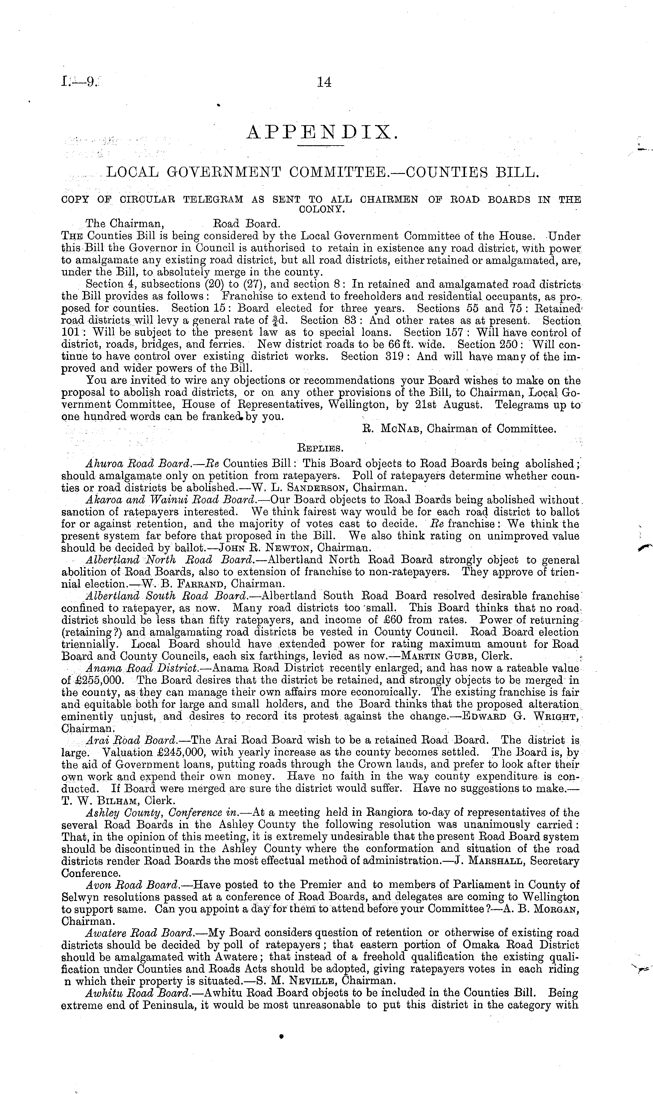 LOCAL GOVEBNMENT COMMITTEE.—COUNTIES BILL. COPY OF CIRCULAR TELEGRAM AS SENT TO ALL CHAIRMEN OF ROAD BOARDS IN THE COLONY. The Chairman, Boad Board. The Counties Bill is being considered by the Local Government Committee of the House. Under this Bill the Governor in Council is authorised to retain in existence any road district, with power to amalgamate any existing road district, but all road districts, either retained or amalgamated, are, under the Bill, to absolutely merge in the county. Section 4, subsections (20) to (27), and section 8 : In retained and amalgamated road districts the Bill provides as follows : Franchise to extend to freeholders and residential occupants, as proposed for counties. Section 15: Board elected for three years. Sections 55 and 75 : Betained road districts will levy a general rate of fd. Section 83 : And other rates as at present. Section 101 : Will be subject to the present law as to special loans. Section 157 : Will have control of district, roads, bridges, and ferries. New district roads to be 66 ft. wide. Section 250 : Will continue to have control over existing district works. Section 319: And will have man yof the improved and wider powers of the Bill. You are invited to wire any objections or recommendations your Board wishes to make on the proposal to abolish road districts, or on any other provisions of the Bill, to Chairman, Local Government Committee, House of Bepresentatives, Wellington, by 21st August. Telegrams up to one hundred words can be franked, by you. ' ■ ; , B. McNab, Chairman of Committee. Beplies. Ahuroa Road Board. — Re Counties Bill: This Board objects to Boad Boards being abolished; should amalgamate only on petition from ratepayers. Poll of ratepayers determine whether counties or road districts be abolished. —W. L. Sanderson, Chairman. Akaroa and Wainui Road Board. —Our Board objects to Boad Boards being abolished without sanction of ratepayers interested. We think fairest way would be for each road district to ballot for or against retention, and the majority of votes cast to decide. Re franchise :We think the present system far before that proposed in the Bill. We also think rating on unimproved value should be decided by ballot.—John B. Newton, Chairman. Albertland North Road Board. —Albertland North Boad Board strongly object to general abolition of Boad Boards, also to extension of franchise to non-ratepayers. They approve of triennial election.—W. B. Farrand, Chairman. Albertland South Road Board. —Albertland South Boad Board resolved desirable franchise confined to ratepayer, as now. Many road districts too small. This Board thinks that no road district should be less than fifty ratepayers, and income of £60 from rates. Power of returning (retaining?) and amalgamating road districts be vested in County Council. Boad Board election triennially. Local Board should have extended power for rating maximum amount for Boad Board and County Councils, each six farthings, levied as now. —-Martin Gubb, Clerk. Anama Road District. —Anama Boad District recently enlarged, and has now a rateable value of £255,000. The Board desires that the district be retained, and strongly objects to be merged in the county, as they can manage their own affairs more economically. The existing franchise is fair and equitable both for large and small holders, and the Board thinks that the proposed alteration eminently unjust, and desires to record its protest against the change.—-Edward G. Wright, Chairman. Arai Road Board. —The Arai Boad Board wish to be a retained Boad Board. The district is large. Valuation £245,000, with yearly increase as the county becomes settled. The Board is, by the aid of Government loans, putting roads through the Crown lands, and prefer to look after their own work and expend their own money. Have no faith in the way county expenditure is conducted. If Board were merged are sure the district would suffer. Have no suggestions to make.— T. W. Bilham, Clerk. Ashley County, Conference in. —At a meeting held in Bangiora to-day of representatives of the several Boad Boards in the Ashley County the following resolution was unanimously carried : That, in the opinion of this meeting, it is extremely undesirable that the present Boad Board system should be discontinued in the Ashley County where the conformation and situation of the road districts render Boad Boards the most effectual method of administration. —J. Marshall, Secretary Conference. Avon Road Board. —Have posted to the Premier and to members of Parliament in County of Selwyn resolutions passed at a conference of Boad Boards, and delegates are coming to Wellington to support same. Can you appoint a day for them to attend before your Committee ?—-A. B. Morgan, Chairman. Awatere Road Board. —My Board considers question of retention or otherwise of existing road districts should be decided by poll of ratepayers ; that eastern portion of Omaka Boad District should be amalgamated with Awatere; that instead of a freehold qualification the existing qualification under Counties and Boads Acts should be adopted, giving ratepayers votes in each riding n which their property is situated.—S. M. Neville, Chairman. Awhitu Road Board. —Awhitu Boad Board objects to be included in the Counties Bill. Being extreme end of Peninsula, it would be most unreasonable to put this district in the category with