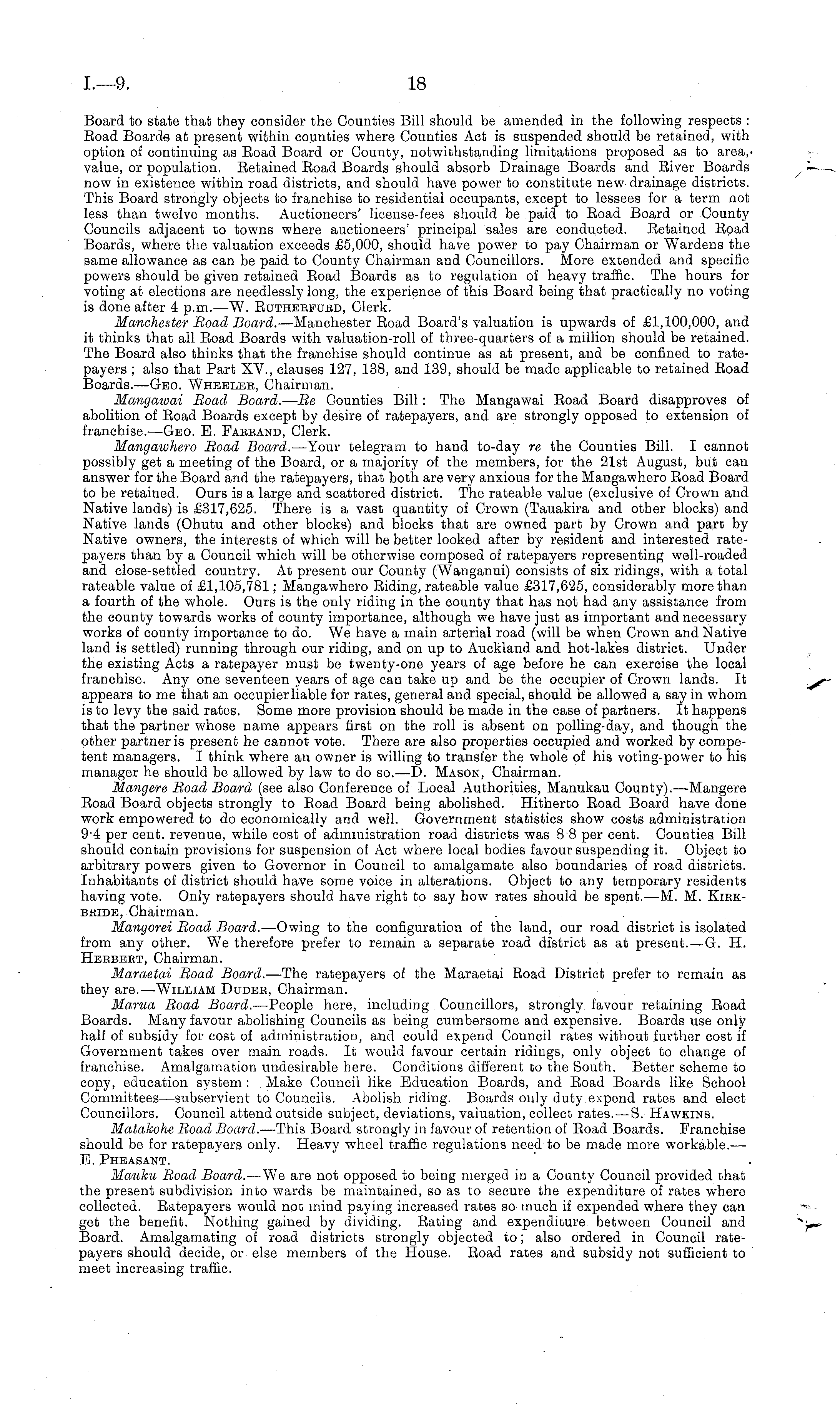 Board to state that they consider the Counties Bill should be amended in the following respects : Boad Boards at present within counties where Counties Act is suspended should be retained, with option of continuing as Boad Board or County, notwithstanding limitations proposed as to area,' value, or population. Betained Boad Boards should absorb Drainage Boards and Biver Boards now in existence within road districts, and should have power to constitute new- drainage districts. This Board strongly objects to franchise to residential occupants, except to lessees for a term not less than twelve months. Auctioneers' license-fees should be paid to Boad Board or County Councils adjacent to towns where auctioneers' principal sales are conducted. Betained Boad Boards, where the valuation exceeds £5,000, should have power to pay Chairman or Wardens the same allowance as can be paid to County Chairman and Councillors. More extended and specific powers should be given retained Boad Boards as to regulation of heavy traffic. The hours for voting at elections are needlessly long, the experience of this Board being that practically no voting is done after 4 p.m.—W. Butherfurd, Clerk. Manchester Road Board. —Manchester Boad Board's valuation is upwards of £1,100,000, and it thinks that all Boad Boards with valuation-roll of three-quarters of a million should be retained. The Board also thinks that the franchise should continue as at present, and be confined to ratepayers ; also that Part XV., clauses 127, 138, and 139, should be made applicable to retained Boad Boards.—Geo. Wheeler, Chairman. Mangawai Road Board. — Re Counties Bill: The Mangawai Boad Board disapproves of abolition of Boad Boards except by desire of ratepayers, and are strongly opposed to extension of franchise.—Geo. E. Farrand, Clerk. Mangaiuhero Road Board. —Your telegram to hand to-day re the Counties Bill. I cannot possibly get a meeting of the Board, or a majority of the members, for the 21st August, but can answer for the Board and the ratepayers, that both are very anxious for the Mangawhero Boad Board to be retained. Ours is a large and scattered district. The rateable value (exclusive of Crown and Native lands) is £317,625. There is a vast quantity of Crown (Tauakira and other blocks) and Native lands (Ohutu and other blocks) and blocks that are owned part by Crown and part by Native owners, the interests of which will be better looked after by resident and interested ratepayers than by a Council which will be otherwise composed of ratepayers representing well-roaded and close-settled country. At present our County (Wanganui) consists of six ridings, with a total rateable value of £1,105,781; Mangawhero Biding, rateable value £317,625, considerably more than a fourth of the whole. Ours is the only riding in the county that has not had any assistance from the county towards works of county importance, although we have just as important and necessary works of county importance to do. We have a main arterial road (will be when Crown and Native land is settled) running through our riding, and on up to Auckland and hot-lakes district. Under the existing Acts a ratepayer must be twenty-one years of age before he can exercise the local franchise. Any one seventeen years of age can take up and be the occupier of Crown lands. It appears to me that an occupier liable for rates, general and special, should be allowed a say in whom is to levy the said rates. Some more provision should be made in the case of partners. It happens that the partner whose name appears first on the roll is absent on polling-day, and though the other partner is present he cannot vote. There are also properties occupied and worked by competent managers. I think where an owner is willing to transfer the whole of his voting-power to his manager he should be allowed by law to do so.—D. Mason, Chairman. Mangere Road Board (see also Conference of Local Authorities, Manukau County).—Mangere Boad Board objects strongly to Boad Board being abolished. Hitherto Boad Board have done work empowered to do economically and well. Government statistics show costs administration 9-4 per cent, revenue, while cost of administration road districts was 8 8 per cent. Counties Bill should contain provisions for suspension of Act where local bodies favour suspending it. Object to arbitrary powers given to Governor in Council to amalgamate also boundaries of road districts. Inhabitants of district should have some voice in alterations. Object to any temporary residents having vote. Only ratepayers should have right to say how rates should be spent.—M. M. Kirkbride, Chairman. Mangorei Road Board. —Owing to the configuration of the land, our road district is isolated from any other. We therefore prefer to remain a separate road district as at present.—G. H. Herbert, Chairman. Maraetai Road Board. —The ratepayers of the Maraetai Boad District prefer to remain as they are.—William Duder, Chairman. Marua Road Board. —People here, including Councillors, strongly favour retaining Boad Boards. Many favour abolishing Councils as being cumbersome and expensive. Boards use only half of subsidy for cost of administration, and could expend Council rates without further cost if Government takes over main roads. It would favour certain ridings, only object to change of franchise. Amalgamation undesirable here. Conditions different to the South. Better scheme to copy, education system : Make Council like Education Boards, and Boad Boards like School Committees—subservient to Councils. Abolish riding. Boards only duty expend rates and elect Councillors. Council attend outside subject, deviations, valuation, collect rates.—S. Hawkins. Matakohe Road Board. —This Board strongly in favour of retention of Boad Boards. Franchise should be for ratepayers only. Heavy wheel traffic regulations need to be made more workable. — E. Pheasant. Mauku Road Board. —We are not oppos
