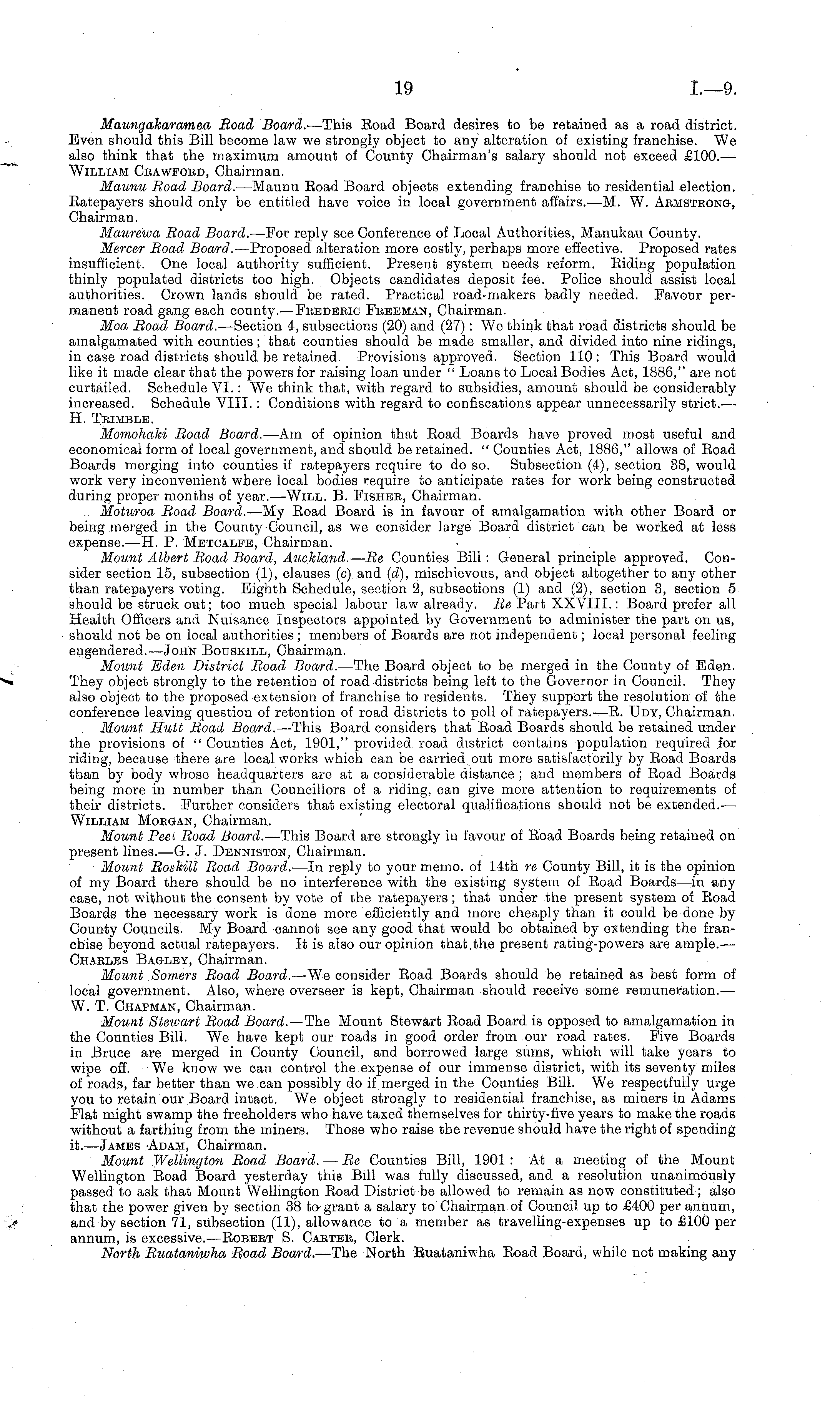 Maungakaramea Road Board.- —This Boad Board desires to be retained as a road district. Even should this Bill become law we strongly object to any alteration of existing franchise. We also think that the maximum amount of County Chairman's salary should not exceed £100.-— William Crawford, Chairman. Maunu Road Board. —Maunu Boad Board objects extending franchise to residential election. Batepayers should only be entitled have voice in local government affairs.—M. W. Armstrong, Chairman. Maurewa Road Board. —For reply see Conference of Local Authorities, Manukau County. Mercer Road Board. —Proposed alteration more costly, perhaps more effective. Proposed rates insufficient. One local authority sufficient. Present system needs reform. Biding population thinly populated districts too high. Objects candidates deposit fee. Police should assist local authorities. Crown lands should be rated. Practical road-makers badly needed. Favour permanent road gang each county. —Frederic Freeman, Chairman. Moa Road Board. —Section 4, subsections (20) and (27) : We think that road districts should be amalgamated with counties; that counties should be made smaller, and divided into nine ridings, in case road districts should be retained. Provisions approved. Section 110 : This Board would like it made clear that the powers for raising loan under " Loans to Local Bodies Act, 1886," are not curtailed. Schedule VI. :We think that, with regard to subsidies, amount should be considerably increased. Schedule VIII. : Conditions with regard to confiscations appear unnecessarily strict.— H. Trimble. Momohaki Road Board. —Am of opinion that Boad Boards have proved most useful and economical form of local government, and should be retained. " Counties Act, 1886," allows of Boad Boards merging into counties if ratepayers require to do so. Subsection (4), section 38, would work very inconvenient where local bodies require to anticipate rates for work being constructed during proper months of year.—Will. B. Fisher, Chairman. Moturoa Road Board. —My Boad Board is in favour of amalgamation with other Board or being merged in the County Council, as we consider large Board district can be worked at less expense. —H. P. Metcalfe, Chairman. Mount Albert Road Board, Auckland. — Re Counties Bill : General principle approved. Consider section 15, subsection (1), clauses (c) and (d), mischievous, and object altogether to any other than ratepayers voting. Eighth Schedule, section 2, subsections (1) and (2), section 3, section 5 should be struck out; too much special labour law already. Re Part XXVIII.: Board prefer all Health Officers and Nuisance Inspectors appointed by Government to administer the part on us, should not be on local authorities; members of Boards are not independent; local personal feeling engendered. —John Bouskill, Chairman. Mount Eden District Road Board. —The Board object to be merged in the County of Eden. They object strongly to the retention of road districts being left to the Governor in Council. They also object to the proposed extension of franchise to residents. They support the resolution of the conference leaving question of retention of road districts to poll of ratepayers. —B. Udy, Chairman. Mount Hutt Road Board. —This Board considers that Boad Boards should be retained under the provisions of " Counties Act, 1901," provided road district contains population required for riding, because there are local works which can be carried out more satisfactorily by Boad Boards than by body whose headquarters are at a considerable distance ; and members of Boad Boards being more in number than Councillors of a riding, can give more attention to requirements of their districts. Further considers that existing electoral qualifications should not be extended.— William Morgan, Chairman. Mount Peel. Road Board. —This Board are strongly in favour of Boad Boards being retained on present lines.—G. J. Denniston, Chairman. Mount Roskill Road Board. —In reply to your memo, of 14th re County Bill, it is the opinion of my Board there should be no interference with the existing system of Boad Boards—in any case, not without the consent by vote of the ratepayers; that under the present system of Boad Boards the necessary work is done more efficiently and more cheaply than it could be done by County Councils. My Board cannot see any good that would be obtained by extending the franchise beyond actual ratepayers. It is also our opinion that.the present rating-powers are ample.— Charles Bagley, Chairman. Mount Somers Road Board. —We consider Boad Boards should be retained as best form of local government. Also, where overseer is kept, Chairman should receive some remuneration.— W. T. Chapman, Chairman. Mount Stewart Road Board. —The Mount Stewart Boad Board is opposed to amalgamation in the Counties Bill. We have kept our roads in good order from our road rates. Five Boards in Bruce are merged in County Council, and borrowed large sums, which will take years to wipe off. We know we can control the expense of our immense district, with its seventy miles of roads, far better than we can possibly do if merged in the Counties Bill. We respectfully urge you to retain our Board intact. We object strongly to residential franchise, as miners in Adams Flat might swamp the freeholders who have taxed themselves for thirty-five years to make the roads without a farthing from the miners. Those who raise the revenue should have the right of spending it.—James Adam, Chairman. Mount Wellington Road Board. —Re Counties Bill, 1901 : At a meeting of the Mount Wellington Boad Board yesterday this Bill was fully discussed, and a resolution unanimously passed to ask that Mount Wellington Boad District be allowed to remain as now constituted; also that the power given by section 38 to grant a salary to Chairman of Council up to £400 per annum, and by section 71, subsection (11), allowance t