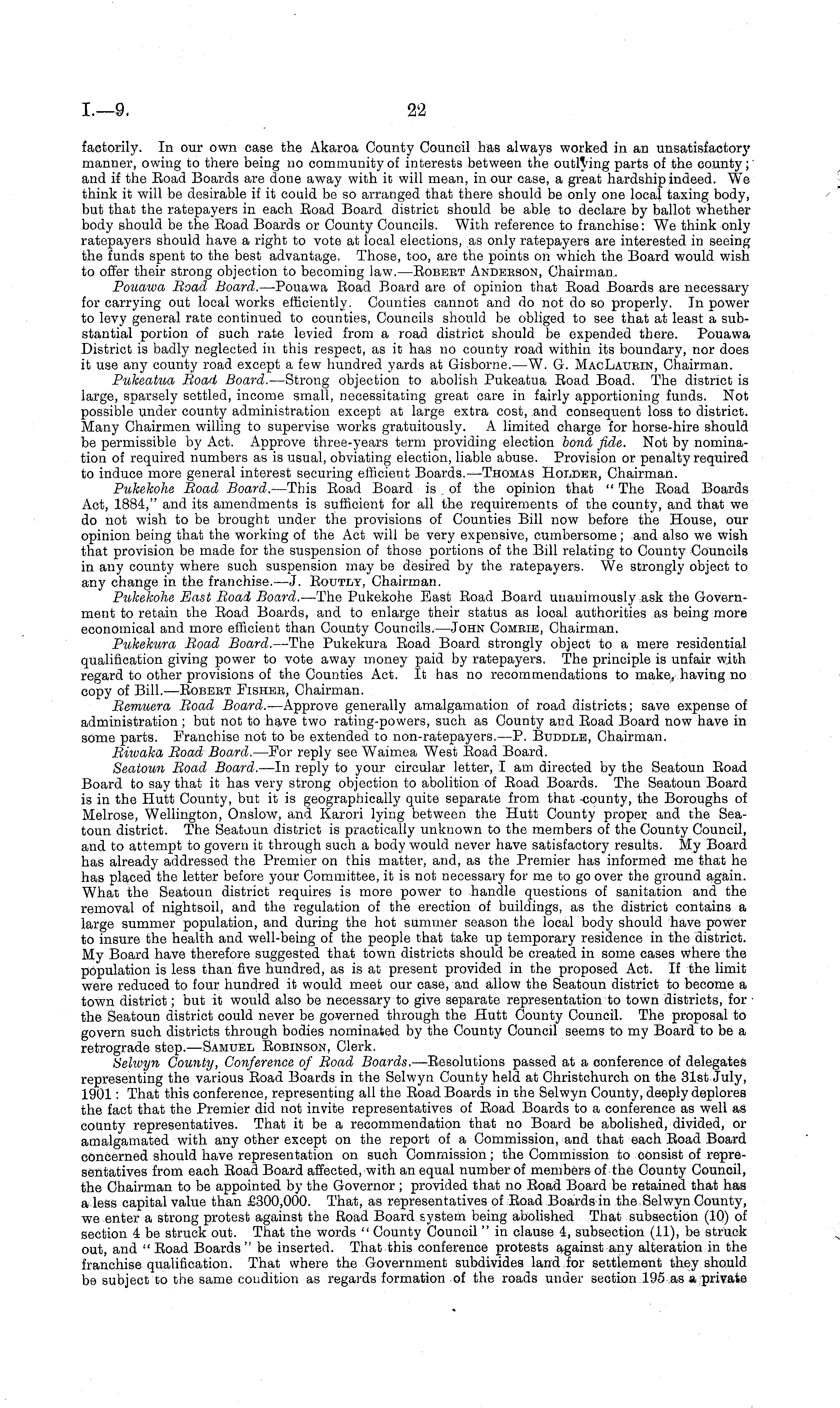 factorily. In our own case the Akaroa County Council has always worked in an unsatisfactory manner, owing to there being no community of interests between the outlying parts of the county; and if the Eoad Boards are done away with it will mean, in our case, a great hardship indeed. We think it will be desirable if it could be so arranged that there should be only one local taxing body, but that the ratepayers in each Eoad Board district should be able to declare by ballot whether body should be the Koad Boards or County Councils. With reference to franchise: We think only ratepayers should have a right to vote at local elections, as only ratepayers are interested in seeing the funds spent to the best advantage. Those, too, are the points on which the Board would wish to offer their strong objection to becoming law.—Robert Andekson, Chairman. Pouawa Boad Board. —Pouawa Boad Board are of opinion that Eoad Boards are necessary for carrying out local works efficiently. Counties cannot and do not do so properly. In power to levy general rate continued to counties, Councils should be obliged to see that at least a substantial portion of such rate levied from a road district should be expended there. Pouawa District is badly neglected in this respect, as it has no county road within its boundary, nor does it use any county road except a few hundred yards at Gisborne.—W. G. MacLaubin, Chairman. Pukeatua Boad Board. —Strong objection to abolish Pukeatua Road Boad. The district is large, sparsely settled, income small, necessitating great care in fairly apportioning funds. Not possible under county administration except at large extra cost, and consequent loss to district. Many Chairmen willing to supervise works gratuitously. A limited charge for horse-hire should be permissible by Act. Approve three-years term providing election bond fide. Not by nomination of required numbers as is usual, obviating election, liable abuse. Provision or penalty required to induce more general interest securing efficient Boards. —Thomas Holdeb, Chairman. Pukekohe Boad Board. —This Eoad Board is of the opinion that " The Eoad Boards Act, 1884," and its amendments is sufficient for all the requirements of the county, and that we do not wish to be brought under the provisions of Counties Bill now before the House, our opinion being that the working of the Act will be very expensive, cumbersome; and also we wish that provision be made for the suspension of those portions of the Bill relating to County Councils in any county where such suspension may be desired by the ratepayers. We strongly object to any change in the franchise. — J. Routly, Chairman. Pukekohe East Boad Board. —The Pukekohe East Eoad Board unanimously ask the Government to retain the Eoad Boards, and to enlarge their status as local authorities as being more economical and more efficient than County Councils. —John Combie, Chairman. Pukekura Boad Board. —The Pukekura Road Board strongly object to a mere residential qualification giving power to vote away money paid by ratepayers. The principle is unfair with regard to other provisions of the Counties Act. It has no recommendations to make, having no copy of Bill. —Eobebt Fisheb, Chairman. Bemuera Boad Board. —Approve generally amalgamation of road districts; save expense of administration ; but not to have two rating-powers, such as County and Eoad Board now have in some parts. Franchise not to be extended to non-ratepayers. —P. Buddle, Chairman. Riwaka Boad Board. —For reply see Waimea West Eoad Board. Seatoun Boad Board. —In reply to your circular letter, I am directed by the Seatoun Eoad Board to say that it has very strong objection to abolition of Road Boards. The Seatoun Board is in the Hutt County, but it is geographically quite separate from that county, the Boroughs of Melrose, Wellington, Onslow, and Karori lying between the Hutt County proper and the Seatoun district. The Seatoun district is practically unknown to the members of the County Council, and to attempt to govern it through such a body would never have satisfactory results. My Board has already addressed the Premier on this matter, and, as the Premier has informed me that he has placed the letter before your Committee, it is not necessary for me to go over the ground again. What the Seatoun district requires is more power to handle questions of sanitation and the removal of nightsoil, and the regulation of the erection of buildings, as the district contains a large summer population, and during the hot summer season the local body should have power to insure the health and well-being of the people that take up temporary residence in the district. My Board have therefore suggested that town districts should be created in some cases where the population is less than five hundred, as is at present provided in the proposed Act. If the limit were reduced to four hundred it would meet our case, and allow the Seatoun district to become a town district; but it would also be necessary to give separate representation to town districts, for the Seatoun district could never be governed through the Hutt County Council. The proposal to govern such districts through bodies nominated by the County Council seems to my Board to be a retrograde step. —Samuel Robinson, Clerk. Selwyn County, Conference of Boad Boards. —Resolutions passed at a conference of delegates representing the various Eoad Boards in the Selwyn County held at Christchurch on the 31st July, 1901: That this conference, representing all the Eoad Boards in the Selwyn County, deeply deplores the fact that the Premier did not invite representatives of Road Boards to a conference as well as county representatives. That it be a recommendation that no Board be abolished, divided, or amalgamated with any other except on the report of a Commission, and that each Road Board concerned should have representation on such Commission; the Commission to consist of