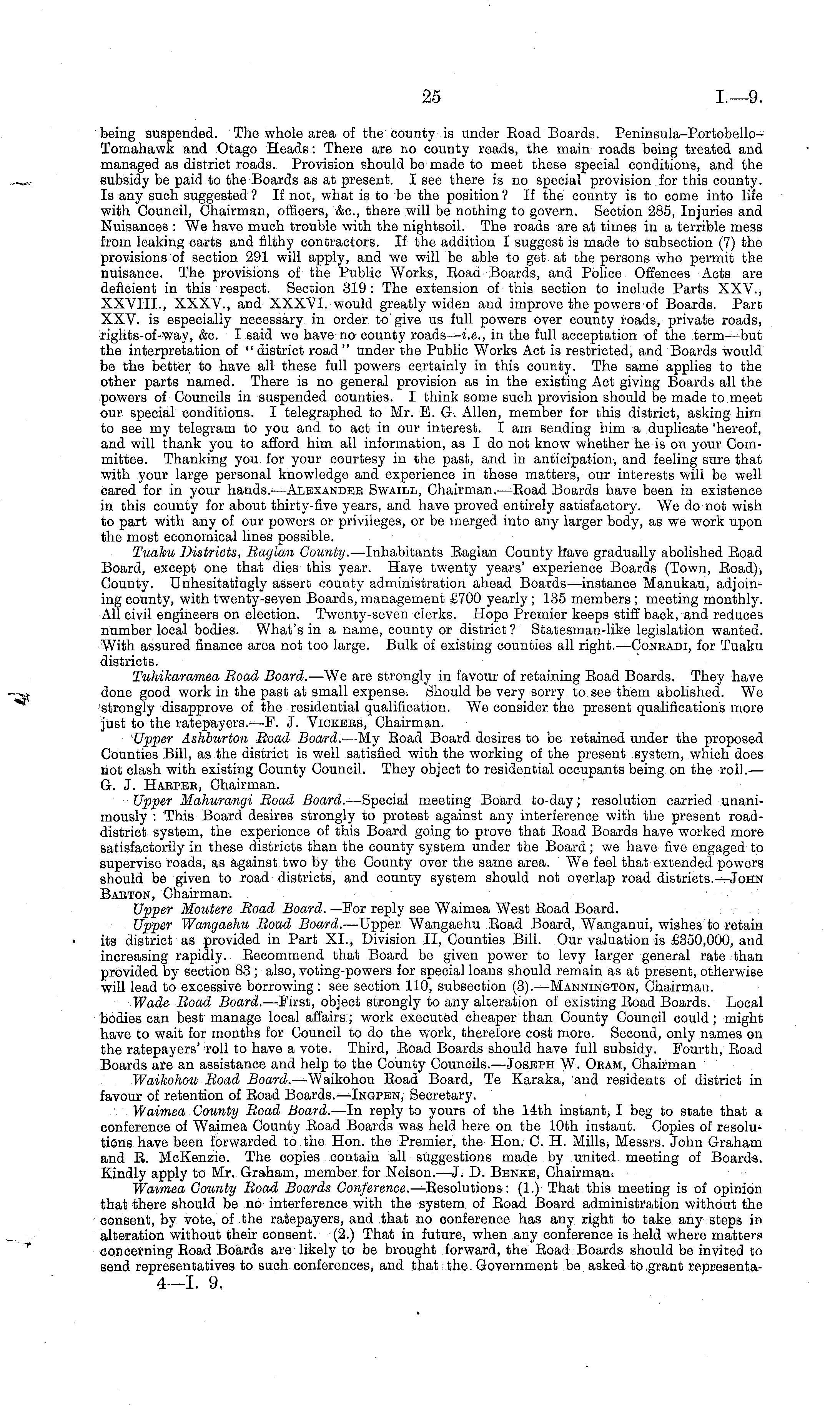 being suspended. The whole area of the county is under Boad Boards. Peninsula-Portobello-Tomahawk and Otago Heads: There are no county roads, the main roads being treated and managed as district roads. Provision should be made to meet these special conditions, and the subsidy be paid to the Boards as at present. I see there is no special provision for this county. Is any such suggested ? If not, what is to be the position ? If the county is to come into life with Council, Chairman, officers, &c, there will be nothing to govern. Section 285, Injuries and Nuisances :We have much trouble with the nightsoil. The roads are at times in a terrible mess from leaking carts and filthy contractors. If the addition I suggest is made to subsection (7) the provisions of section 291 will apply, and we will be able to get at the persons who permit the nuisance. The provisions of the Public Works, Boad Boards, and Police Offences Acts are deficient in this respect. Section 319 : The extension of this section to include Parts XXV., XXVIII., XXXV., and XXXVI. would greatly widen and improve the powers of Boards. Part XXV. is especially necessary, in order to give us full powers over county roads, private roads, rights-of-way, &c. I said we have no county roads— i.e., in the full acceptation of the term—but the interpretation of "district road" under the Public Works Act is restricted, and Boards would be the better to have all these full powers certainly in this county. The same applies to the other parts named. There is no general provision as in the existing Act giving Boards all the powers of Councils in suspended counties. I think some such provision should be made to meet our special conditions. I telegraphed to Mr. E. G. Allen, member for this district, asking him to see my telegram to you and to act in our interest. I am sending him a duplicate hereof, and will thank you to afford him all information, as I do not know whether he is on your Committee. Thanking you for your courtesy in the past, and in anticipation-, and feeling sure that with your large personal knowledge and experience in these matters, our interests will be well cared for in your hands.—Alexander Swaill, Chairman. —-Boad Boards have been in existence in this county for about thirty-five years, and have proved entirely satisfactory. We do not wish to part with any of our powers or privileges, or be merged into any larger body, as we work upon the most economical lines possible. Tuaku Districts, Raglan County. —lnhabitants Baglan County have gradually abolished Boad Board, except one that dies this year. Have twenty years' experience Boards (Town, Boad), County. Unhesitatingly assert county administration ahead Boards—instance Manukau, adjoining county, with twenty-seven Boards, management £700 yearly; 135 members ; meeting monthly. All civil engineers on election. Twenty-seven clerks. Hope Premier keeps stiff back, and reduces number local bodies. What's in a name, county or district ? Statesman-like legislation wanted. With assured finance area not too large. Bulk of existing counties all right.—Conradi, for Tuaku districts. Tuhikaramea Road Board. —We are strongly in favour of retaining Boad Boards. They have done good work in the past at small expense. Should be very sorry to see them abolished. We strongly disapprove of the residential qualification. We consider the present qualifications more just to the ratepayers.^ —F. J. Vickers, Chairman. 'Upper Ashburton Road Board. —My Boad Board desires to be retained under the proposed Counties Bill, as the district is well satisfied with the working of the present system, which does not clash with existing County Council. They object to residential occupants being on the roll.— G. J. Harper, Chairman. Upper Mahurangi Road Board. —Special meeting Board to-day; resolution carried unanimously : This Board desires strongly to protest against any interference with the present roaddistrict system, the experience of this Board going to prove that Boad Boards have worked more satisfactorily in these districts than the county system under the Board; we have five engaged to supervise roads, as against two by the County over the same area. We feel that extended powers should be given to road districts, and county system should not overlap road districts.—John Barton, Chairman. Upper Moutere Road Board. —For reply see Waimea West Boad Board. Upper Wangaehu Road Board. —Upper Wangaehu Boad Board, Wanganui, wishes to retain its district as provided in Part XL, Division 11, Counties Bill. Our valuation is £350,000, and increasing rapidly. Becommend that Board be given power to levy larger general rate than provided by section 83 ; also, voting-powers for special loans should remain as at present, otherwise will lead to excessive borrowing: see section 110, subsection (3). —Mannington, Chairman. Wade Road Board. —First, object strongly to any alteration of existing Boad Boards. Local bodies can best manage local affairs; work executed cheaper than County Council could; might have to wait for months for Council to do the work, therefore cost more. Second, only names on the ratepayers' roll to have a vote. Third, Boad Boards should have full subsidy. Fourth, Boad Boards are an assistance and help to the County Councils. —Joseph W- Oram, Chairman Waikohoit Road Board. —Waikohou Boad Board, Te Karaka, and residents of district in favour of retention of Boad Boards. —Ingpen, Secretary. Waimea County Road Board. —ln reply to yours of the 14th instant, I beg to state that a conference of Waimea County Boad Boards was held here on the 10th instant. Copies of resolutions have been forwarded to the Hon. the Premier, the Hon. C. H. Mills, Messrs. John Graham and B. MeKenzie. The copies contain all suggestions made by united meeting of Boards. Kindly apply to Mr. Graham, member for Nelson.—J. D. Benke, Chairman; Waimea County Road Boards Conference. —Besolutions: (1