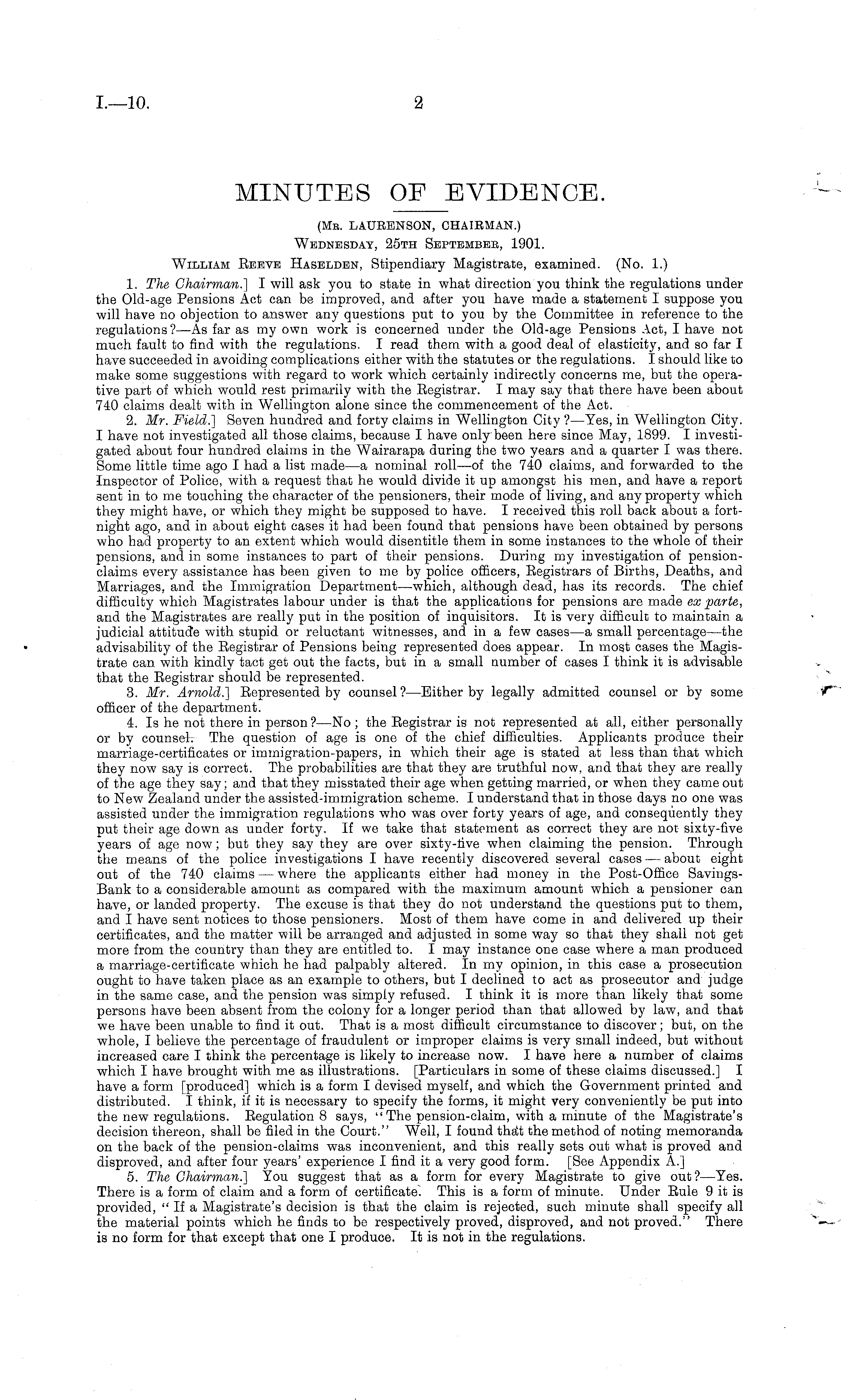 (Me. LAUBENSON, CHAIEMAN.) Wednesday, 25th September, 1901. William Eeeve Haselden, Stipendiary Magistrate, examined. (No. 1.) 1. The Chairman.} I will ask you to state in what direction you think the regulations under the Old-age Pensions Act can be improved, and after you have made a statement I suppose you will have no objection to answer any questions put to you by the Committee in reference to the regulations ? —As far as my own work is concerned under the Old-age Pensions Act, I have not much fault to find with the regulations. I read them with a good deal of elasticity, and so far I have succeeded in avoiding complications either with the statutes or the regulations. I should like to make some suggestions with regard to work which certainly indirectly concerns me, but the operative part of which would rest primarily with the Eegistrar. I may say that there have been about 740 claims dealt with in Wellington alone since the commencement of the Act. 2. Mr. Field.} Seven hundred and forty claims in Wellington City ? —Yes, in Wellington City. I have not investigated all those claims, because I have only been here since May, 1899. I investigated about four hundred claims in the Wairarapa during the two years and a quarter I was there. Some little time ago I had a list made—a nominal roll—of the 740 claims, and forwarded to the Inspector of Police, with a request that he would divide it up amongst his men, and have a report sent in to me touching the character of the pensioners, their mode of living, and any property which they might have, or which they might be supposed to have. I received this roll back about a fortnight ago, and in about eight cases it had been found that pensions have been obtained by persons who had property to an extent which would disentitle them in some instances to the whole of their pensions, and in some instances to part of their pensions. During my investigation of pensionclaims every assistance has been given to me by police officers, Eegistrars of Births, Deaths, and Marriages, and the Immigration Department—which, although dead, has its records. The chief difficulty which Magistrates labour under is that the applications for pensions are made ex parte, and the Magistrates are really put in the position of inquisitors. It is very difficult to maintain a judicial attitude with stupid or reluctant witnesses, and in a few cases —a small percentage —the advisability of the Eegistrar of Pensions being represented does appear. In most cases the Magistrate can with kindly tact get out the facts, but in a small number of cases I think it is advisable that the Eegistrar should be represented. 3. Mr. Arnold.] Eepresented by counsel? —Either by legally admitted counsel or by some officer of the department. 4. Is he not there in person ? —No ; the Eegistrar is not represented at all, either personally or by counsel. The question of age is one of the chief difficulties. Applicants produce their marriage-certificates or immigration-papers, in which their age is stated at less than that which they now say is correct. The probabilities are that they are truthful now, and that they are really of the age they say; and that they misstated their age when getting married, or when they came out to New Zealand under the assisted-immigration scheme. I understand that in those days no one was assisted under the immigration regulations who was over forty years of age, and consequently they put their age down as under forty. If we take that statement as correct they are not sixty-five years of age now; but they say they are over sixty-five when claiming the pension. Through the means of the police investigations I have recently discovered several cases — about eight out of the 740 claims — where the applicants either had money in the Post-Office SavingsBank to a considerable amount as compared with the maximum amount which a pensioner can have, or landed property. The excuse is that they do not understand the questions put to them, and I have sent notices to those pensioners. Most of them have come in and delivered up their certificates, and the matter will be arranged and adjusted in some way so that they shall not get more from the country than they are entitled to. I may instance one case where a man produced a marriage-certificate which he had palpably altered. In my opinion, in this case a prosecution ought to have taken place as an example to others, but I declined to act as prosecutor and judge in the same case, and the pension was simply refused. I think it is more than likely that some persons have been absent from the colony for a longer period than that allowed by law, and that we have been unable to find it out. That is a most difficult circumstance to discover; but, on the whole, I believe the percentage of fraudulent or improper claims is very small indeed, but without increased care I think the percentage is likely to increase now. I have here a number of claims which I have brought with me as illustrations. [Particulars in some of these claims discussed.] I have a form [produced] which is a form I devised myself, and which the Government printed and distributed. I think, if it is necessary to specify the forms, it might very conveniently be put into the new regulations. Eegulation 8 says, " The pension-claim, with a minute of the Magistrate's decision thereon, shall be filed in the Court." Well, I found that the method of noting memoranda on the back of the pension-claims was inconvenient, and this really sets out what is proved and disproved, and after four years' experience I find it a very good form. [See Appendix A.] 5. The Chairman.} You suggest that as a form for every Magistrate to give out? —Yes. There is a form of claim and a form of certificate. This is a form of minute. Under Eule 9it is provided, " If a Magistrate's decision is that the claim is rejected, such minute shall specify all the material points which he finds to be respec