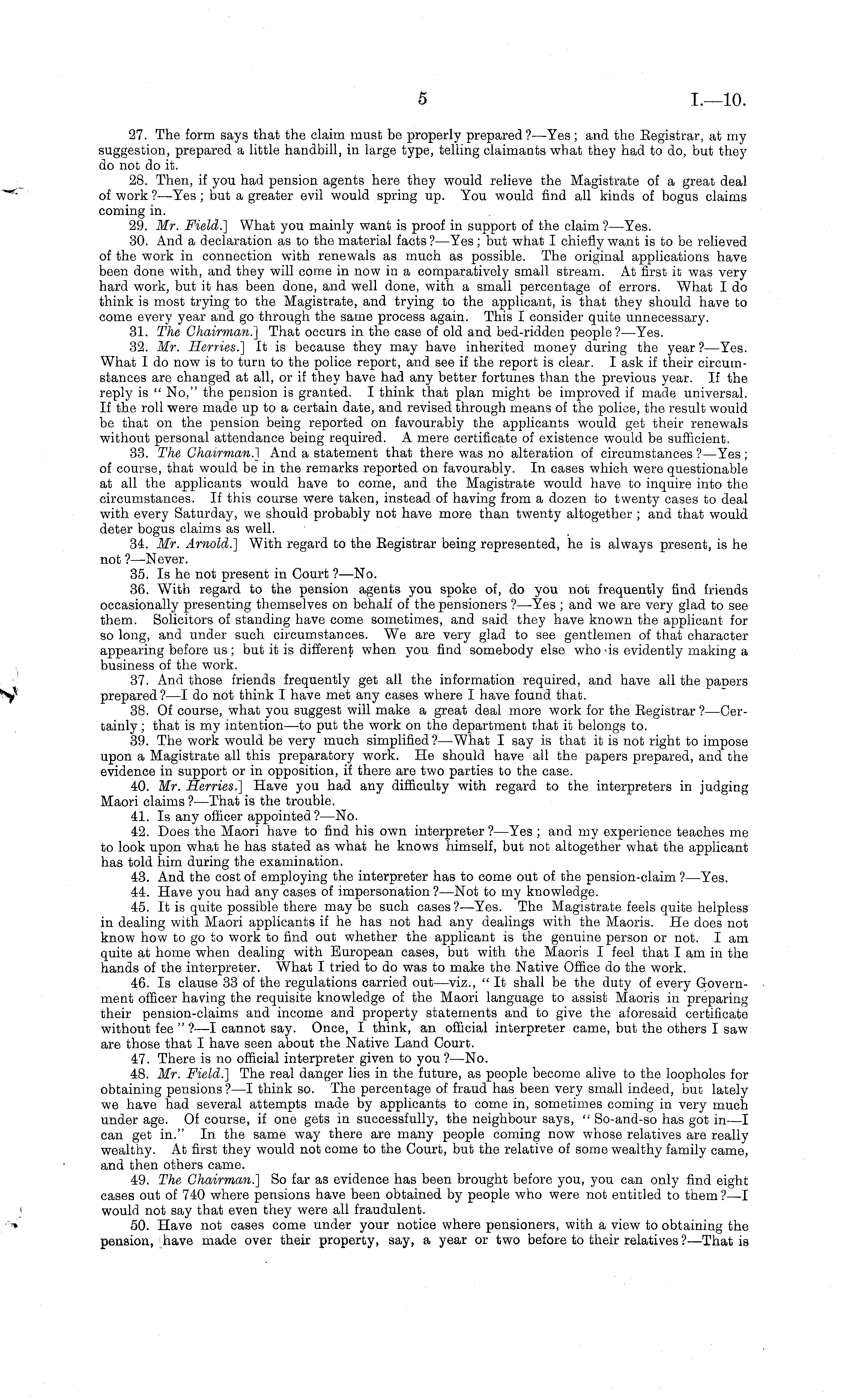 27. The form says that the claim must be properly prepared?— Yes; and the Eegistrar, at my suggestion, prepared a little handbill, in large type, telling claimants what they had to do, but they do not do it. 28. Then, if you had pension agents here they would relieve the Magistrate of a great deal of work ?—Yes ; but a greater evil would spring up. You would find all kinds of bogus claims coming in. 29. Mr. Field.] What you mainly want is proof in support of the claim ?—Yes. 30. And a declaration as to the material facts?— Yes ; but what I chiefly want is to be relieved of the work in connection with renewals as much as possible. The original applications have been done with, and they will come in now in a comparatively small stream. At first it was very hard work, but it has been done, and well done, with a small percentage of errors. What Ido think is most trying to the Magistrate, and trying to the applicant, is that they should have to come every year and go through the same process again. This I consider quite unnecessary. 31. The Chairman.] That occurs in the case of old and bed-ridden people?— Yes. 32. Mr. Herries.] It is because they may have inherited money during the year?— Yes. What Ido now is to turn to the police report, and see if the report is clear. I ask if their circumstances are changed at all, or if they have had any better fortunes than the previous year. If the reply is " No," the pension is granted. I think that plan might be improved if made universal. If the roll were made up to a certain date, and revised through means of the police, the result would be that on the pension being reported on favourably the applicants would get their renewals without personal attendance being required. A mere certificate of existence would be sufficient. 33. The Chairman.] And a statement that there was no alteration of circumstances ?—Yes; of course, that would be in the remarks reported on favourably. In cases which were questionable at all the applicants would have to come, and the Magistrate would have to inquire into the circumstances. If this course were taken, instead of having from a dozen to twenty cases to deal with every Saturday, we should probably not have more than twenty altogether ; and that would deter bogus claims as well. 34. Mr. Arnold.] With regard to the Eegistrar being represented, he is always present, is he not ? —Never. 35. Is he not present in Court ? —No. 36. With regard to the pension agents you spoke of, do you not frequently find friends occasionally presenting themselves on behalf of the pensioners ?—Yes ; and we are very glad to see them. Solicitors of standing have come sometimes, and said they have known the applicant for so long, and under such circumstances. We are very glad to see gentlemen of that character appearing before us; but it is different when you find somebody else who 'is evidently making a business of the work. 37. And those friends frequently get ail the information required, and have all the papers prepared? —I do not think I have met any cases where I have found that. 38. Of course, what you suggest will make a great deal more work for the Eegistrar?—Certainly ; that is my intention—to put the work on the department that it belongs to. 39. The work would be very much simplified?— What I say is that it is not right to impose upon a Magistrate all this preparatory work. He should have all the papers prepared, and the evidence in support or in opposition, if there are two parties to the case. 40. Mr. Herries.] Have you had any difficulty with regard to the interpreters in judging Maori claims ? —That is the trouble. 41. Is any officer appointed?— No. 42. Does the Maori have to find his own interpreter ? —Yes ; and my experience teaches me to look upon what he has stated as what he knows himself, but not altogether what the applicant has told him during the examination. 43. And the cost of employing the interpreter has to come out of the pension-claim ? —Yes. 44. Have you had any cases of impersonation ? —Not to my knowledge. 45. It is quite possible there maybe such cases?— Yes. The Magistrate feels quite helpless in dealing with Maori applicants if he has not had any dealings with the Maoris. He does not know how to go to work to find out whether the applicant is the genuine person or not. I am quite at home when dealing with European cases, but with the Maoris I feel that I am in the hands of the interpreter. What I tried to do was to make the Native Office do the work. 46. Is clause 33 of the regulations carried out —viz., " It shall be the duty of every Government officer having the requisite knowledge of the Maori language to assist Maoris in preparing their pension-claims and income and property statements and to give the aforesaid certificate without fee " ?—I cannot say. Once, I think, an official interpreter came, but the others I saw are those that I have seen about the Native Land Court. 47. There is no official interpreter given to you ?—No. 48. Mr. Field.] The real danger lies in the future, as people become alive to the loopholes for obtaining pensions ?—I think so. The percentage of fraud has been very small indeed, but lately we have had several attempts made by applicants to come in, sometimes coming in very much under age. Of course, if one gets in successfully, the neighbour says, " So-and-so has got in—l can get in." In the same way there are many people coming now whose relatives are really wealthy. At first they would not come to the Court, but the relative of some wealthy family came, and then others came. 49. The Chairman.] So far as evidence has been brought before you, you can only find eight cases out of 740 where pensions have been obtained by people who were not entitled to them ?—I would not say that even they were all fraudulent. 50. Have not cases come under your notice where pensioners, with a view to obtaining the pension, have made over their pr