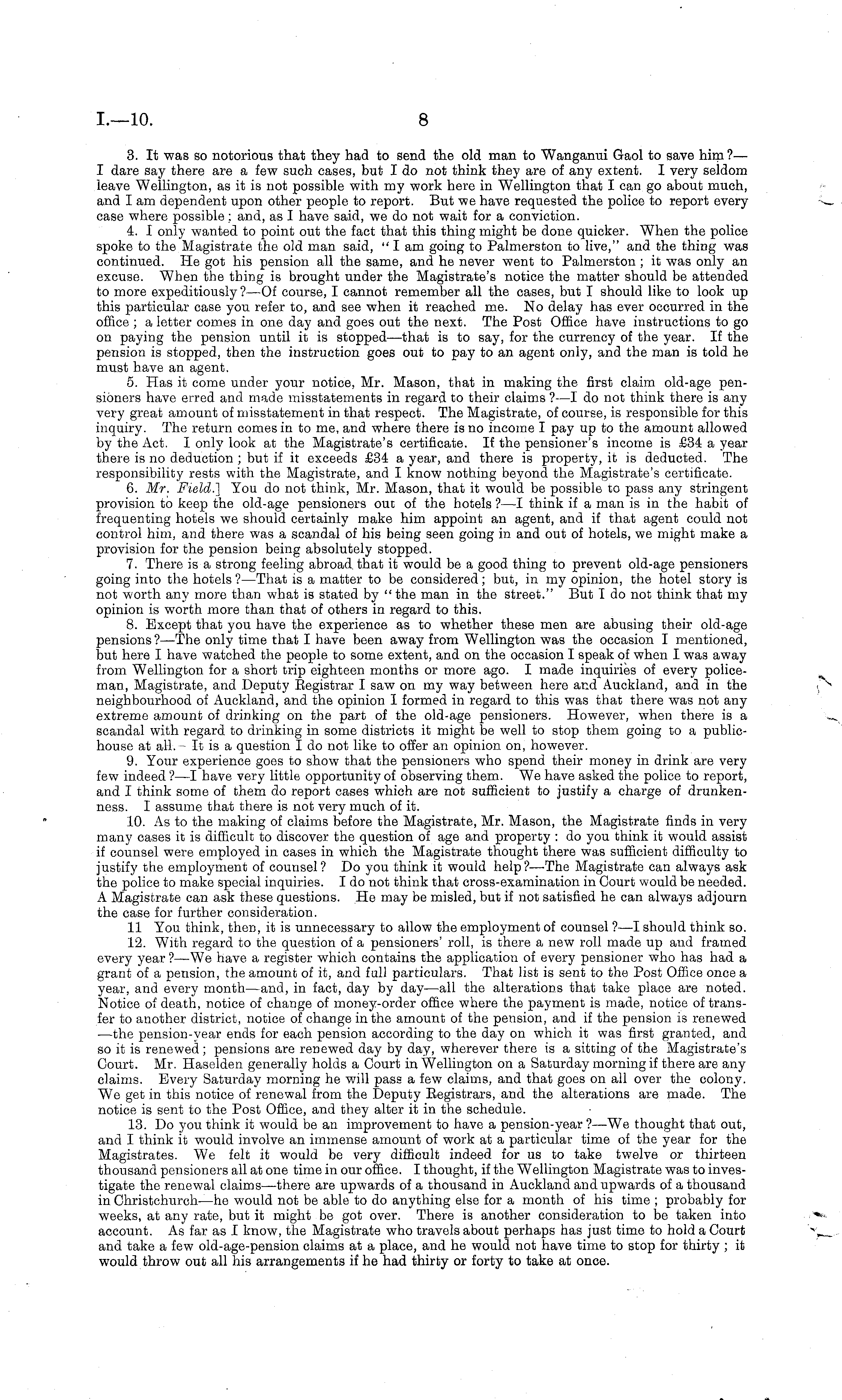 3. It was so notorious that they had to send the old man to Wanganiii Gaol to save him?— I dare say there are a few such cases, but Ido not think they are of any extent. I very seldom leave Wellington, as it is not possible with my work here in Wellington that I can go about much, and lam dependent upon other people to report. But we have requested the police to report every case where possible; and, as I have said, we do not wait for a conviction. 4. I only wanted to point out the fact that this thing might be done quicker. When the police spoke to the Magistrate the old man said, " I am going to Palmerston to live," and the thing was continued. He got his pension all the same, and he never went to Palmerston ; it was only an excuse. When the thing is brought under the Magistrate's notice the matter should be attended to more expeditiously ?—Of course, I cannot remember all the cases, but I should like to look up this particular case you refer to, and see when it reached me. No delay has ever occurred in the office ; a letter comes in one day and goes out the next. The Post Office have instructions to go on paying the pension until it is stopped—that is to say, for the currency of the year. If the pension is stopped, then the instruction goes out to pay to an agent only, and the man is told he must have an agent. 5. Has it come under your notice, Mr. Mason, that in making the first claim old-age pensioners have erred and made misstatements in regard to their claims ?—I do not think there is any very great amount of rnisstatement in that respect. The Magistrate, of course, is responsible for this inquiry. The return comes in to me, and where there is no income I pay up to the amount allowed by the Act. I only look at the Magistrate's certificate. If the pensioner's income is £34 a year there is no deduction ; but if it exceeds £34 a year, and there is property, it is deducted. The responsibility rests with the Magistrate, and I know nothing beyond the Magistrate's certificate. 6. Mr. Field.] You do not think, Mr. Mason, that it would be possible to pass any stringent provision to keep the old-age pensioners out of the hotels ? —I think if a man is in the habit of frequenting hotels we should certainly make him appoint an agent, and if that agent could not control him, and there was a scandal of his being seen going in and out of hotels, we might make a provision for the pension being absolutely stopped. 7. There is a strong feeling abroad, that it would be a good thing to prevent old-age pensioners going into the hotels ?—That is a matter to be considered; but, in my opinion, the hotel story is not worth any more than what is stated by "the man in the street." But Ido not think that my opinion is worth more than that of others in regard to this. 8. Except that you have the experience as to whether these men are abusing their old-age pensions? —The only time that I have been away from Wellington was the occasion I mentioned, but here I have watched the people to some extent, and on the occasion I speak of when I was away from Wellington for a short trip eighteen months or more ago. I made inquiries of every policeman, Magistrate, and Deputy Registrar I saw on my way between here and Auckland, and in the neighbourhood of Auckland, and the opinion I formed in regard to this was that there was not any extreme amount of drinking on the part of the old-age pensioners. However, when there is a scandal with regard to drinking in some districts it might be well to stop them going to a publichouse at all. It is a question Ido not like to offer an opinion on, however. 9. Your experience goes to show that the pensioners who spend their money in drink are very few indeed ?—I have very little opportunity of observing them. We have asked the police to report, and I think some of them do report cases which are not sufficient to justify a charge of drunkenness. I assume that there is not very much of it. 10. As to the making of claims before the Magistrate, Mr. Mason, the Magistrate finds in very many cases it is difficult to discover the question of age and property : do you think it would assist if counsel were employed in cases in which the Magistrate thought there was sufficient difficulty to justify the employment of counsel? Do you think it would help?— The Magistrate can always ask the police to make special inquiries. Ido not think that cross-examination in Court would be needed. A Magistrate can ask these questions. He may be misled, but if not satisfied he can always adjourn the case for further consideration. 11 You think, then, it is unnecessary to allow the employment of counsel ?—I should think so. 12. With regard to the question of a pensioners' roll, is there a new roll made up and framed every year ? —We have a register which contains the application of every pensioner who has had a grant of a pension, the amount of it, and fall particulars. That list is sent to the Post Office once a year, and every month —and, in fact, day by day—all the alterations that take place are noted. Notice of death, notice of change of money-order office where the payment is made, notice of transfer to another district, notice of change in the amount of the pension, and if the pension is renewed —the pension-year ends for each pension according to the day on which it was first granted, and so it is renewed ; pensions are renewed day by day, wherever there is a sitting of the Magistrate's Court. Mr. Haselden generally holds a Court in Wellington on a Saturday morning if there are any claims. Every Saturday morning he will pass a few claims, and that goes on all over the colony. We get in this notice of renewal from the Deputy Registrars, and the alterations are made. The notice is sent to the Post Office, and they alter it in the schedule. 13. Do you think it would be an improvement to have a pension-year ? —We thought that out, and I think it would involve an immense amount of 