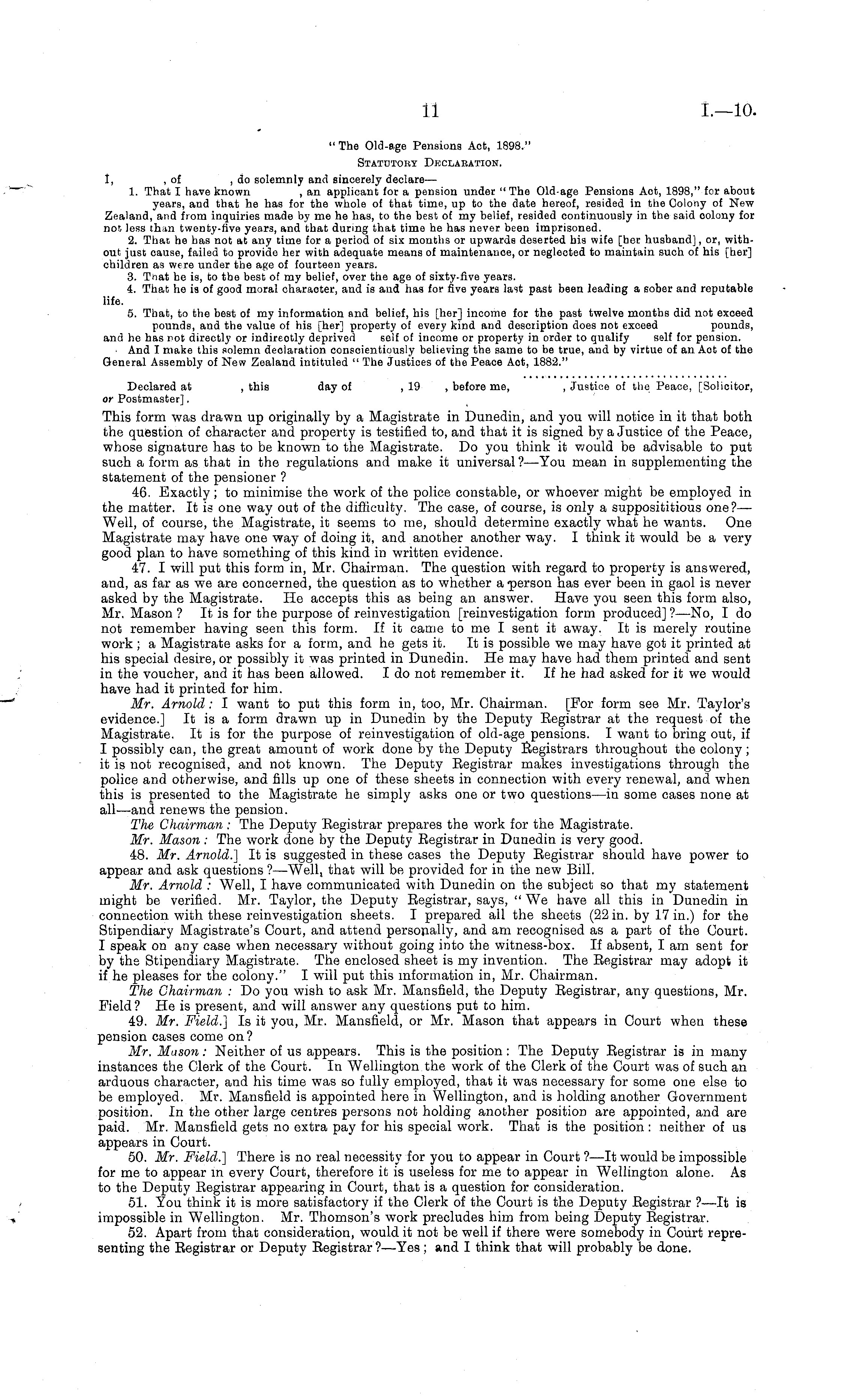 " The Old-age Pensions Act, 1898." Statutory Declabation. I, , of ,do solemnly and sincerely declare — 1. That I have known , an applicant for a pension under "The Old-age Pensions Act, 1898," for about years, and that he has for the whole of that time, up to the date hereof, resided in the Colony of New Zealand, and from inquiries made by me he has, to the best of my belief, resided continuously in the said oolony for not less than twenty-five years, and that during that time he has never been imprisoned. 2. That he has not at any time for a period of six months or upwards deserted his wife [her husband], or, without just cause, failed to provide her with adequate means of maintenance, or negleoted to maintain such of his [her] children as were under the age of fourteen years. 3. That he is, to the best of my belief, over the age of sixty-five years. 4. That he is of good moral character, and is and has for five years last past been leading a sober and reputable life. 5. That, to the best of my information and belief, his [her] income for the past twelve months did not exoeed pounds, and the value of his [her] property of every kind and description does not exceed pounds, and he has not directly or indireotly deprived self of income or property in order to qualify self for pension. And I make this solemn declaration conscientiously believing the same to be true, and by virtue of an Aot of the General Assembly of New Zealand intituled " The Justices of the Peace Aot, 1882." Declared at , this day of ,19 , before me, .Justice of the Peace, [Solicitor, or Postmaster]. This form was drawn up originally by a Magistrate in Dunedin, and you will notice in it that both the question of character and property is testified to, and that it is signed by a Justice of the Peace, whose signature has to be known to the Magistrate. Do you think it would be advisable to put such a form as that in the regulations and make it universal ? —You mean in supplementing the statement of the pensioner ? 46. Exactly; to minimise the work of the police constable, or whoever might be employed in the matter. It is one way out of the difficulty. The case, of course, is only a supposititious one?— Well, of course, the Magistrate, it seems to me, should determine exactly what he wants. One Magistrate may have one way of doing it, and another another way. I think it would be a very good plan to have something of this kind in written evidence. 47. I will put this form in, Mr. Chairman. The question with regard to property is answered, and, as far as we are concerned, the question as to whether a person has ever been in gaol is never asked by the Magistrate. He accepts this as being an answer. Have you seen this form also, Mr. Mason ? It is for the purpose of reinvestigation [reinvestigation form produced] ?—No, Ido not remember having seen this form. If it came to me I sent it away. It is merely routine work ; a Magistrate asks for a form, and he gets it. It is possible we may have got it printed at his special desire, or possibly it was printed in Dunedin. He may have had them printed and sent in the voucher, and it has been allowed. Ido not remember it. If he had asked for it we would have had it printed for him. Mr. Arnold: I want to put this form in, too, Mr. Chairman. [For form see Mr. Taylor's evidence.] It is a form drawn up in Dunedin by the Deputy Eegistrar at the request of the Magistrate. It is for the purpose of reinvestigation of old-age pensions. I want to bring out, if I possibly can, the great amount of work done by the Deputy throughout the colony; it is not recognised, and not known. The Deputy Eegistrar makes investigations through the police and otherwise, and fills up one of these sheets in connection with every renewal, and when this is presented to the Magistrate he simply asks one or two questions—in some cases none at all—and renews the pension. The Chairman : The Deputy Eegistrar prepares the work for the Magistrate. Mr. Mason : The work done by the Deputy Eegistrar in Dunedin is very good. 48. Mr. Arnold.] It is suggested in these cases the Deputy Begistrar should have power to appear and ask questions ?—Well, that will be provided for in the new Bill. Mr. Arnold : Well, I have communicated with Dunedin on the subject so that my statement might be verified. Mr. Taylor, the Deputy Eegistrar, says, "We have all this in Dunedin in connection with these reinvestigation sheets. I prepared all the sheets (22 in. by 17 in.) for the Stipendiary Magistrate's Court, and attend personally, and am recognised as a part of the Court. I speak on any case when necessary without going into the witness-box. If absent, lam sent for by the Stipendiary Magistrate. The enclosed sheet is my invention. The Eegistrar may adopt it if he pleases for the colony." I will put this information in, Mr. Chairman. The Chairman : Do you wish to ask Mr. Mansfield, the Deputy Eegistrar, any questions, Mr. Field? He is present, and will answer any questions put to him. 49. Mr. Field.] Is it you, Mr. Mansfield, or Mr. Mason that appears in Court when these pension cases come on? Mr. Mason : Neither of us appears. This is the position : The Deputy Eegistrar is in many instances the Clerk of the Court. In Wellington the work of the Clerk of the Court was of such an arduous character, and his time was so fully employed, that it was necessary for some one else to be employed. Mr. Mansfield is appointed here in Wellington, and is holding another Government position. In the other large centres persons not holding another position are appointed, and are paid. Mr. Mansfield gets no extra pay for his special work. That is the position : neither of us appears in Court. 50. Mr. Field.] There is no real necessity for you to appear in Court ?—lt would be impossible for me to appear in every Court, therefore it is useless for me to appear in Wellington alone. As to the Deputy Eegistrar appearing in Court, that is a question for cons