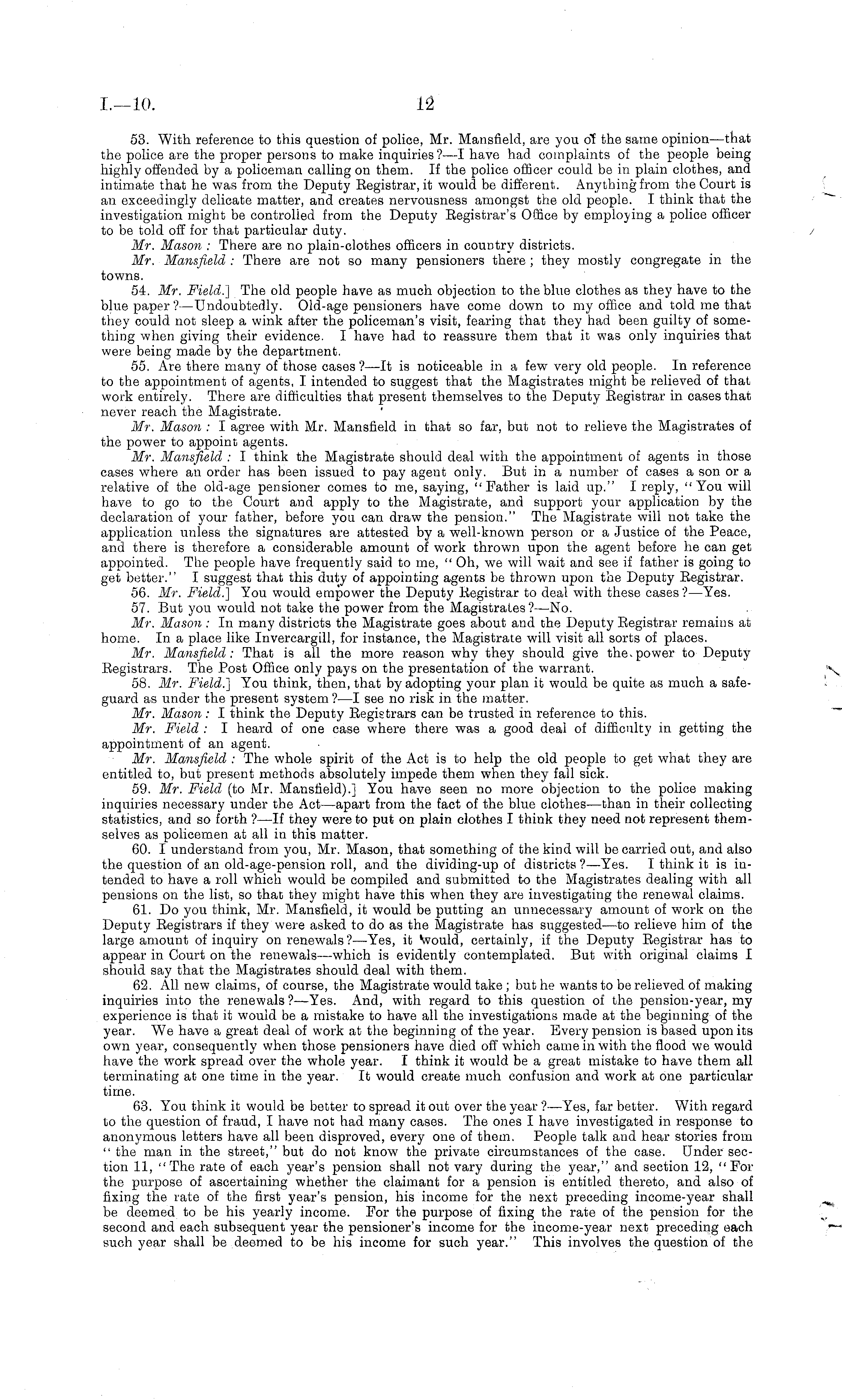 53. With reference to this question of police, Mr. Mansfield, are you of the same opinion—that the police are the proper persons to make inquiries?—l have had complaints of the people being highly offended by a policeman calling on them. If the police officer could be in plain clothes, and intimate that he was from the Deputy Eegistrar.it would be different. Anything from the Court is an exceedingly delicate matter, and creates nervousness amongst the old people. I think that the investigation might be controlled from the Deputy Registrar's Office by employing a police officer to be told off for that particular duty. Mr. Mason : There are no plain-clothes officers in country districts. Mr. Mansfield : There are not so many pensioners there ; they mostly congregate in the towns. 54. Mr. Field.] The old people have as much objection to the blue clothes as they have to the blue paper ?—Undoubtedly. Old-age pensioners have come down to my office and told me that they could not sleep a wink after the policeman's visit, fearing that they had been guilty of something when giving their evidence. I have had to reassure them that it was only inquiries that were being made by the department. 55. Are there many of those cases ?—lt is noticeable in a few very old people. In reference to the appointment of agents, I intended to suggest that the Magistrates might be relieved of that work entirely. There are difficulties that present themselves to the Deputy Registrar in cases that never reach the Magistrate. Mr. Mason : I agree with Mr. Mansfield in that so far, but not to relieve the Magistrates of the power to appoint agents. Mr. Mansfield : I think the Magistrate should deal with the appointment of agents in those cases where an order has been issued to pay agent only. But in a number of cases a son or a relative of the old-age pensioner comes to me, saying, "Father is laid up." I reply, "You will have to go to the Court and apply to the Magistrate, and support your application by the declaration of your father, before you can draw the pension." The Magistrate will not take the application unless the signatures are attested by a well-known person or a Justice of the Peace, and there is therefore a considerable amount of work thrown upon the agent before he can get appointed. The people have frequently said to me, " Oh, we will wait and see if father is going to get better." I suggest that this duty of appointing agents be thrown upon the Deputy Registrar. 56. Mr. Field.] You would empower the Deputy Registrar to deal with these cases? —Yes. 57. But you would not take the power from the Magistrates?— No. Mr. Mason : In many districts the Magistrate goes about and the Deputy Registrar remains at home. In a place like Invercargill, for instance, the Magistrate will visit all sorts of places. Mr. Mansfield: That is all the more reason why they should give the. power to Deputy Registrars. The Post Office only pays on the presentation of the warrant. 58. Mr. Field.] You think, then, that by adopting your plan it would be quite as much a safeguard as under the present system ? —I see no risk in the matter. Mr. Mason: I think the Deputy Registrars can be trusted in reference to this. Mr. Field : I heard of one case where there was a good deal of difficulty in getting the appointment of an agent. Mr. Mansfield : The whole spirit of the Act is to help the old people to get what they are entitled to, but present methods absolutely impede them when they fall sick. 59. Mr. Field (to Mr. Mansfield).] You have seen no more objection to the police making inquiries necessary under the Act—apart from the fact of the blue clothes —than in their collecting statistics, and so forth ?—lf they were to put on plain clothes I think they need not represent themselves as policemen at all in this matter. 60. I understand from you, Mr. Mason, that something of the kind will be carried out, and also the question of an old-age-pension roll, and the dividing-up of districts?— Yes. I think it is intended to have a roll which would be compiled and submitted to the Magistrates dealing with all pensions on the list, so that they might have this when they are investigating the renewal claims. 61. Do you think, Mr. Mansfield, it would be putting an unnecessary amount of work on the Deputy Registrars if they were asked to do as the Magistrate has suggested—to relieve him of the large amount of inquiry on renewals ?—Yes, it would, certainly, if the Deputy Registrar has to appear in Court on the renewals—which is evidently contemplated. But with original claims I should say that the Magistrates should deal with them. 62. All new claims, of course, the Magistrate would take ; but he wants to be relieved of making inquiries into the renewals ?—Yes. And, with regard to this question of the pension-year, my experience is that it would be a mistake to have all the investigations made at the beginning of the year. We have a great deal of work at the beginning of the year. Every pension is based upon its own year, consequently when those pensioners have died off which came in with the flood we would have the work spread over the whole year. I think it would be a great mistake to have them all terminating at one time in the year. It would create much confusion and work at one particular time. 63. You think it would be better to spread it out over the year ?—Yes, far better. With regard to the question of fraud, I have not had many cases. The ones I have investigated in response to anonymous letters have all been disproved, every one of them. People talk and hear stories from " the man in the street," but do not know the private circumstances of the case. Under section 11, "The rate of each year's pension shall not vary during the year," and section 12, "For the purpose of ascertaining whether the claimant for a pension is entitled thereto, and also of fixing the rate of the first year's pension, his income for the n