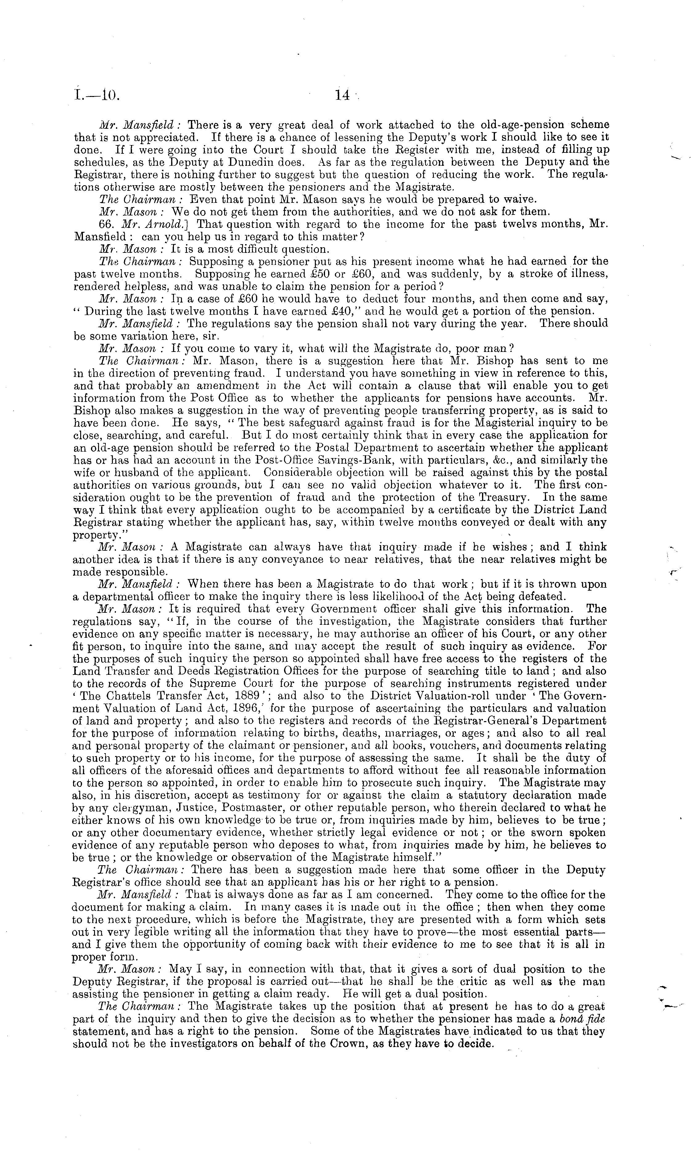 Mr. Mansfield : There is a very great deal of work attached to the old-age-pension scheme that is not appreciated. If there is a chance of lessening the Deputy's work I should like to see it done. If I were going into the Court I should take the Register with me, instead of filling up schedules, as the Deputy at Dunedin does. As far as the regulation between the Deputy and the Registrar, there is nothing further to suggest but the question of reducing the work. The regulations otherwise are mostly between the pensioners and the Magistrate. The Chairman : Even that point Mr. Mason says he would be prepared to waive. Mr. Mason : We do not get them from the authorities, and we do not ask for them. 66. Mr. Arnold.} That question with regard to the income for the past twelvs months, Mr. Mansfield : can you help us in regard to this matter ? Mr. Mason : It is a most difficult question. The, Chairman : Supposing a pensioner put as his present income what he had earned for the past twelve months. Supposing he earned £50 or £60, and was suddenly, by a stroke of illness, rendered helpless, and was unable to claim the pension for a period ? Mr. Mason : In a case of £60 he would have to deduct four months, and then come and say, " During the last twelve months I have earned £40," and he would get a portion of the pension. Mr. Mansfield : The regulations say the pension shall not vary during the year. There should be some variation here, sir. Mr. Mason : If you come to vary it, what will the Magistrate do, poor man'? The Chairman: Mr. Mason, there is a suggestion here that Mr. Bishop has sent to me in the direction of preventing fraud. I understand you have something in view in reference to this, and that probably an amendment in the Act will contain a clause that will enable you to get information from the Post Office as to whether the applicants for pensions have accounts. Mr. Bishop also makes a suggestion in the way of preventing people transferring property, as is said to have been done. He says, " The best safeguard against fraud is for the Magisterial inquiry to be close, searching, and careful. But Ido most certainly think that in every case the application for an old-age pension should be referred to the Postal Department to ascertain whether the applicant has or has had an account in the Post-Office Savings-Bank, with particulars, &c, and similarly the wife or husband of the applicant. Considerable objection will be raised against this by the postal authorities on various grounds, but I can see no valid objection whatever to it. The first consideration ought to be the prevention of fraud and the protection of the Treasury. In the same way I think that every application ought to be accompanied by a certificate by the District Land Registrar stating whether the applicant has, say, within twelve months conveyed or dealt with any property." Mr. Mason : A Magistrate can always have that inquiry made if he wishes ; and I think another idea is that if there is any conveyance to near relatives, that the near relatives might be made responsible. Mr. Mansfield : When there has been a Magistrate to do that work ; but if it is thrown upon a departmental officer to make the inquiry there is less likelihood of the Act being defeated. Mr. Mason : It is required that every Government officer shall give this information. The regulations say, " If, in the course of the investigation, the Magistrate considers that further evidence on any specific matter is necessary, he may authorise an officer of his Court, or any other fit person, to inquire into the same, and may accept the result of such inquiry as evidence. For the purposes of such inquiry the person so appointed shall have free access to the registers of the Land Transfer and Deeds Registration Offices for the purpose of searching title to land ; and also to the records of the Supreme Court for the purpose of searching instruments registered under ' The Chattels Transfer Act, 1889 '; and also to the District Valuation-roll under ' The Government Valuation of Land Act, 1896,' for the purpose of ascertaining the particulars and valuation of land and property ; and also to the registers and records of the Registrar-General's Department for the purpose of information relating to births, deaths, marriages, or ages; and also to all real and personal property of the claimant or pensioner, and all books, vouchers, and documents relating to such property or to his income, for the purpose of assessing the same. It shall be the duty of all officers of the aforesaid offices and departments to afford without fee all reasonable information to the person so appointed, in order to enable him to prosecute such inquiry. The Magistrate may also, in his discretion, accept as testimony for or against the claim a statutory declaration made by any clergyman, Justice, Postmaster, or other reputable person, who therein declared to what he either knows of his own knowledge to be true or, from inquiries made by him, believes to be true; or any other documentary evidence, whether strictly legal evidence or not ; or the sworn spoken evidence of any reputable person who deposes to what, from inquiries made by him, he believes to be true ; or the knowledge or observation of the Magistrate himself." The Chairman : There has been a suggestion made here that some officer in the Deputy Registrar's office should see that an applicant has his or her right to a pension. Mr. Mansfield : That is always done as far as lam concerned. They come to the office for the document for making a claim. In many cases it is made out in the office ; then when they come to the next procedure, which is before the Magistrate, they are presented with a form which sets out in very legible writing all the information that they have to prove —the most essential parts — and I give them the opportunity of coming back with their evidence to me to see that it is all in proper form. Mr. Mason : May I say, in c