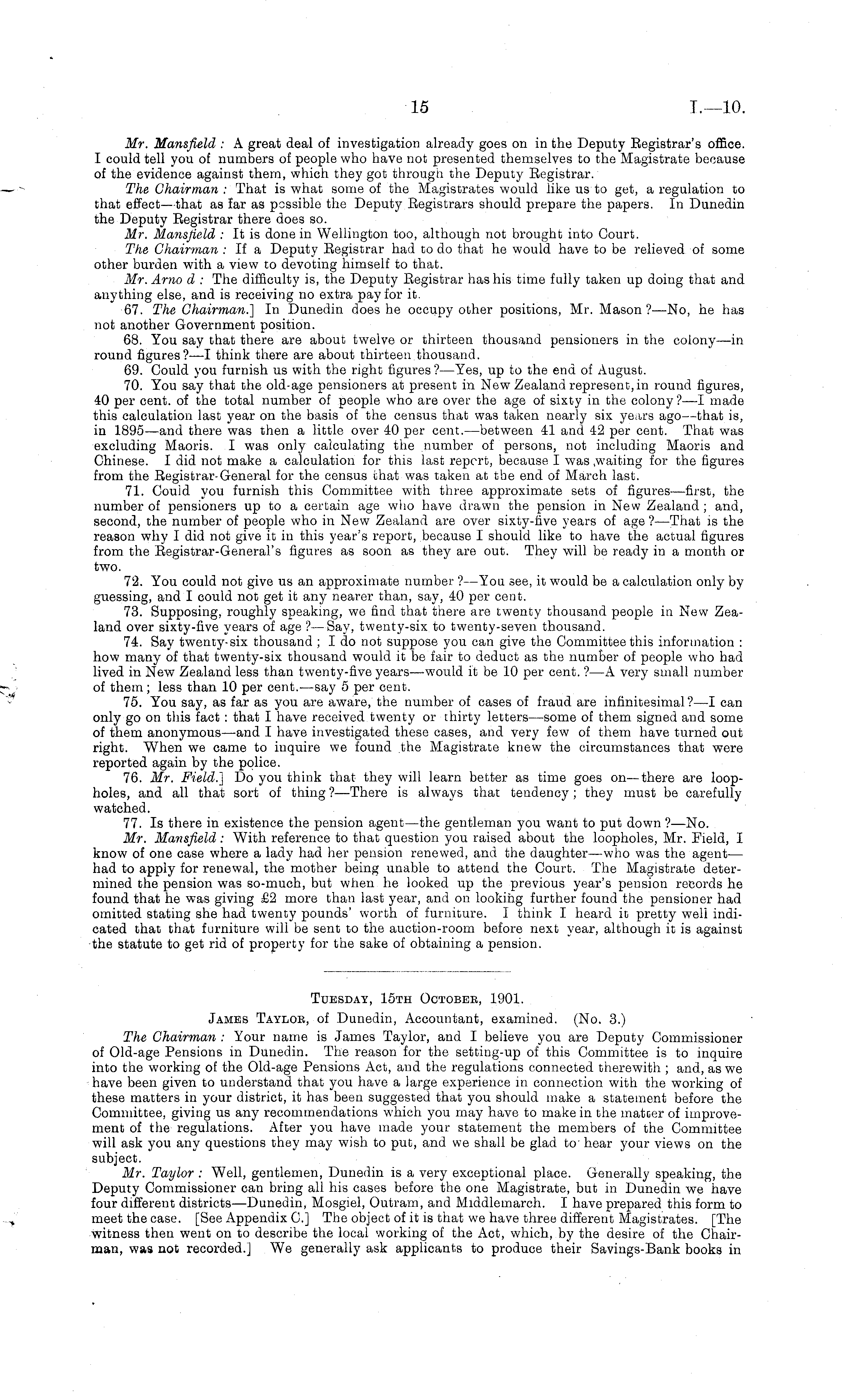 Tuesday, 15th Octobee, 1901. James Tayloe, of Dunedin, Accountant, examined. (No. 3.) The Chairman : Your name is James Taylor, and I believe you are Deputy Commissioner of Old-age Pensions in Dunedin. The reason for the setting-up of this Committee is to inquire into the working of the Old-age Pensions Act, and the regulations connected therewith ; and, as we have been given to understand that you have a large experience in connection with the working of these matters in your district, it has been suggested that you should make a statement before the Committee, giving us any recommendations which you may have to make in the matcer of improvement of the regulations. After you have made your statement the members of the Committee will ask you any questions they may wish to put, and we shall be glad to' hear your views on the subject. Mr. Taylor : Well, gentlemen, Dunedin is a very exceptional place. Generally speaking, the Deputy Commissioner can bring all his cases before the one Magistrate, but in Dunedin we have four different districts —Dunedin, Mosgiel, Outram, and Middlemarch. I have prepared this form to meet the case. [See Appendix C] The object of it is that we have three different Magistrates. [The witness then went on to describe the local working of the Act, which, by the desire of the Chairman, was not recorded.] We generally ask applicants to produce their Savings-Bank books in