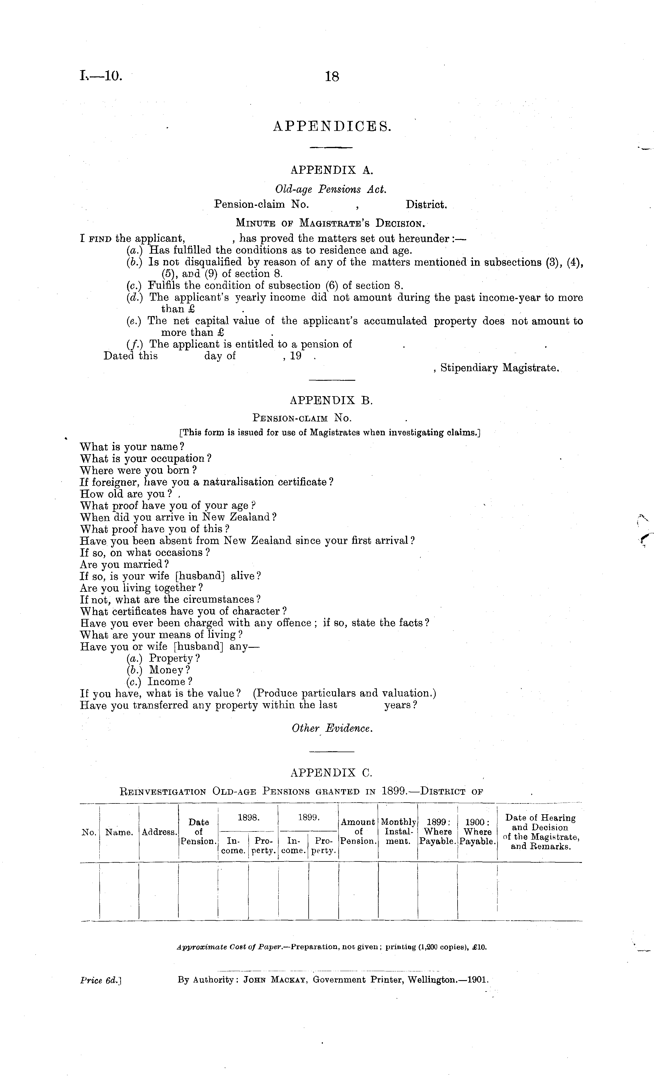 APPENDIX B. Pension-claim No. [This form is issued for use of Magistrates when investigating claims.] What is your name ? What is your occupation ? Where were you born ? If foreigner, have you a naturalisation certificate ? How old are you ? What proof have you of your age ? When did you arrive in New Zealand ? What proof have you of this ? Have you been absent from New Zealand since your first arrival? If so, on what occasions ? Are you married? If so, is your wife [husband] alive ? Are you living together ? If not, what are the circumstances ? What certificates have you of character ? Have you ever been charged with any offence ; if so, state the facts ? What are your means of living ? Have you or wife [husband] any— (a.) Property ? (b.) Money? (c.) Income ? If you have, what is the value? (Produce particulars and valuation.) Have you transferred any property within the last years ? Other Evidence.