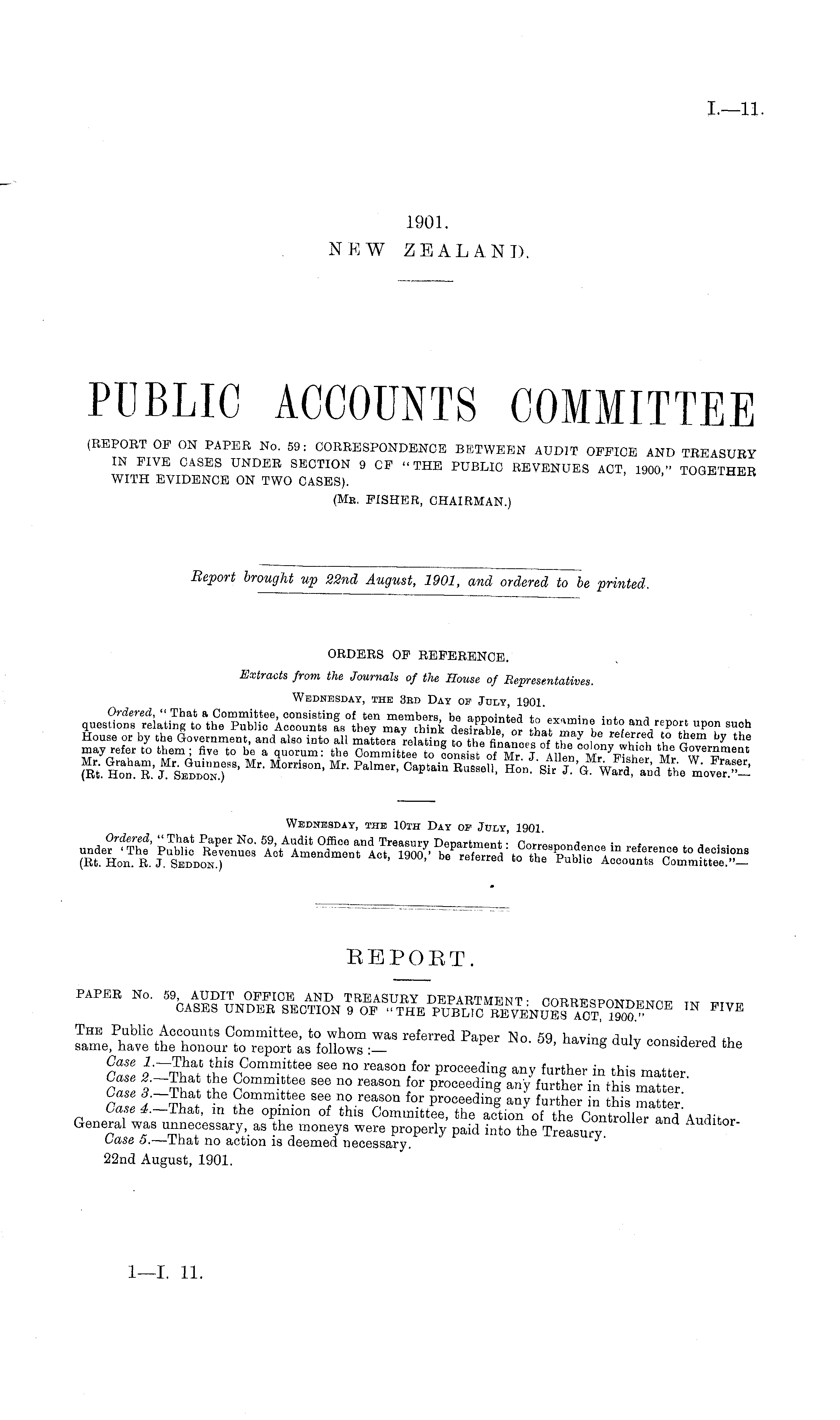 PUBLIC ACCOUNTS COMMITTEE (REPORT OF ON PAPER No. 59: CORRESPONDENCE BETWEEN AUDIT OFFICE AND TREASURY IN FIVE CASES UNDER SECTION 9 OF "THE PUBLIC REVENUES ACT, 1900," TOGETHER WITH EVIDENCE ON TWO CASES). (Mr. FISHER, CHAIRMAN.)