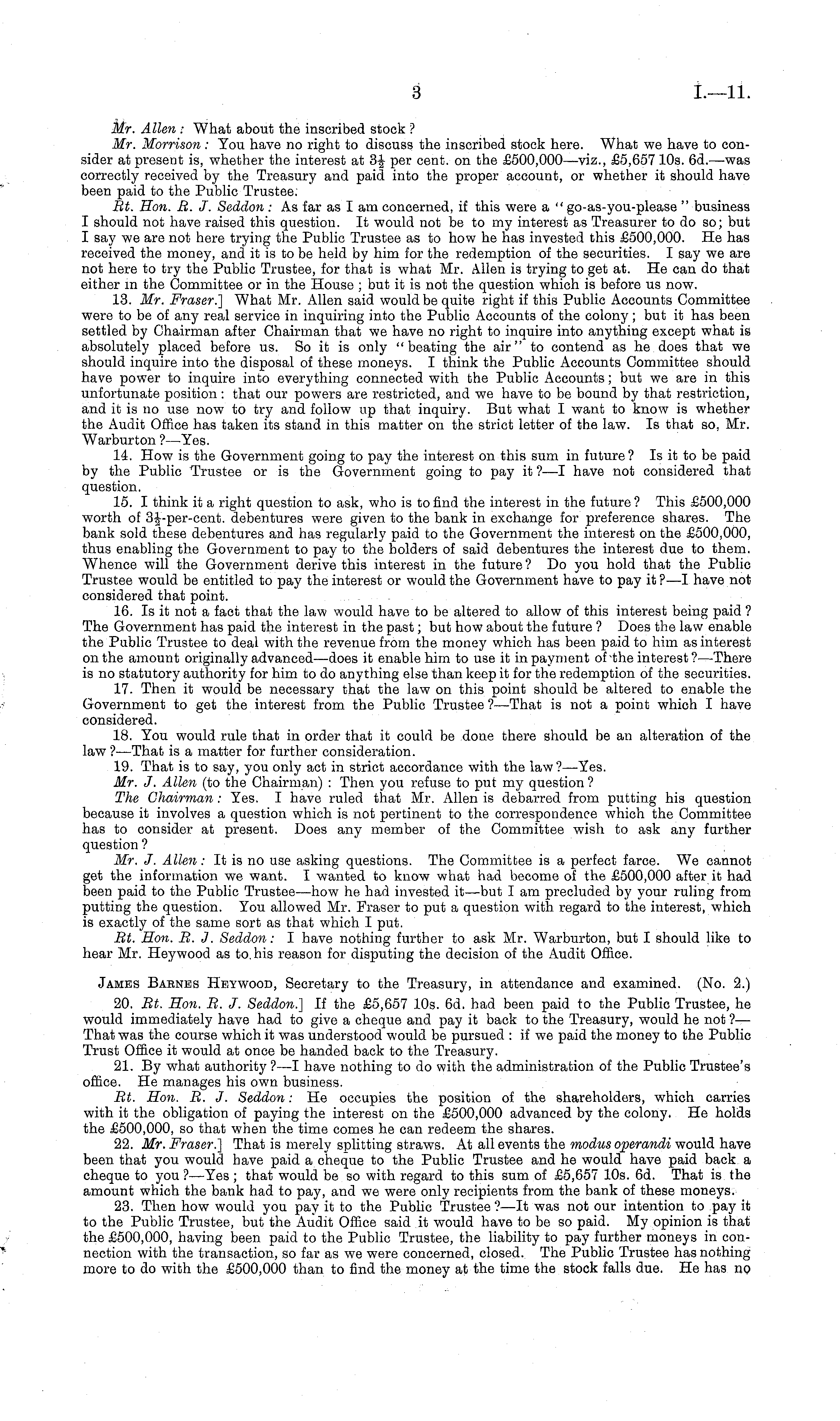 Mr. Allen : What about the inscribed stock ? Mr. Morrison : You have no right to discuss the inscribed stock here. What we have to consider at present is, whether the interest at 3-J- per cent, on the £500,000 —viz., £5,657 10s. 6d.—was correctly received by the Treasury and paid into the proper account, or whether it should have been paid to the Public Trustee; Bt. Hon. B. J. Seddon : As far as I am concerned, if this were a " go-as-you-please " business I should not have raised this question. It would not be to my interest as Treasurer to do so; but I say we are not here trying the Public Trustee as to how he has invested this £500,000. He has received the money, and it is to be held by him for the redemption of the securities. I say we are not here to try the Public Trustee, for that is what Mr. Allen is trying to get at. He can do that either in the Committee or in the House ; but it is not the question which is before us now. 13. Mr. Fraser.] What Mr. Allen said would be quite right if this Public Accounts Committee were to be of any real service in inquiring into the Public Accounts of the colony; but it has been settled by Chairman after Chairman that we have no right to inquire into anything except what is absolutely placed before us. So it is only "beating the air" to contend as he does that we should inquire into the disposal of these moneys. I think the Public Accounts Committee should have power to inquire into everything connected with the Public Accounts; but we are in this unfortunate position : that our powers are restricted, and we have to be bound by that restriction, and it is no use now to try and follow up that inquiry. But what I want to know is whether the Audit Office has taken its stand in this matter on the strict letter of the law. Is that so, Mr. Warburton ?—Yes. 14. How is the Government going to pay the interest on this sum in future? Is it to be paid by the Public Trustee or is the Government going to pay it ?—I have not considered that question. 15. I think it a right question to ask, who is to find the interest in the future ? This £500,000 worth of 3-|-per-cent. debentures were given to the bank in exchange for preference shares. The bank sold these debentures and has regularly paid to the Government the interest on the £500,000, thus enabling the Government to pay to the holders of said debentures the interest due to them. Whence will the Government derive this interest in the future ? Do you hold that the Public Trustee would be entitled to pay the interest or would the Government have to pay it ?—I have not considered that point. 16. Is it not a fact that the law would have to be altered to allow of this interest being paid ? The Government has paid the interest in the past; but how about the future ? Does the law enable the Public Trustee to deal with the revenue from the money which has been paid to him as interest on the amount originally advanced—does it enable him to use it inpayment of'the interest ?—There is no statutory authority for him to do anything else than keep it for the redemption of the securities. 17. Then it would be necessary that the law on this point should be altered to enable the Government to get the interest from the Public Trustee ? —That is not a point which I have considered. 18. You would rule that in order that it could be done there should be an alteration of the law ? —That is a matter for further consideration. 19. That is to say, you only act in strict accordance with the law ?—Yes. Mr. J. Allen (to the Chairman) : Then you refuse to put my question? The Chairman : Yes. I have ruled that Mr. Allen is debarred from putting his question because it involves a question which is not pertinent to the correspondence which the Committee has to consider at present. Does any member of the Committee wish to ask any further question ? Mr. J. Allen : It is no use asking questions. The Committee is a perfect farce. We cannot get the information we want. I wanted to know what had become of the £500,000 after it had been paid to the Public Trustee—how he had invested it —but I am precluded by your ruling from putting the question. You allowed Mr. Fraser to put a question with regard to the interest, which is exactly of the same sort as that which I put. Bt. Hon. B. J. Seddon: I have nothing further to ask Mr. Warburton, but I should like to hear Mr. Hey wood as to. his reason for disputing the decision of the Audit Office. James Babnes Hbywood, Secretary to the Treasury, in attendance and examined. (No. 2.) 20. Bt. Hon. B. J. Seddon.] If the £5,657 10s. 6d. had been paid to the Public Trustee, he would immediately have had to give a cheque and pay it back to the Treasury, would he not ?— That was the course which it was understood would be pursued : if we paid the money to the Public Trust Office it would at once be handed back to the Treasury. 21. By what authority ? —I have nothing to do with the administration of the Public Trustee's office. He manages his own business. Bt. Hon. B. J. Seddon: He occupies the position of the shareholders, which carries with it the obligation of paying the interest on the £500,000 advanced by the colony. He holds the £500,000, so that when the time comes he can redeem the shares. 22. Mr. Fraser.] That is merely splitting straws. At all events the modus operandi would have been that you would have paid a cheque to the Public Trustee and he would have paid back a cheque to you ? —Yes ; that would be so with regard to this sum of £5,657 10s. 6d. That is the amount which the bank had to pay, and we were only recipients from the bank of these moneys. 23. Then how would you pay it to the Public Trustee ?—lt was not our intention to pay it to the Public Trustee, but the Audit Office said it would have to be so paid. My opinion is that the £500,000, having been paid to the Public Trustee, the liability to pay further moneys in connection with the transaction, so f
