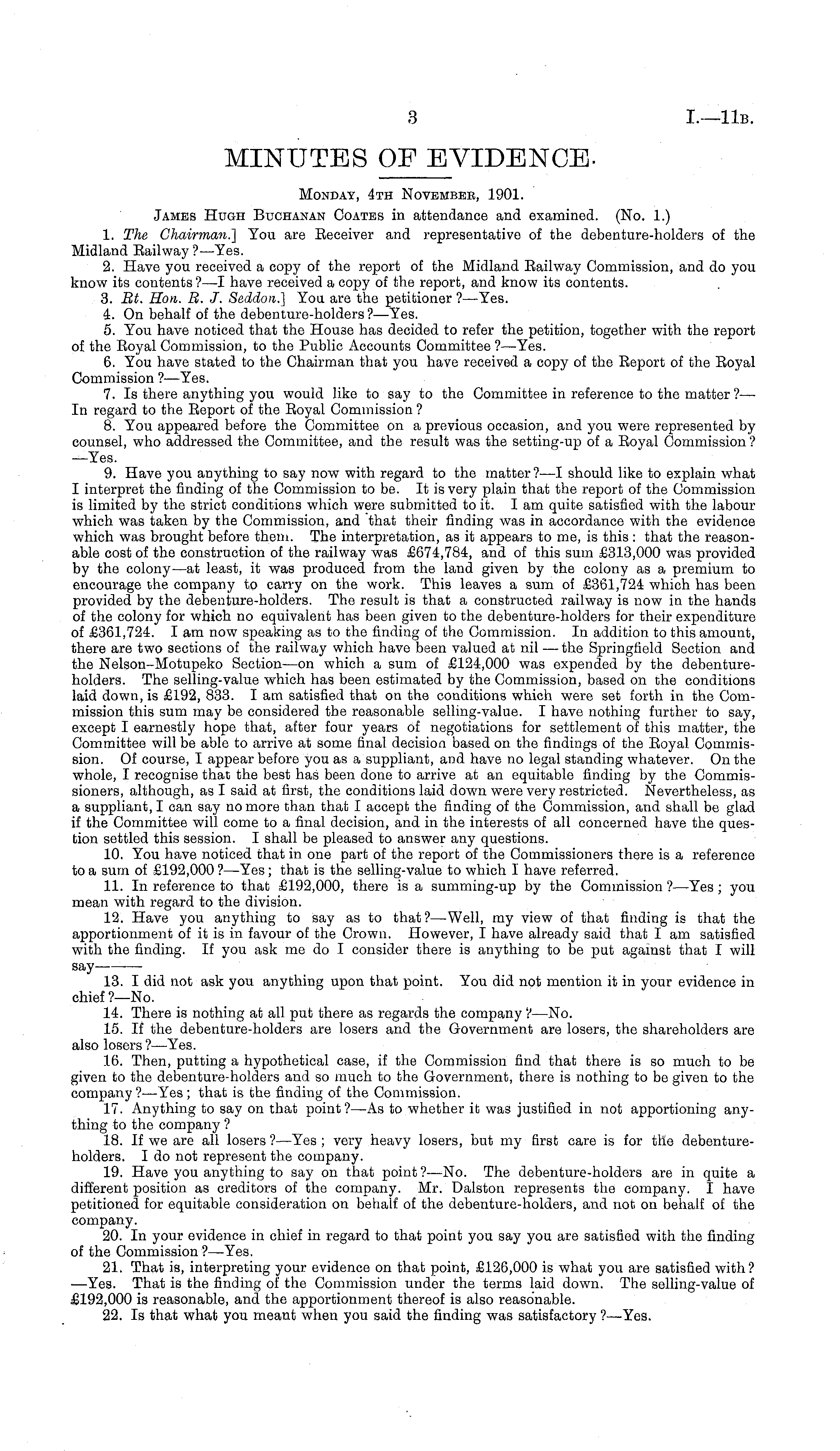 Monday, 4th Novembbe, 1901. Jambs Hugh Buchanan Coatbs in attendance and examined. (No. 1.) 1. The Chairman.] You are Eeceiver and representative of the debenture-holders of the Midland Eailway? —Yes. 2. Have you received a copy of the report of the Midland Eailway Commission, and do you know its contents ? —I have received a copy of the report, and know its contents. 3. Bt. Hon. B. J. Seddon.] You are the petitioner ? —Yes. 4. On behalf of the debenture-holders?— Yes. 5. You have noticed that the House has decided to refer the petition, together with the report of the Eoyal Commission, to the Public Accounts Committee ? —Yes. 6. You have stated to the Chairman that you have received a copy of the Eeport of the Royal Commission ? —Yes. 7. Is there anything you would like to say to the Committee in reference to the matter ?— In regard to the Eeport of the Eoyal Commission ? 8. You appeared before the Committee on a previous occasion, and you were represented by counsel, who addressed the Committee, and the result was the setting-up of a Eoyal Commission ? —Yes. 9. Have you anything to say now with regard to the matter? —I should like to explain what I interpret the finding of the Commission to be. It is very plain that the report of the Commission is limited by the strict conditions which were submitted to it. lam quite satisfied with the labour which was taken by the Commission, and that their finding was in accordance with the evidence which was brought before them. The interpretation, as it appears to me, is this : that the reasonable cost of the construction of the railway was £674,784, and of this sum £313,000 was provided by the colony—at least, it was produced, from the land given by the colony as a premium to encourage the company to carry on the work. This leaves a sum of £361,724 which has been provided by the debenture-holders. The result is that a constructed railway is now in the hands of the colony for which no equivalent has been given to the debenture-holders for their expenditure of £361,724. lam now speaking as to the finding of the Commission. In addition to this amount, there are two sections of the railway which have been valued at nil —the Springfield Section and the Nelson-Motupeko Section —on which a sum of £124,000 was expended by the debentureholders. The selling-value which has been estimated by the Commission, based on the conditions laid down, is £192, 833. lam satisfied that on the conditions which were set forth in the Commission this sum may be considered the reasonable selling-value. I have nothing further to say, except I earnestly hope that, after four years of negotiations for settlement of this matter, the Committee will be able to arrive at some final decision based on the findings of the Eoyal Commission. Of course, I appear before you as a suppliant, and have no legal standing whatever. On the whole, I recognise that the best has been done to arrive at an equitable finding by the Commissioners, although, as I said at first, the conditions laid down were very restricted. Nevertheless, as a suppliant, I can say no more than that I accept the finding of the Commission, and shall be glad if the Committee will come to a final decision, and in the interests of all concerned have the question settled this session. I shall be pleased to answer any questions. 10. You have noticed that in one part of the report of the Commissioners there is a reference to a sum of £192,000 ?—Yes ; that is the selling-value to which I have referred. 11. In reference to that £192,000, there is a summing-up by the Commission ?—Yes; you mean with regard to the division. 12. Have you anything to say as to that?— Well, my view of that finding is that the apportionment of it is in favour of the Crown. However, I have already said that I am satisfied with the finding. If you ask me do I consider there is anything to be put against that I will say 13. I did not ask you anything upon that point. You did not mention it in your evidence in chief ?—No. 14. There is nothing at all put there as regards the company ? —No. 15. If the debenture-holders are losers and the Government are losers, the shareholders are also losers ?—Yes. 16. Then, putting a hypothetical case, if the Commission find that there is so much to be given to the debenture-holders and so much to the Government, there is nothing to be given to the company?— Yes; that is the finding of the Commission. 17. Anything to say on that point?—As to whether it was justified in not apportioning anything to the company ? 18. If we are all losers ? —Yes; very heavy losers, but my first care is for trie debentureholders. Ido not represent the company. 19. Have you anything to say on that point ?—No. The debenture-holders are in quite a different position as creditors of the company. Mr. Dalston represents the company. I have petitioned for equitable consideration on behalf of the debenture-holders, and not on behalf of the company. 20. In your evidence in chief in regard to that point you say you are satisfied with the finding of the Commission ?—Yes. 21. That is, interpreting your evidence on that point, £126,000 is what you are satisfied with? —Yes. That is the finding of the Commission under the terms laid down. The selling-value of £192,000 is reasonable, and the apportionment thereof is also reasonable. 22. Is that what you meant when you said the finding was satisfactory ?—Yes.