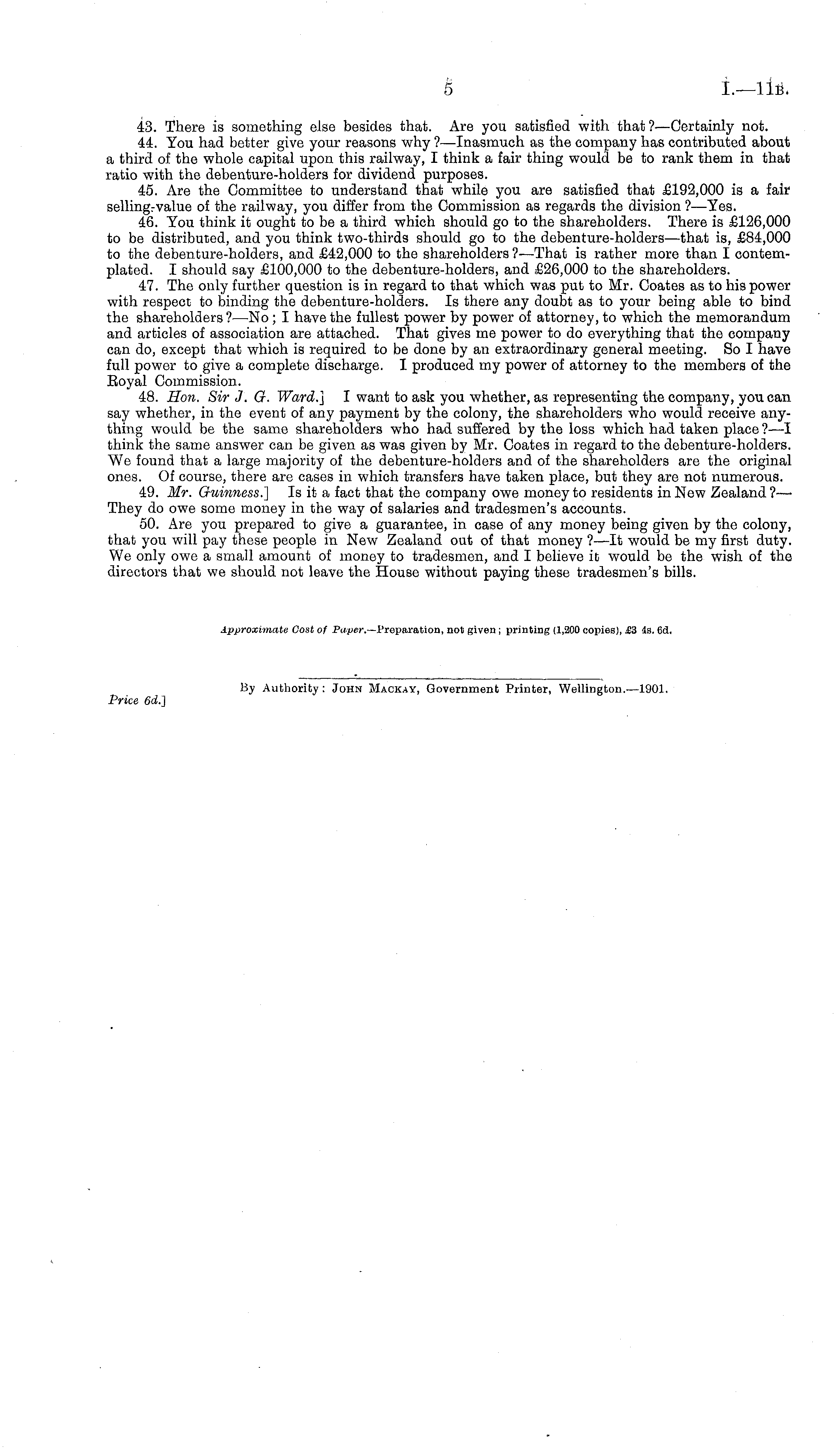 43. There is something else besides that. Are you satisfied with that ? —Certainly not. 44. You had better give your reasons why ?—lnasmuch as the company has contributed about a third of the whole capital upon this railway, I think a fair thing would be to rank them in that ratio with the debenture-holders for dividend purposes. 45. Are the Committee to understand that while you are satisfied that £192,000 is a fair sellingrvalue of the railway, you differ from the Commission as regards the division ? —Yes. 46. You think it ought to be a third which should go to the shareholders. There is £126,000 to be distributed, and you think two-thirds should go to the debenture-holders —that is, £84,000 to the debenture-holders, and £42,000 to the shareholders ?—That is rather more than I contemplated. I should say £100,000 to the debenture-holders, and £26,000 to the shareholders. 47. The only further question is in regard to that which was put to Mr. Coates as to his power with respect to binding the debenture-holders. Is there any doubt as to your being able to bind the shareholders ? —No; I have the fullest power by power of attorney, to which the memorandum and articles of association are attached. That gives me power to do everything that the company can do, except that which is required to be done by an extraordinary general meeting. So I have full power to give a complete discharge. I produced my power of attorney to the members of the Eoyal Commission. 48. Hon. Sir J. O. Ward.] I want to ask you whether, as representing the company, you can say whether, in the event of any payment by the colony, the shareholders who would receive anything would be the same shareholders who had suffered by the loss which had taken place ? —I think the same answer can be given as was given by Mr. Coates in regard to the debenture-holders. We found that a large majority of the debenture-holders and of the shareholders are the original ones. Of course, there are cases in which transfers have taken place, but they are not numerous. 49. Mr. Guinness.'] Is it a fact that the company owe money to residents in New Zealand?— They do owe some money in the way of salaries and tradesmen's accounts. 50. Are you prepared to give a guarantee, in case of any money being given by the colony, that you will pay these people in New Zealand out of that money ?—lt would be my first duty. We only owe a small amount of money to tradesmen, and I believe ie would be the wish of the directors that we should not leave the House without paying these tradesmen's bills. Approximate Cost of Paper.— Preparation, noli given; printing (1,200 copies), £3 4s. 6d.