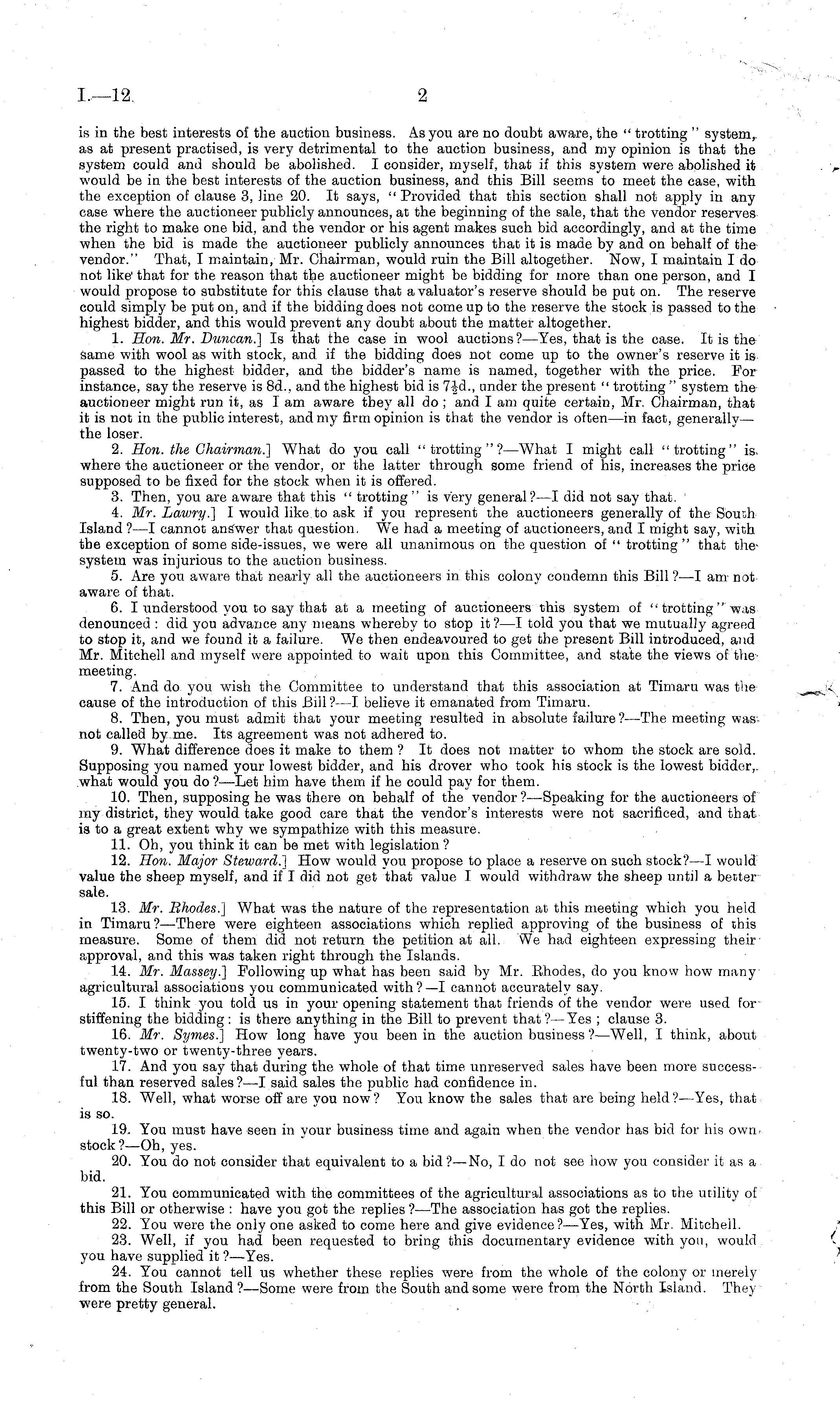 is in the best interests of the auction business. As you are no doubt aware, the " trotting " system,. as at present practised, is very detrimental to the auction business, and my opinion is that the system could and should be abolished. I consider, myself, that if this system were abolished it would be in the best interests of the auction business, and this Bill seems to meet the case, with the exception of clause 3, line 20. It says, "Provided that this section shall not apply in any case where the auctioneer publicly announces, at the beginning of the sale, that the vendor reserves the right to make one bid, and the vendor or his agent makes such bid accordingly, and at the time when the bid is made the auctioneer publicly announces that it is made by and on behalf of the vendor." That, I maintain, Mr. Chairman, would ruin the Bill altogether. Now, I maintain Ido not like that for the reason that the auctioneer might be bidding for more than one person, and I would propose to substitute for this clause that a valuator's reserve should be put on. The reserve could simply be put on, and if the bidding does not come up to the reserve the stock is passed to the highest bidder, and this would prevent any doubt about the matter altogether. 1. Hon. Mr. Duncan.] Is that the case in wool auctions?— Yes, that is the case. It is the Same with wool as with stock, and if the bidding does not come up to the owner's reserve it is passed to the highest bidder, and the bidder's name is named, together with the price. For instance, say the reserve is Bd., and the highest bid is 7fd., under the present " trotting " system the auctioneer might run it, as I am aware they all do ; and I am quite certain, Mr. Chairman, that it is not in the public interest, and my firm opinion is that the vendor is often —in fact, generally— the loser. 2. Hon. the Chairman.] What do you call "trotting"?— What I might call "trotting" is. where the auctioneer or the vendor, or the latter through some friend of his, increases the price supposed to be fixed for the stock when it is offered. 3. Then, you are aware that this " trotting" is very general?—l did not say that. 4. Mr. Lawry.] I would like to ask if you represent the auctioneers generally of the South Island ?—I cannot answer that question. W T e had a meeting of auctioneers, and I might say, with the exception of some side-issues, we were all unanimous on the question of " trotting" that thesystem was injurious to the auction business. 5. Are you aware that nearly all the auctioneers in this colony condemn this Bill ?—I am notaware of that. 6. I understood you to say that at a meeting of auctioneers this system of " trotting " was denounced : did you advance any means whereby to stop it ? —I told you that we mutually agreed to stop it, and we found it a failure. We then endeavoured to get the present Bill introduced, and Mr. Mitchell and myself were appointed to wait upon this Committee, and state the views of the meeting. 7. And do you wish the Committee to understand that this association at Timaru was the cause of the introduction of this Bill ? —I believe it emanated from Timaru. 8. Then, you must admit that your meeting resulted in absolute failure ?—The meeting wasnot called by me. Its agreement was not adhered to. 9. What difference does it make to them ? It does not matter to whom the stock are sold. Supposing you named your lowest bidder, and his drover who took his stock is the lowest bidder, what would you do ? —Let him have them if he could pay for them. 10. Then, supposing he was there on behalf of the vendor ?—Speaking for the auctioneers of my district, they would take good care that the vendor's interests were not sacrificed, and that is to a great extent why we sympathize with this measure. 11. Oh, you think it can be met with legislation? 12. Hon. Major Steward.] How would you propose to place a reserve on such stock?—l would value the sheep myself, and if I did not get that value I would withdraw the sheep until a better sale. 13. Mr. Bhodes.\ What was the nature of the representation at this meeting which you heid in Timaru?—There were eighteen associations which replied approving of the business of this measure. Some of them did not return the petition at all. We had eighteen expressing their approval, and this was taken right through the Islands. 14. Mr. Massey.] Following up what has been said by Mr. Bhodes, do you know how many agricultural associations you communicated with ? —I cannot accurately say. 15. I think you told us in your opening statement that friends of the vendor were used for stiffening the bidding: is there anything in the Bill to prevent that ?—Yes ; clause 3. 16. Mr. Symes.] How long have you been in the auction business ?—Well, I think, about twenty-two or twenty-three years. 17. And you say that during the whole of that time unreserved sales have been more successful than reserved sales?—l said sales the public had confidence in. 18. Well, what worse off are you now ? You know the sales that are being held ?—Yes, that is so. 19. You must have seen in your business time and again when the vendor has bid for his own stock?—Oh, yes. 20. You do not consider that equivalent to a bid?—No, I do not see how you consider it as a bid. 21. You communicated with the committees of the agricultural associations as to the utility of this Bill or otherwise : have you got the replies ?—The association has got the replies. 22. You were the only one asked to come here and give evidence? —Yes, with Mr. Mitchell. 23. Well, if you had been requested to bring this documentary evidence with you, would you have supplied it ?—Yes. 24. You cannot tell us whether these replies were from the whole of the colony or merely from the South Island ?—Some were from the South and some were from the North Island. They were pretty general.