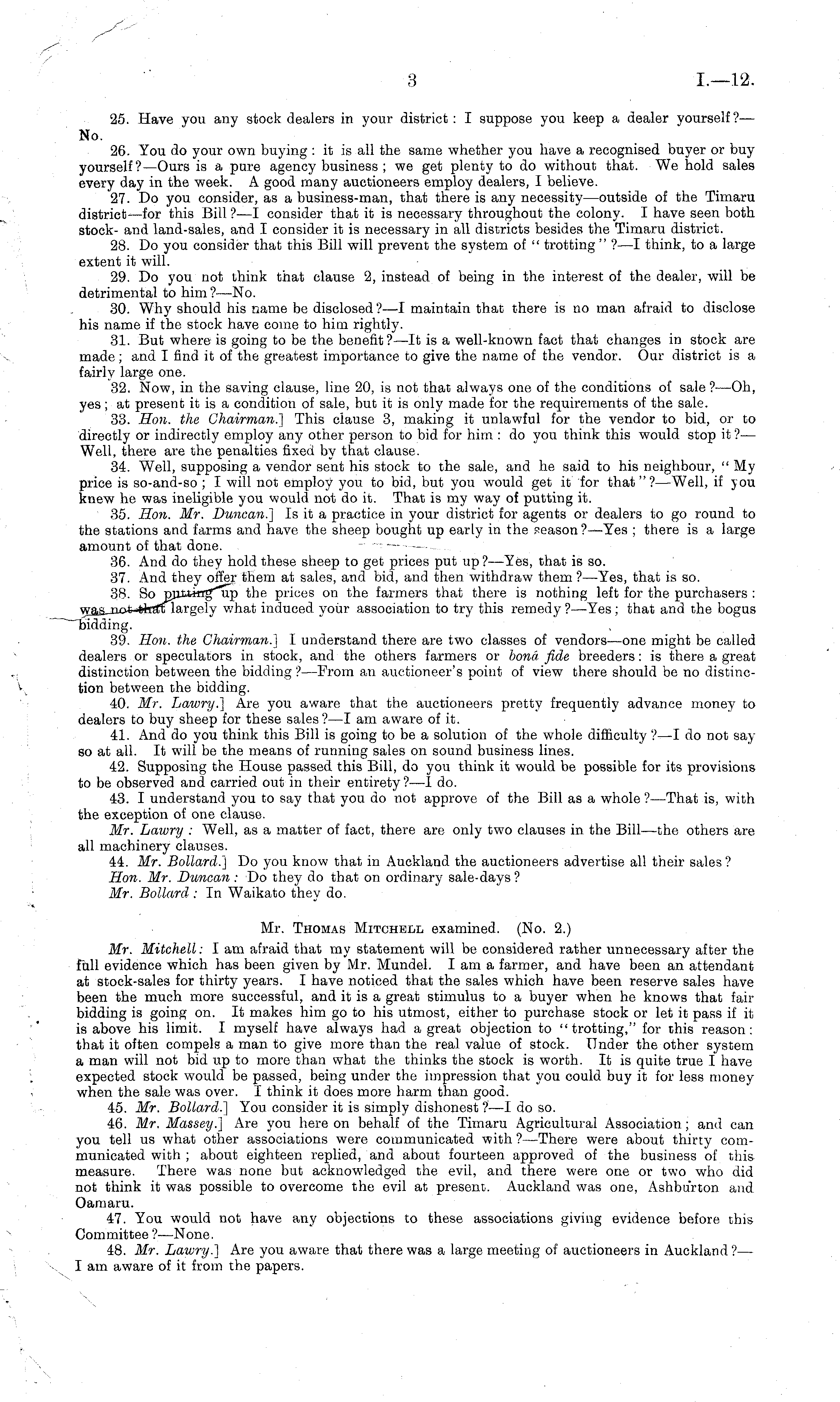 25. Have you any stock dealers in your district: I suppose you keep a dealer yourself? — No. 26. You do your own buying : it is all the same whether you have a recognised buyer or buy yourself? —Ours is a pure agency business ; we get plenty to do without that. We hold sales every day in the week. A good many auctioneers employ dealers, I believe. 27. Do you consider, as a business-man, that there is any necessity—outside of the Timaru district —for this Bill ? —I consider that it is necessary throughout the colony. I have seen both stock- and land-sales, and I consider it is necessary in all districts besides the Timaru district. 28. Do you consider that this Bill will prevent the system, of " trotting " ?—I think, to a large extent it will. 29. Do you not think that clause 2, instead of being in the interest of the dealer, will be detrimental to him ? —No. 30. Why should his name be disclosed ?—I maintain that there is no man afraid to disclose his name if the stock have come to him rightly. 31. But where is going to be the benefit?—lt is a well-known fact that changes in stock are made ; and I find it of the greatest importance to give the name of the vendor. Our district is a fairly large one. 32. Now, in the saving clause, line 20, is not that always one of the conditions of sale ? —Oh, yes; at present it is a condition of sale, but it is only made for the requirements of the sale. 33. Hon. the Chairman.] This clause 3, making it unlawful for the vendor to bid, or to directly or indirectly employ any other person to bid for him : do you think this would stop it ?— Well, there are the penalties fixed by that clause. 34. Well, supposing a vendor sent his stock to the sale, and he said to his neighbour, " My price is so-and-so ; I will not employ you to bid, but you would get it for that"? —Well, if you knew he was ineligible you would not do it. That is my way of putting it. 35. Hon. Mr. Duncan.] Is it a practice in your district for agents or dealers to go round to the stations and farms and have the sheep bought up early in the season ? —Yes ; there is a large amount of that done. 36. And do they hold these sheep to get prices put up ?—Yes, that is so. 37. And they offer them at sales, and bid, and then withdraw them ?—Yes, that is so. 38. So putting up the prices on the farmers that there is nothing left for the purchasers : wasJ">*-tha"t largely what induced your association to try this remedy?— Yes; that and the bogus bidding. 39. Hon. the Chairman.] I understand there are two classes of vendors—one might be called dealers or speculators in stock, and the others farmers or bona fide breeders: is there a great distinction between the bidding ?—From an auctioneer's point of view there should be no distinction between the bidding. 40. Mr. Lawry.] Are you aware that the auctioneers pretty frequently advance money to dealers to buy sheep for these sales ?—I am aware of it. 41. And do you think this Bill is going to be a solution of the whole difficulty ?—I do not sayso at all. It will be the means of running sales on sound business lines. 42. Supposing the House passed this Bill, do you think it would be possible for its provisions to be observed and carried out in their entirety? —I do. 43. I understand you to say that you do not approve of the Bill as a whole ?—That is, with the exception of one clause. Mr. Lawry : Well, as a matter of fact, there are only two clauses in the Bill—the others are all machinery clauses. 44. Mr. Bollard.] Do you know that in Auckland the auctioneers advertise all their sales ? Hon. Mr. Duncan : Do they do that on ordinary sale-days? Mr. Bollard : In Waikato they do. Mr. Thomas Mitchell examined. (No. 2.) Mr. Mitchell: lam afraid that my statement will be considered rather unnecessary after the full evidence which has been given by Mr. Mundel. lam a farmer, and have been an attendant at stock-sales for thirty years. I have noticed that the sales which have been reserve sales have been the much more successful, and it is a great stimulus to a buyer when he knows that fair bidding is going on. It makes him go to his utmost, either to purchase stock or let it pass if it is above his limit. I myself have always had a great objection to "trotting," for this reason: that it often compels a man to give more than the real value of stock. Under the other system a man will not bid up to more than what the thinks the stock is worth. It is quite true I have expected stock would be passed, being under the impression that you could buy it for less money when the sale was over. I think it does more harm than good. 45. Mr. Bollard.] You consider it is simply dishonest ? —I do so. 46. Mr. Massey.] Are you here on behalf of the Timaru Agricultural Association; and can you tell us what other associations were communicated with ?—There were about thirty communicated with ; about eighteen replied, and about fourteen approved of the business of this measure. There was none but acknowledged the evil, and there were one or two who did not think it was possible to overcome the evil at present. Auckland was one, Ashburton and Oamaru. 47. You would not have any objections to these associations giving evidence before this Committee ?—None. 48. Mr. Lawry.] Are you aware that there was a large meeting of auctioneers in Auckland ?— I am aware of it from the papers.